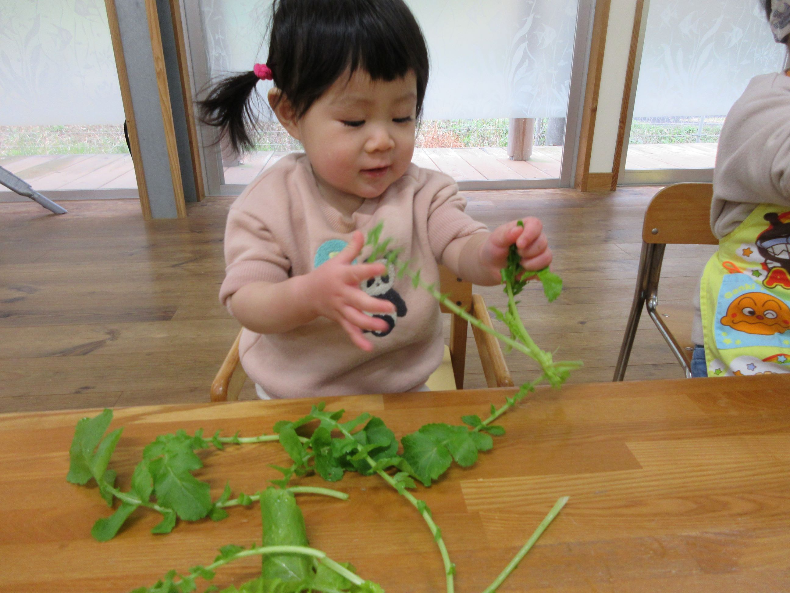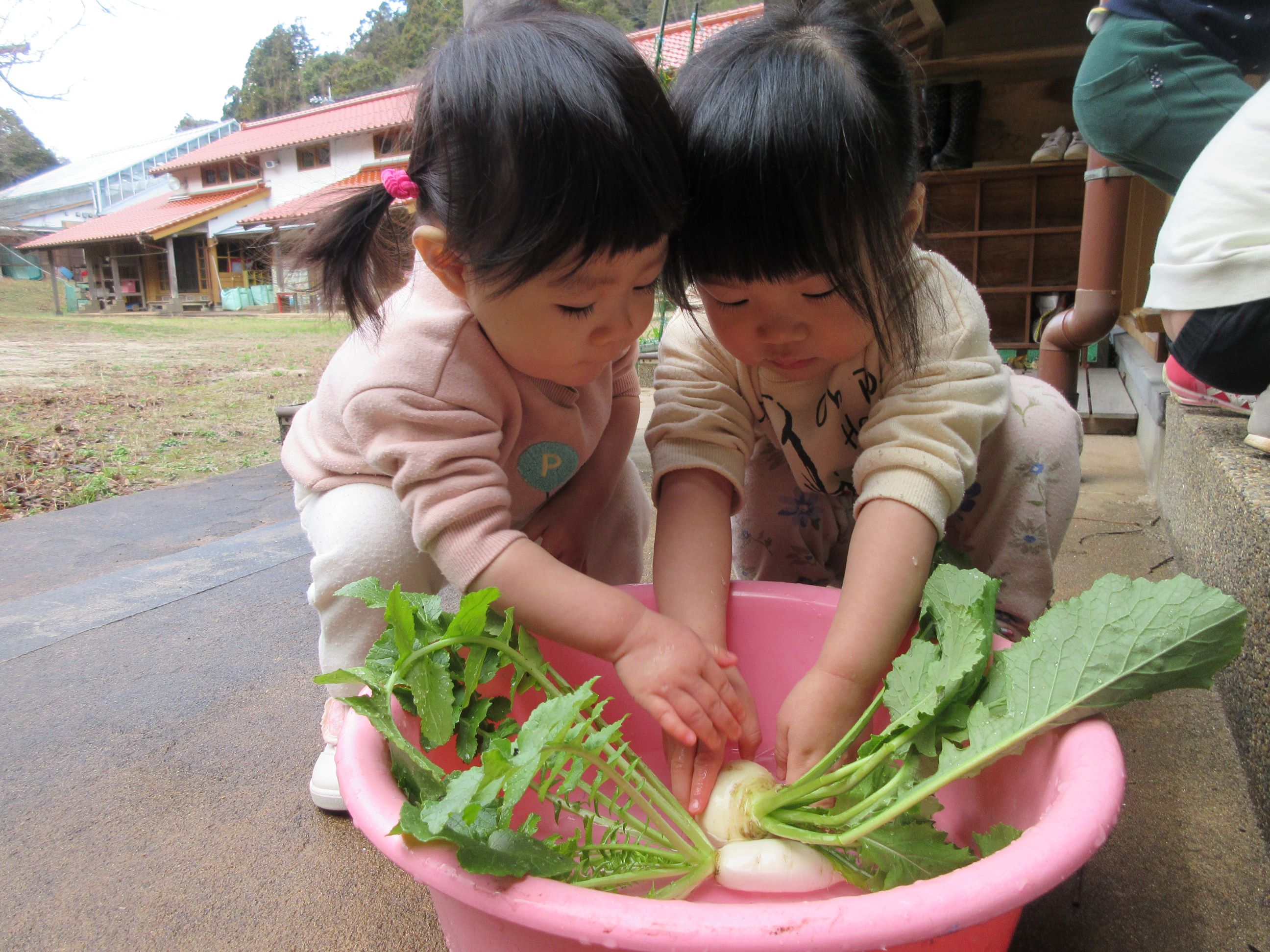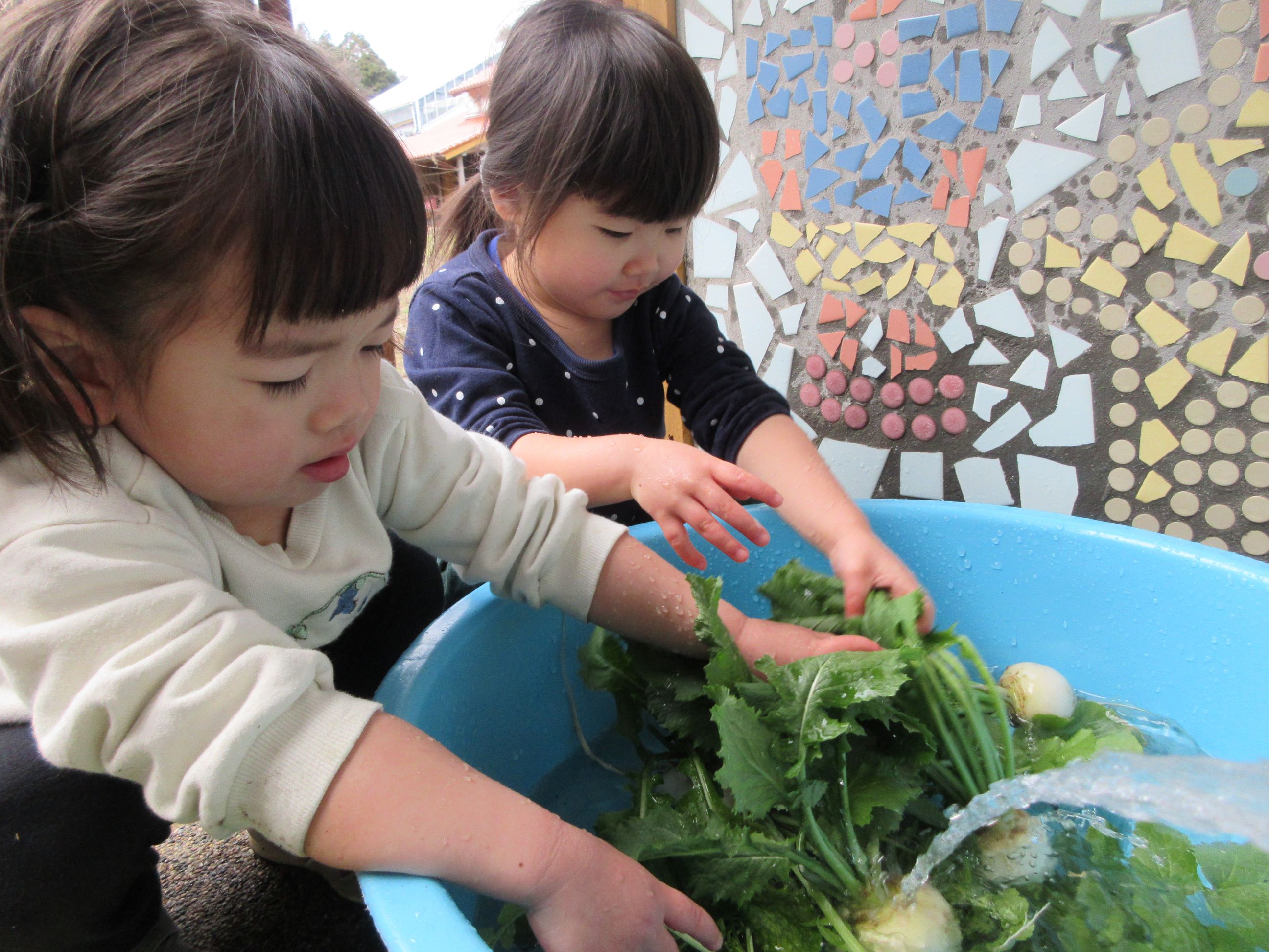 雨のしずくが付いた野菜を抜くと、水がかかり「つめたーい」と言いながらも、楽しそうに収穫していました。野菜を洗う水は冷たかったのですが、きれいに洗うことができました。