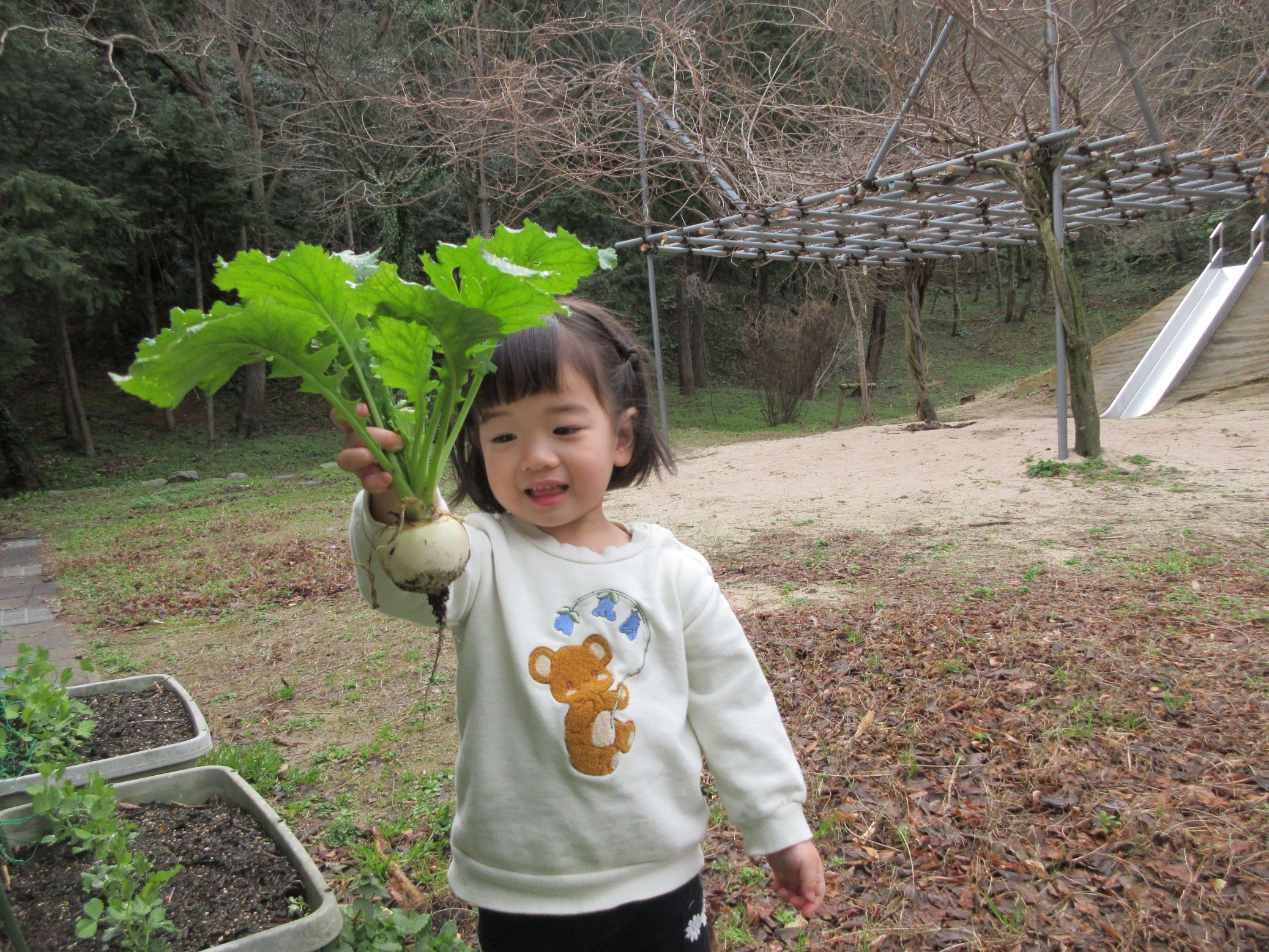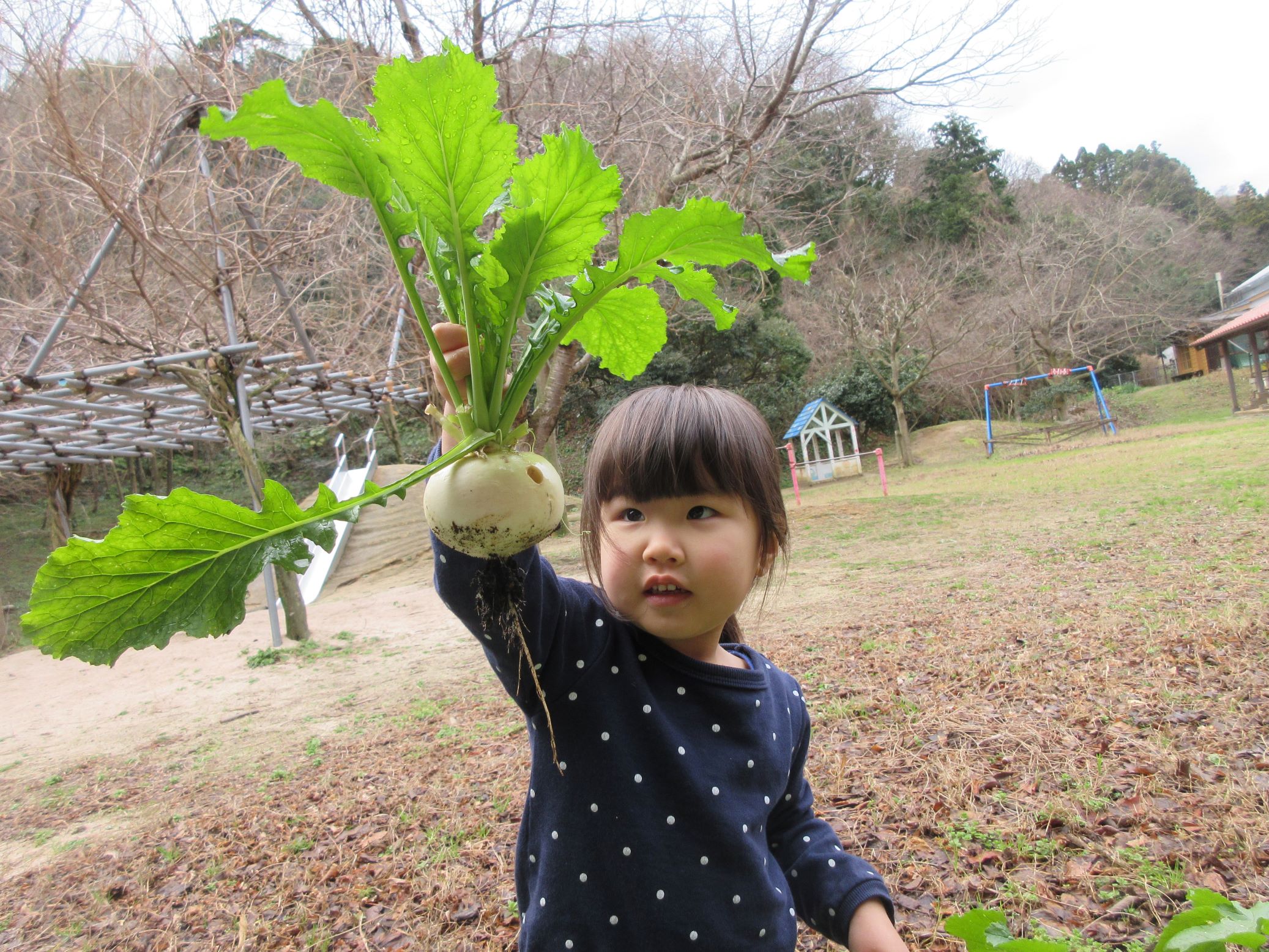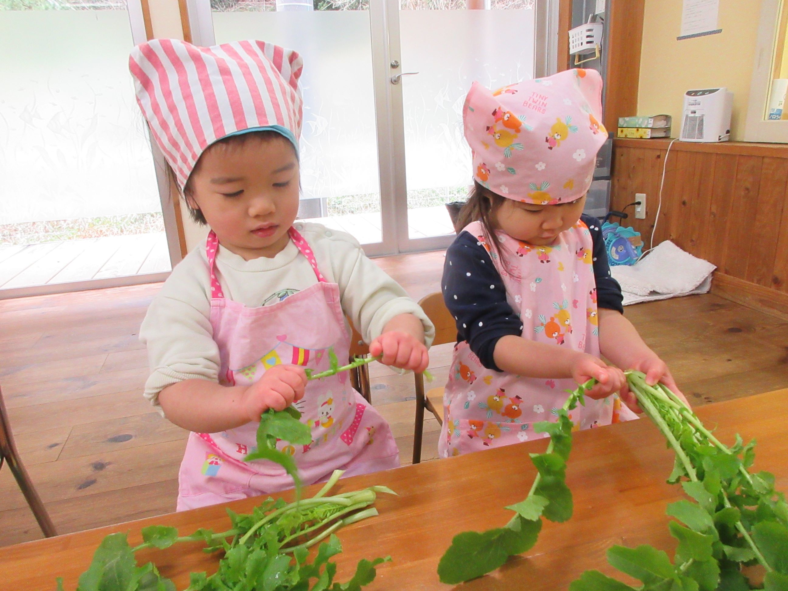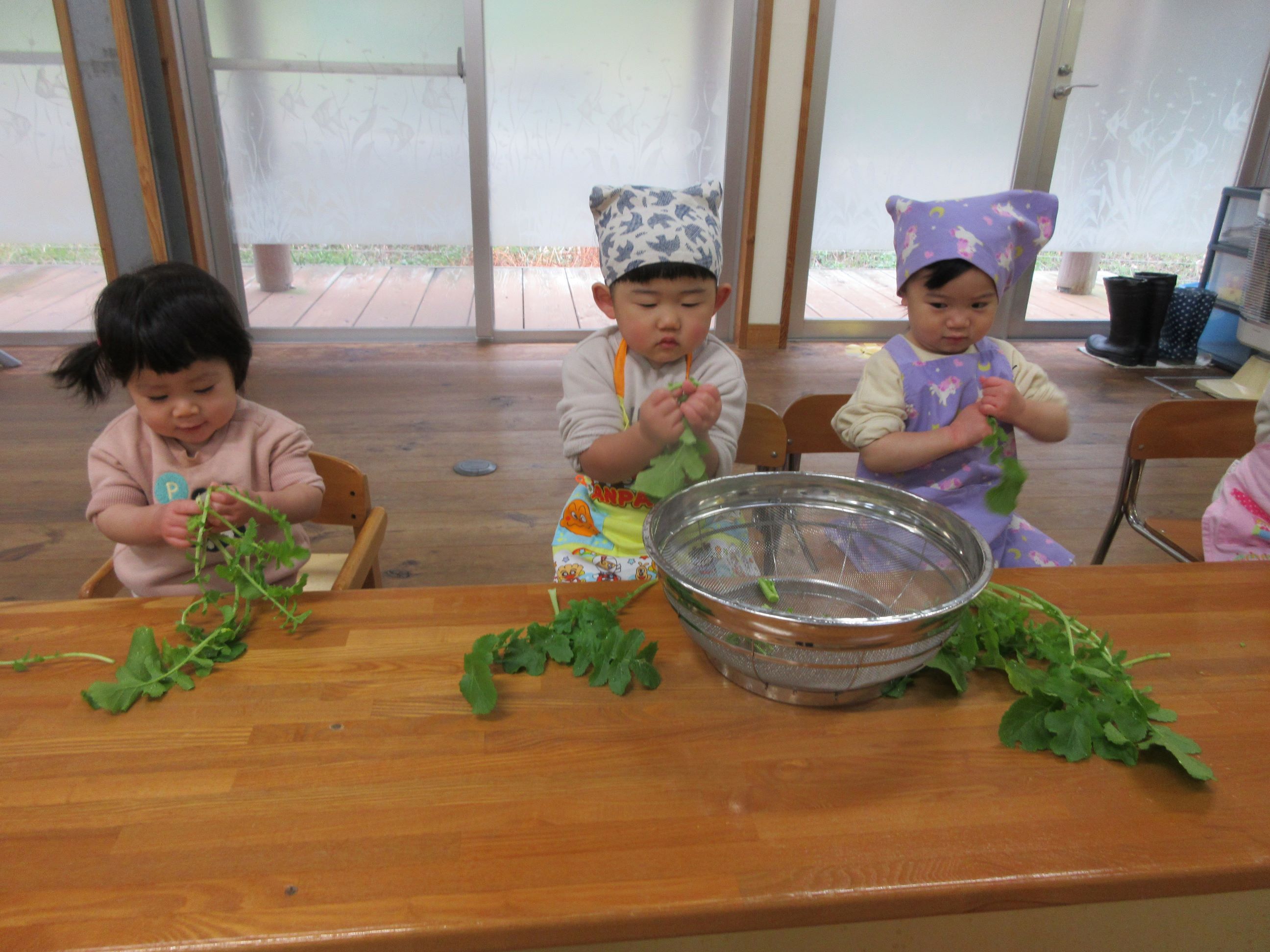 雨のしずくが付いた野菜を抜くと、水がかかり「つめたーい」と言いながらも、楽しそうに収穫していました。野菜を洗う水は冷たかったのですが、きれいに洗うことができました。