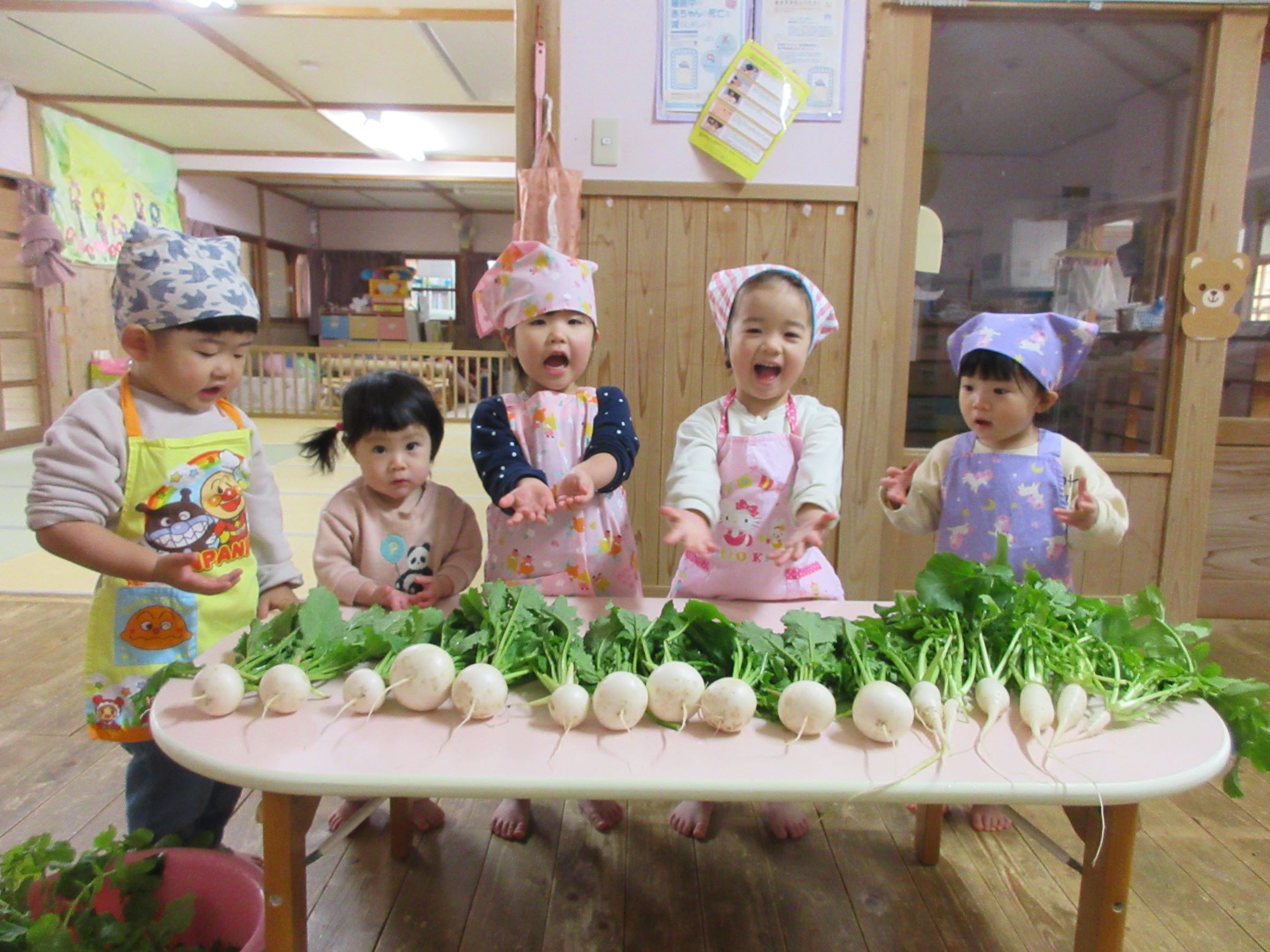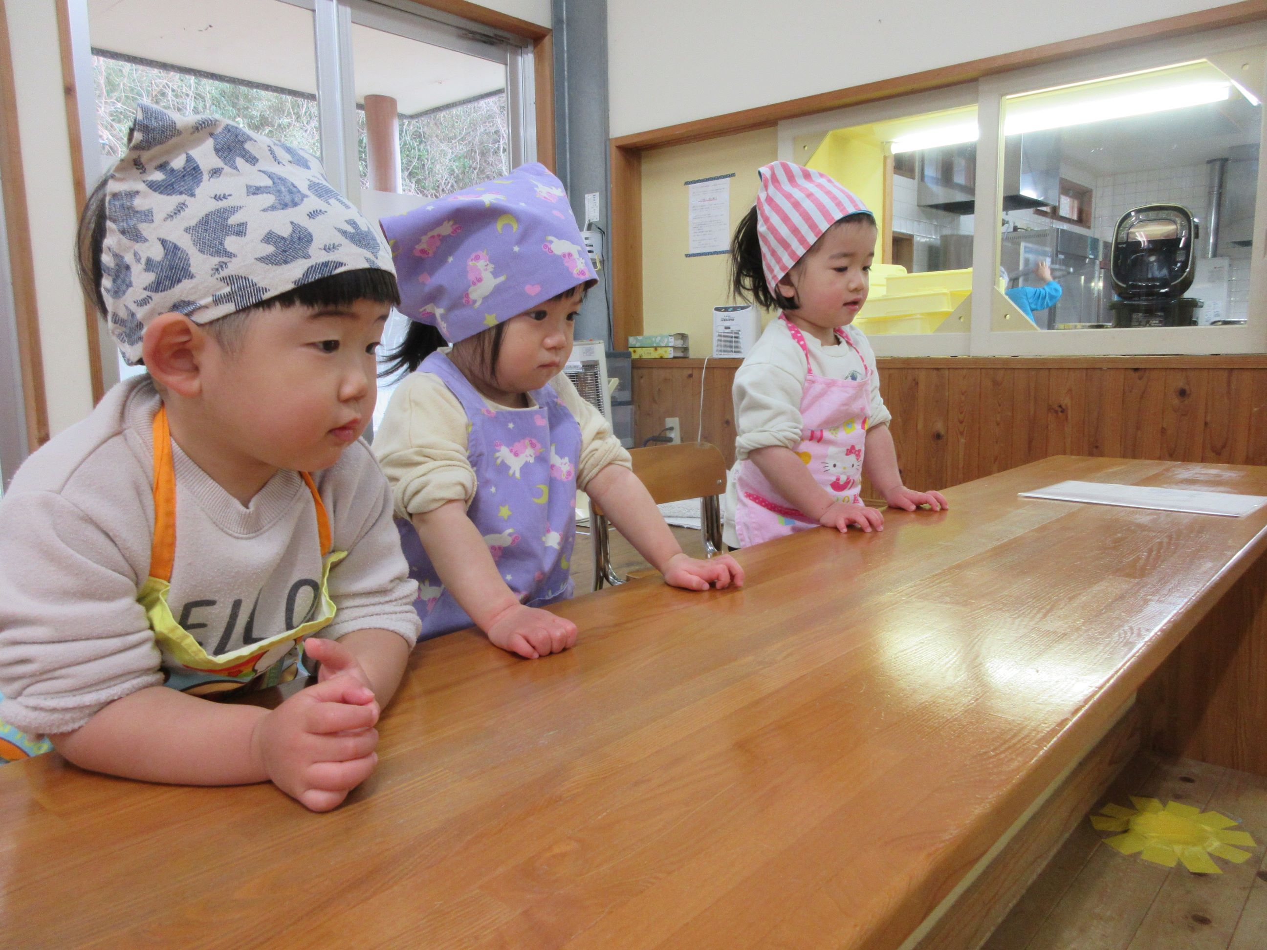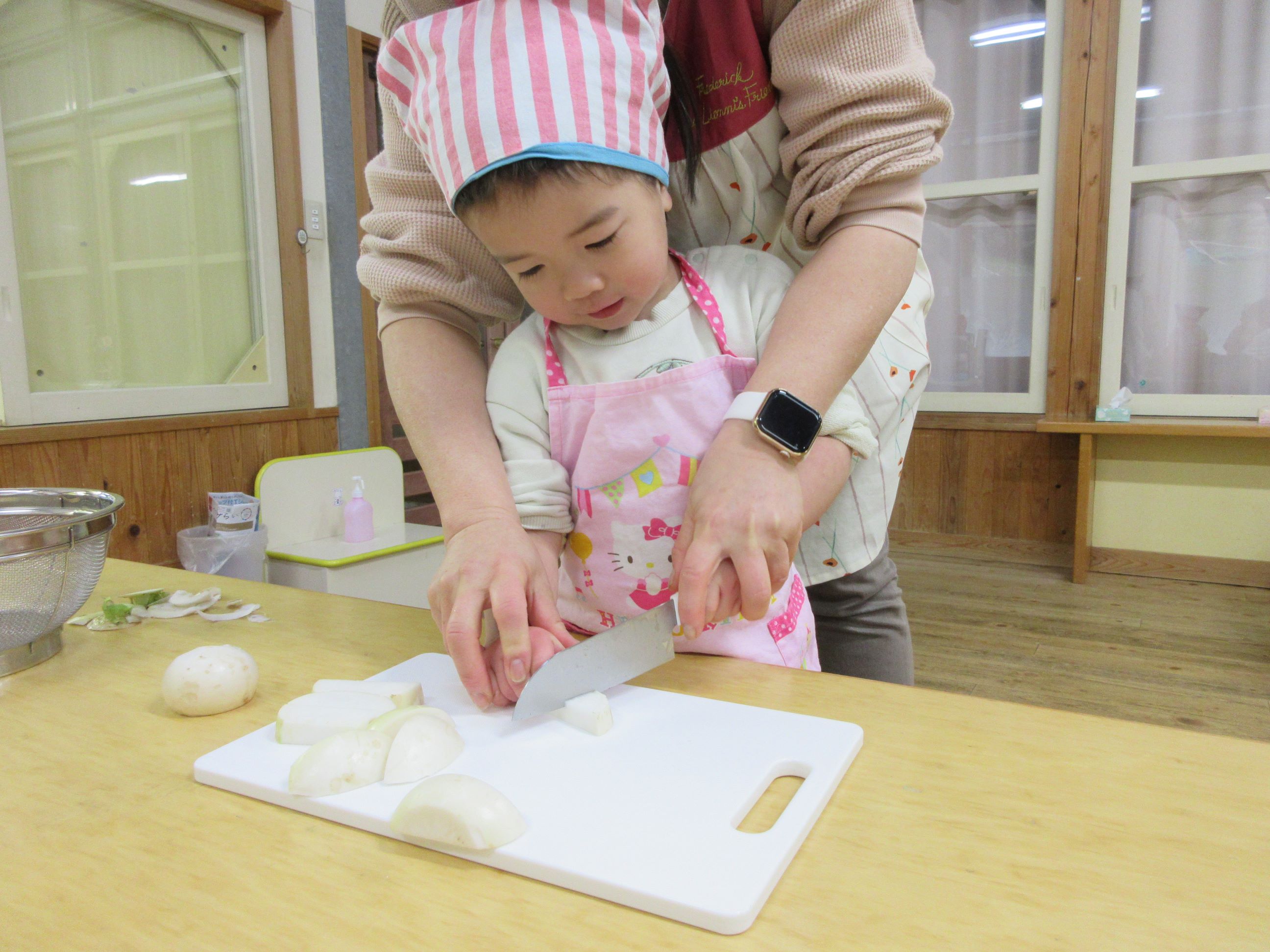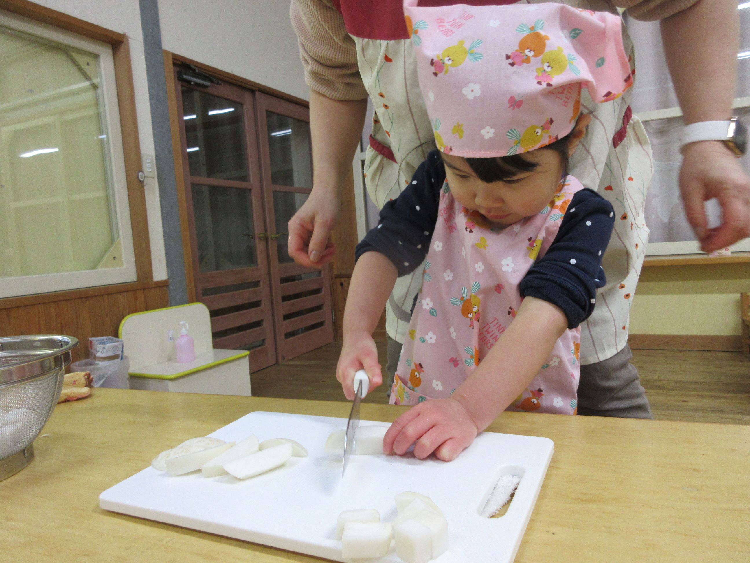 2歳児は、担任に手を添えてもらい、包丁で野菜を切ってみました。持ち方を知らせると、ぎゅっと握って慎重に切っていきました。0,1歳児はその様子をじーっと見つめていました。