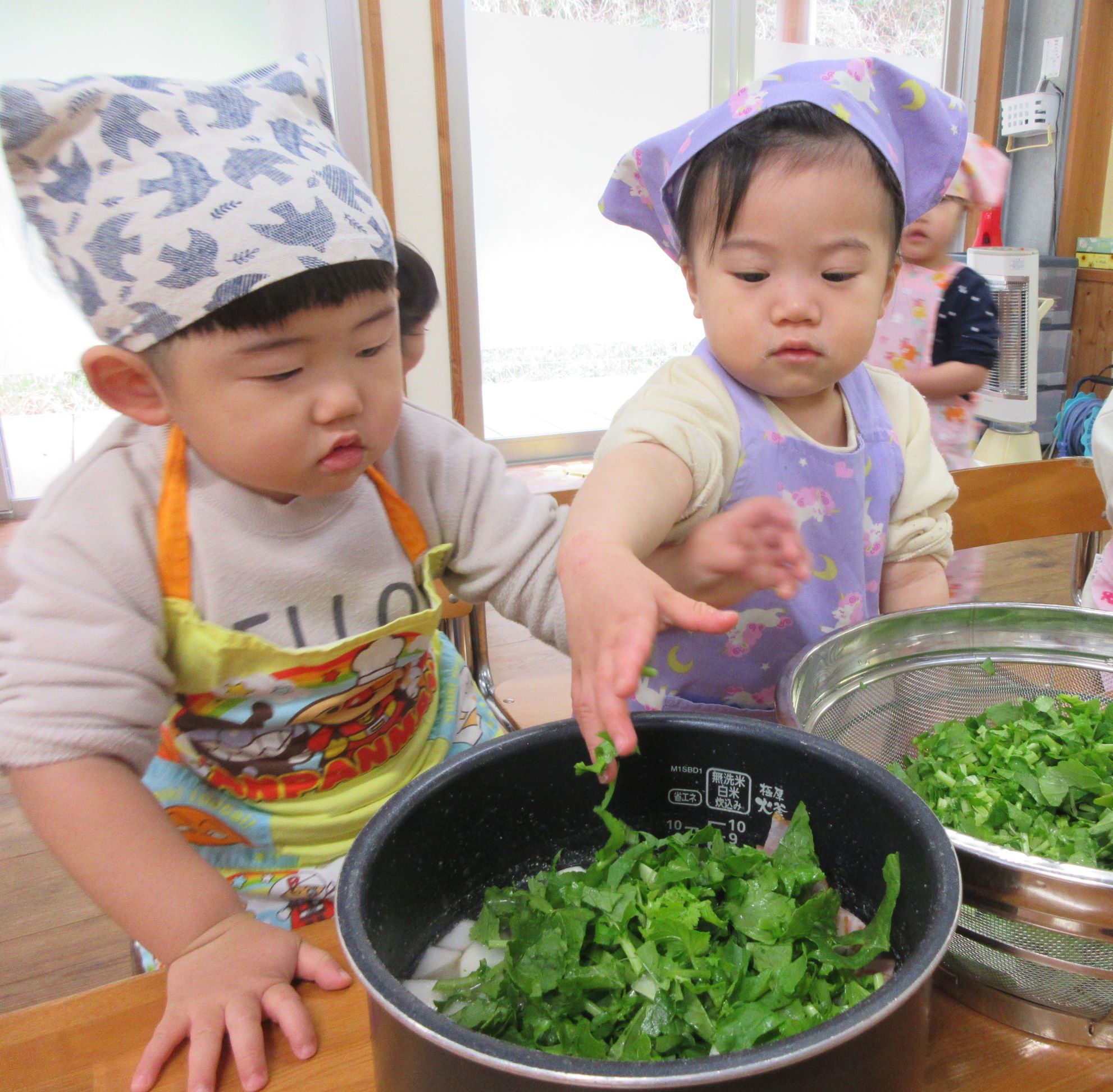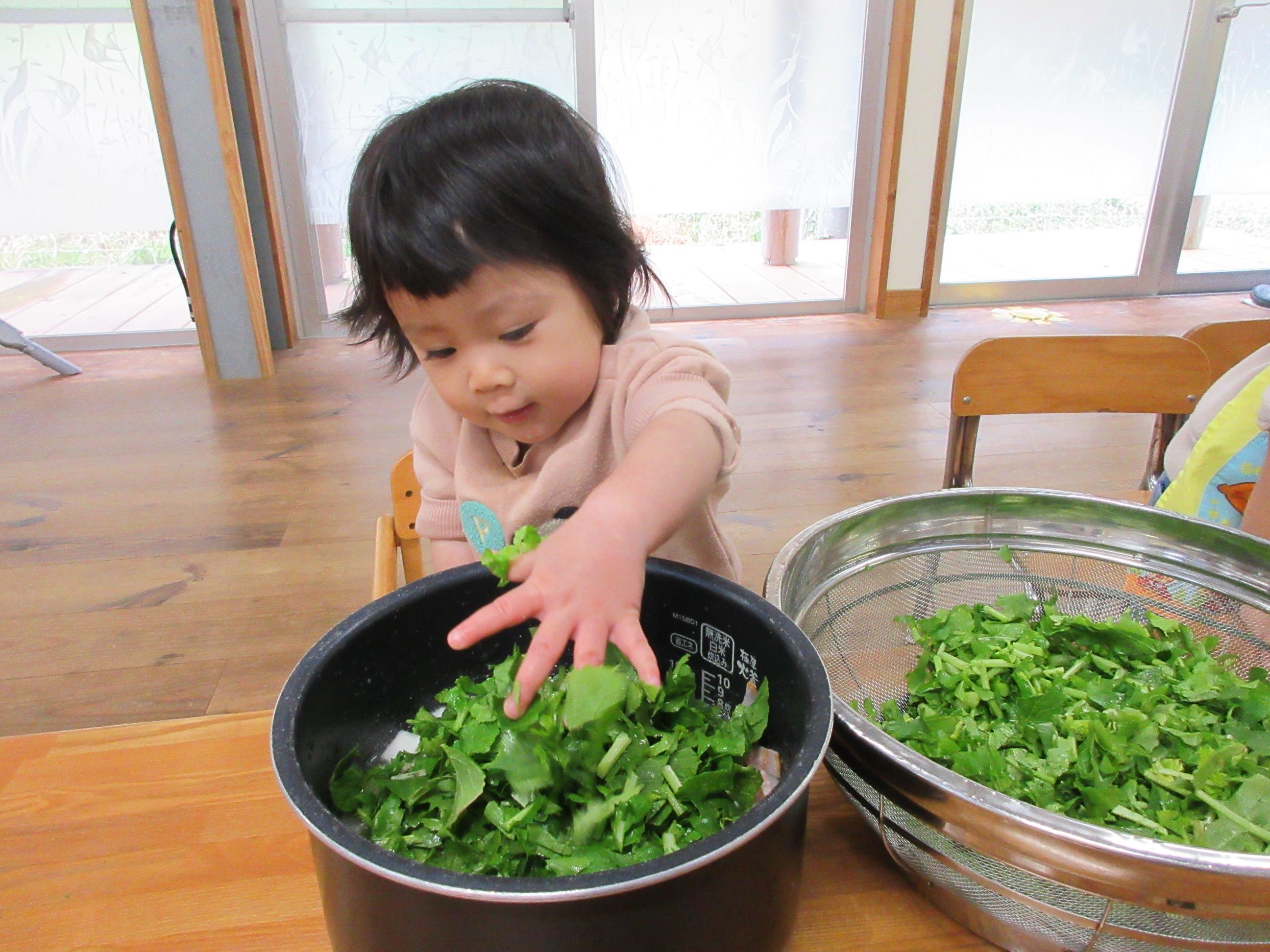 みんなで葉をちぎり、釜に材料を入れて出来上がりを待ちました。
