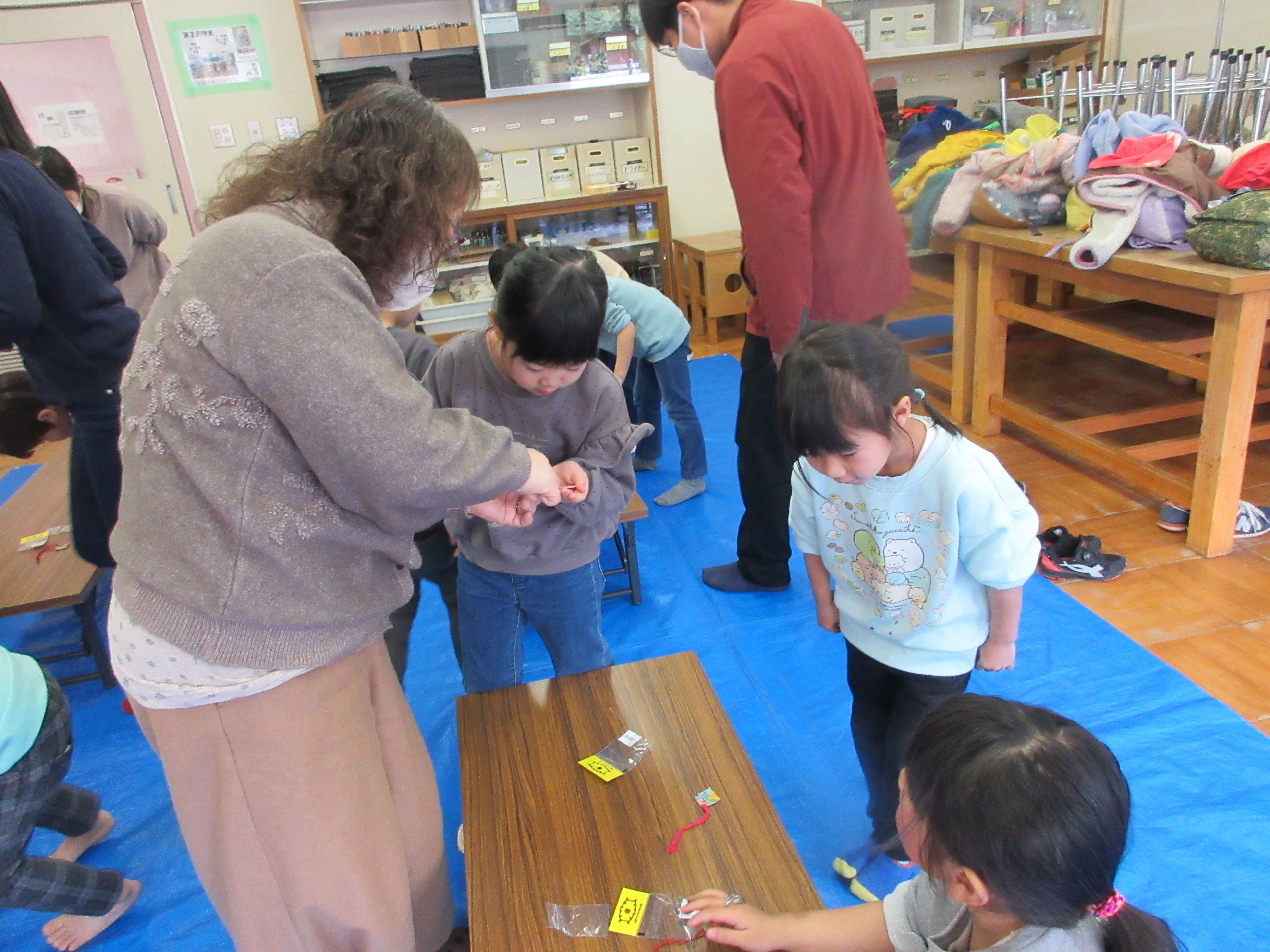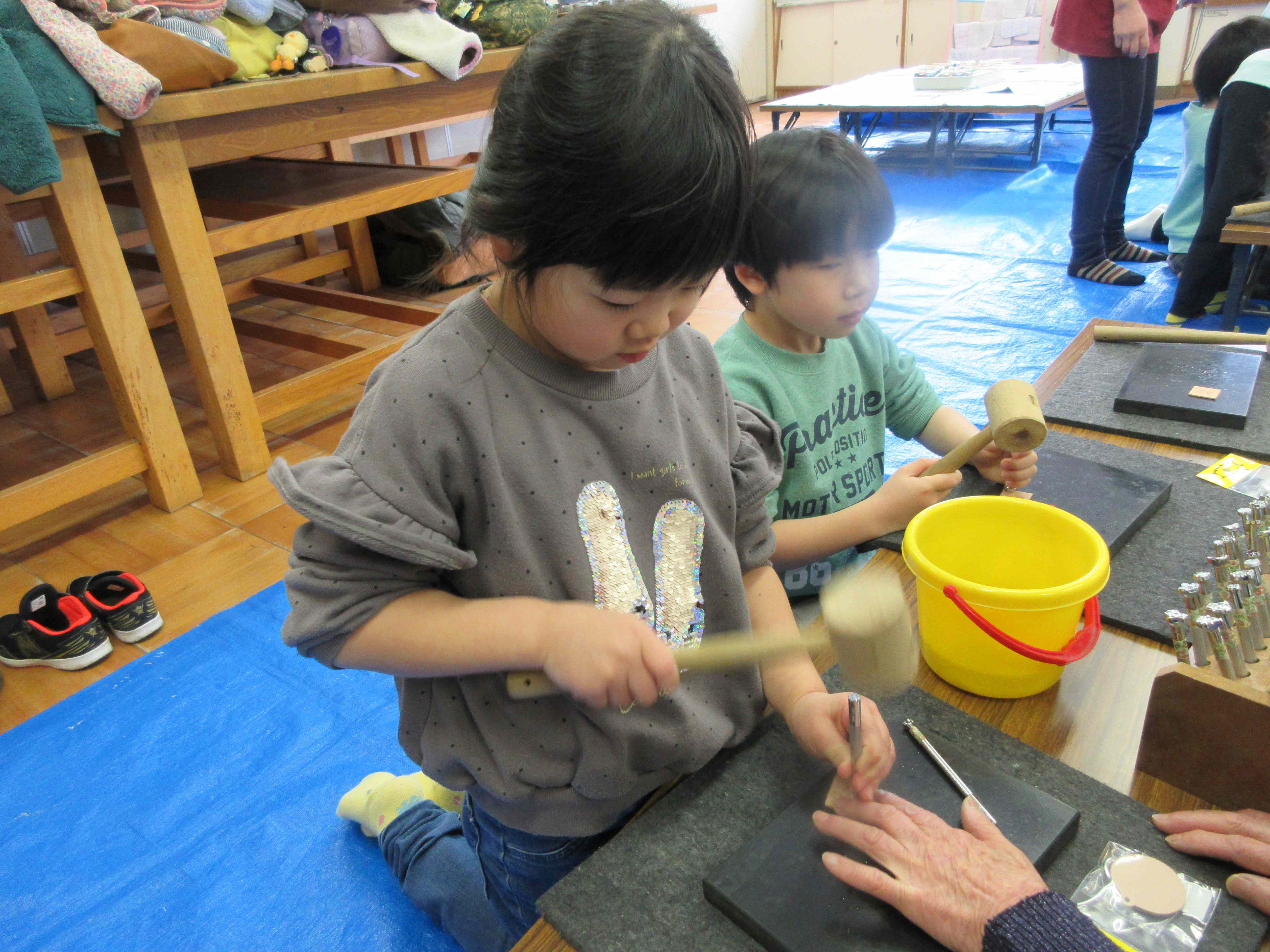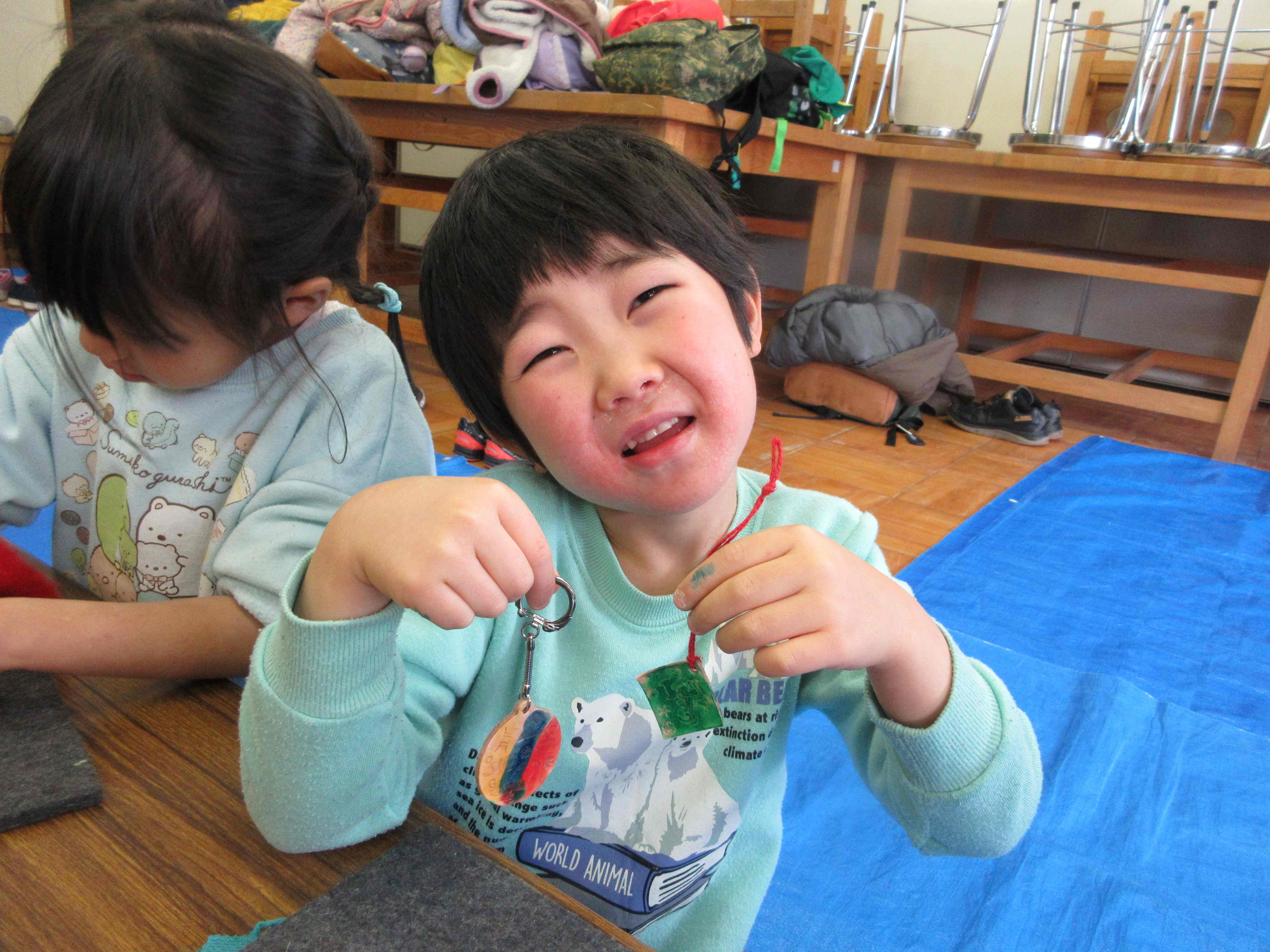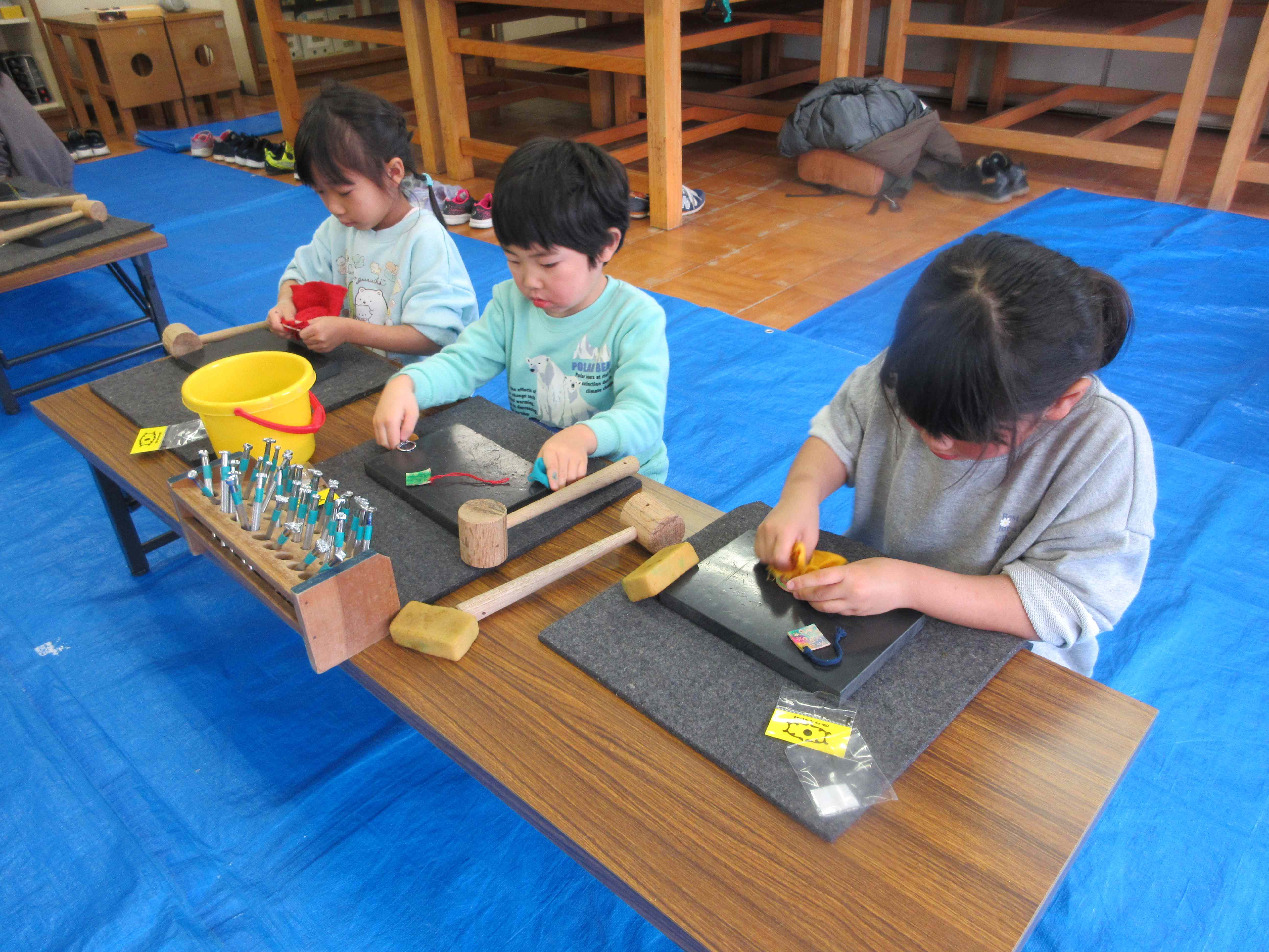 マリン保育所のくじら組さんと、今年度最後の5歳児交流をしました。午前中のレザークラフト体験では、好きな押し型を選んで打ちつけたり、色を塗ったりして、世界に一つだけのキーホルダーが出来ました。「わたしはランドセルにつける」「おでかけのかばんにつけようかな」と、嬉しそうな声があちこちで聞こえました。カレーセットを食べ終えてから、午後は戸外に出てクレヨン探検をしました。2,3人で1チームとなり「こっちじゃない?」「ここにこれがあるから・・・」などマップを頼りにチーム内で話をしたり、鳥の鳴き声や踏切の音に気付いて耳を澄ませたりしながら、シールの入った宝箱を探していました。笑顔があちこちで見られ、楽しい交流となりました。