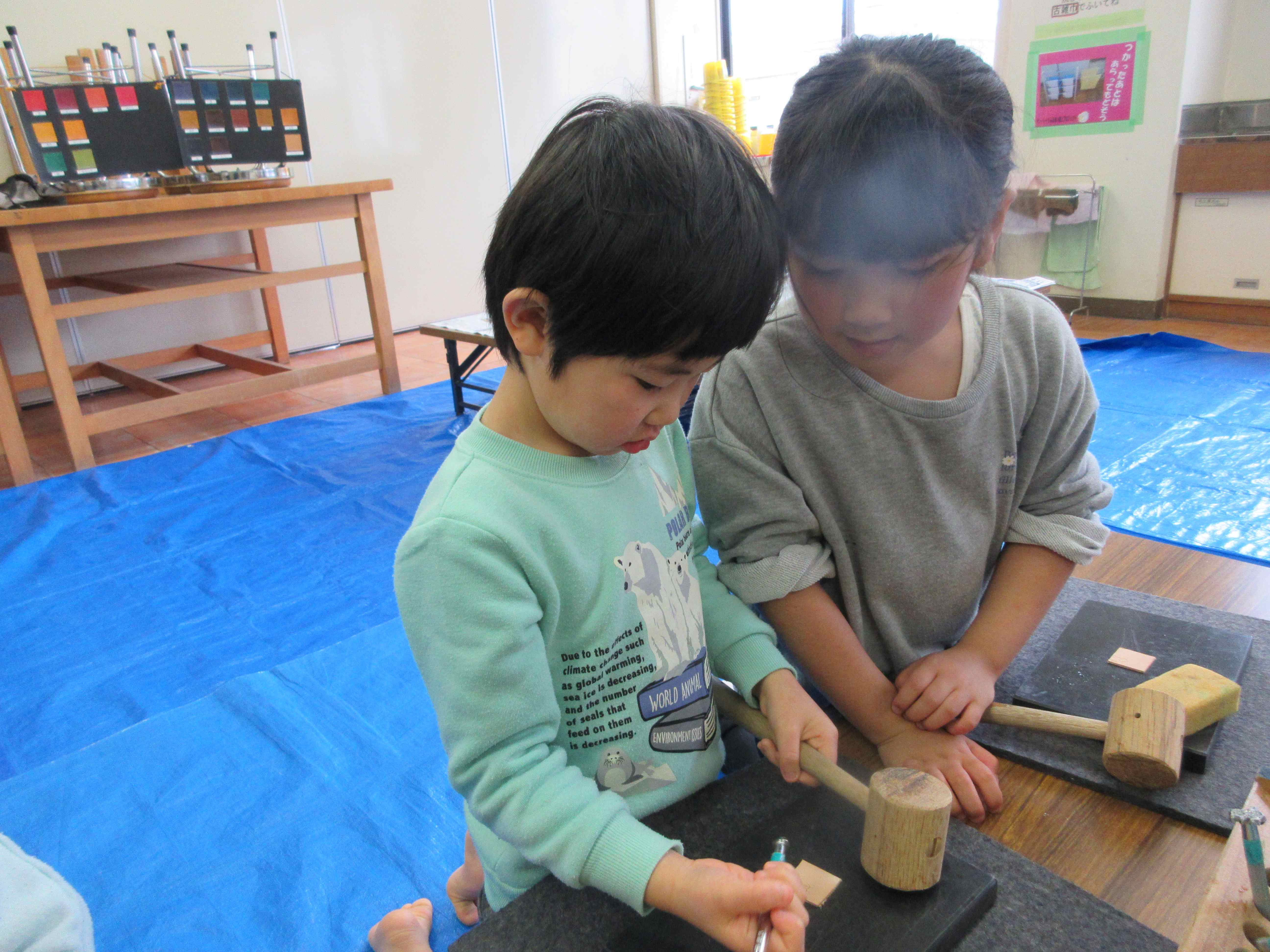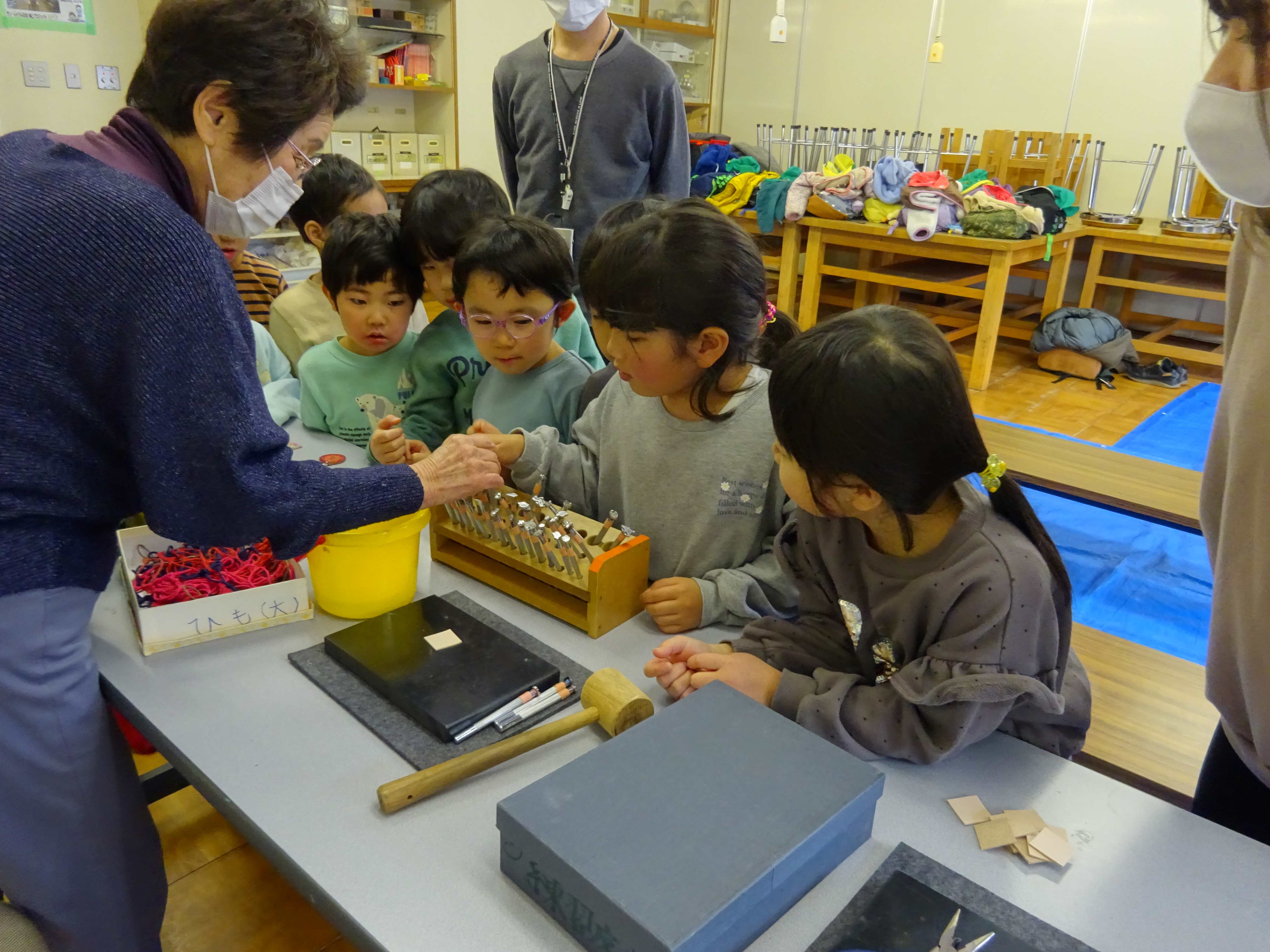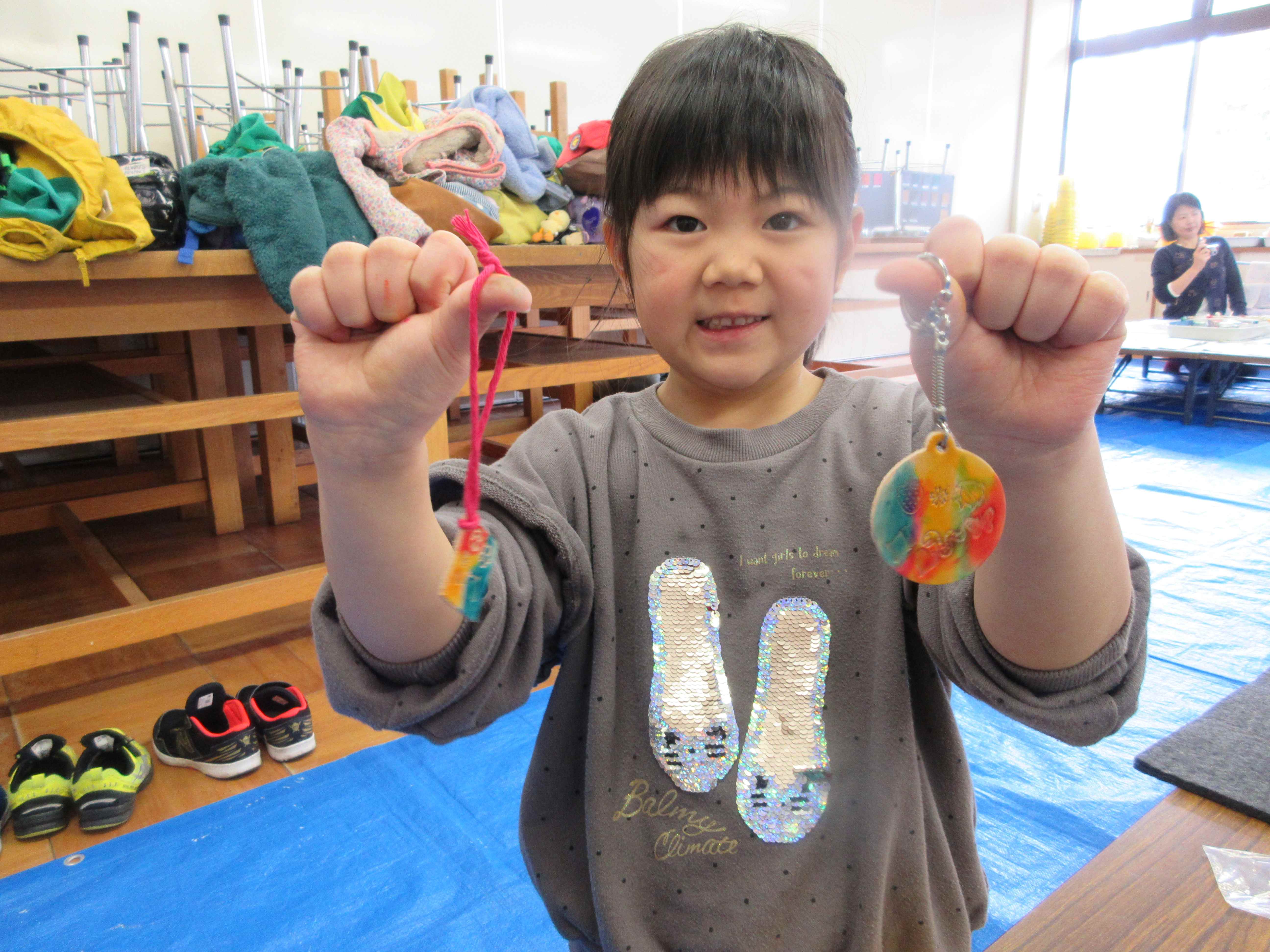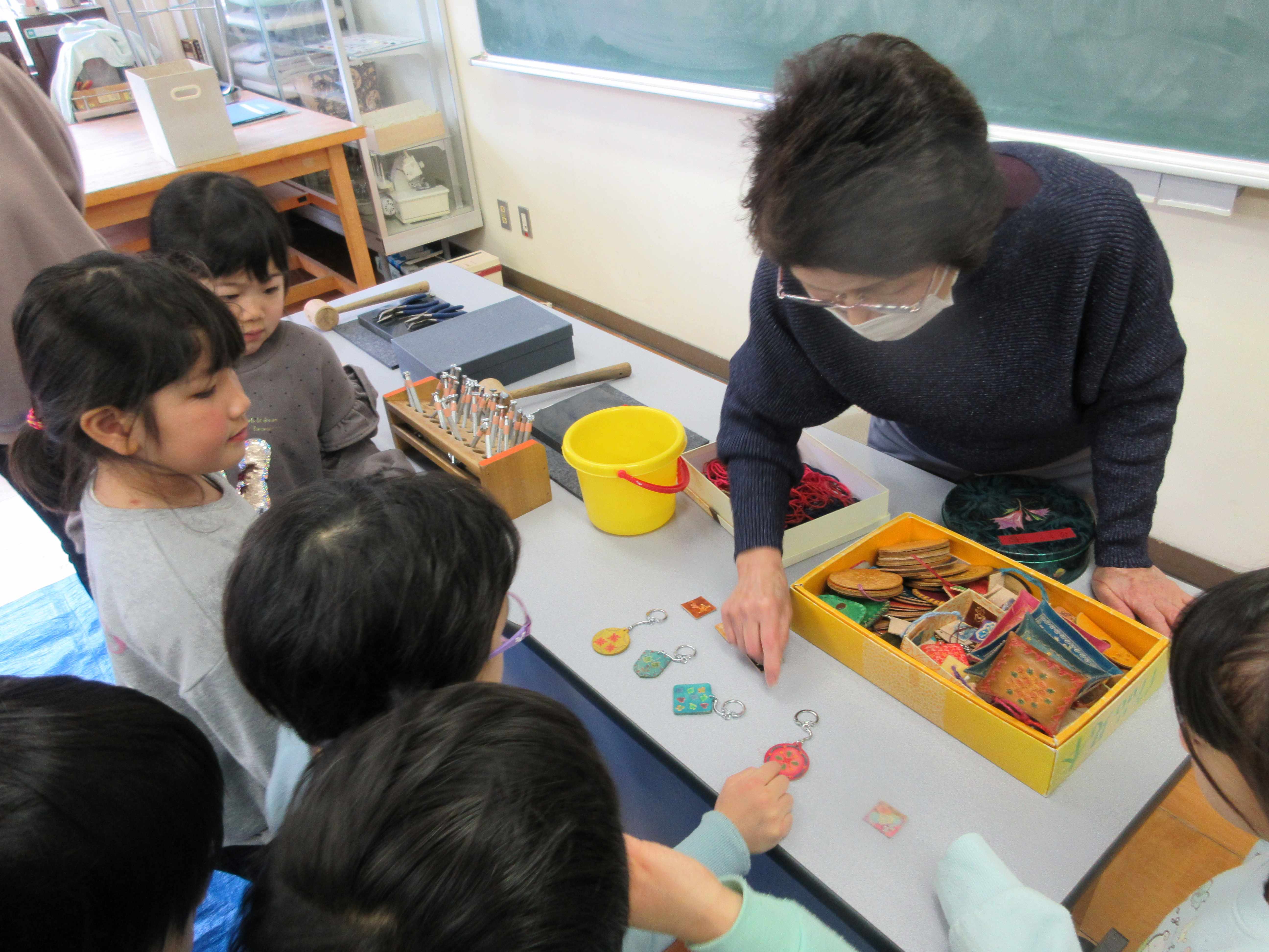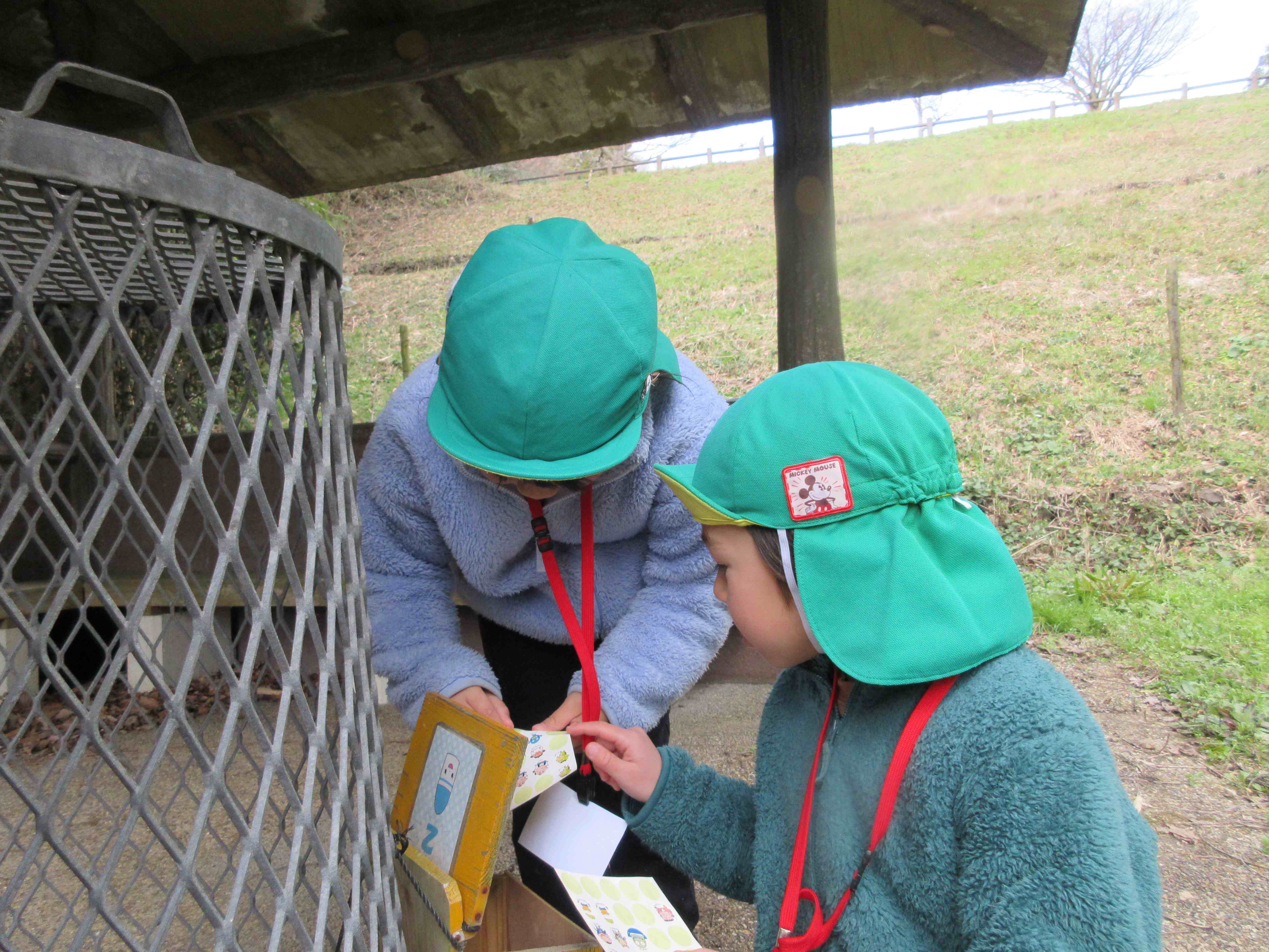 マリン保育所のくじら組さんと、今年度最後の5歳児交流をしました。午前中のレザークラフト体験では、好きな押し型を選んで打ちつけたり、色を塗ったりして、世界に一つだけのキーホルダーが出来ました。「わたしはランドセルにつける」「おでかけのかばんにつけようかな」と、嬉しそうな声があちこちで聞こえました。カレーセットを食べ終えてから、午後は戸外に出てクレヨン探検をしました。2,3人で1チームとなり「こっちじゃない?」「ここにこれがあるから・・・」などマップを頼りにチーム内で話をしたり、鳥の鳴き声や踏切の音に気付いて耳を澄ませたりしながら、シールの入った宝箱を探していました。笑顔があちこちで見られ、楽しい交流となりました。