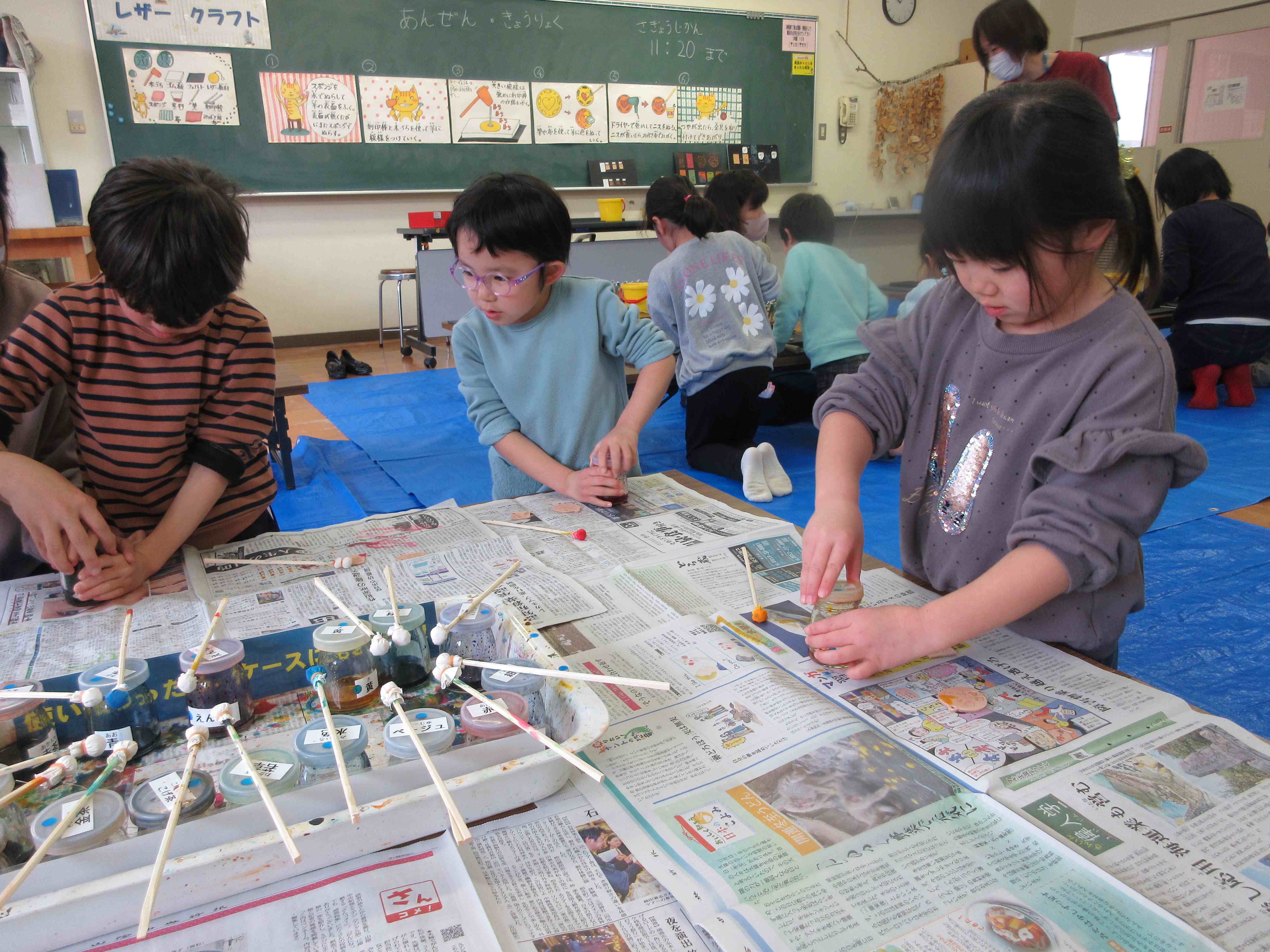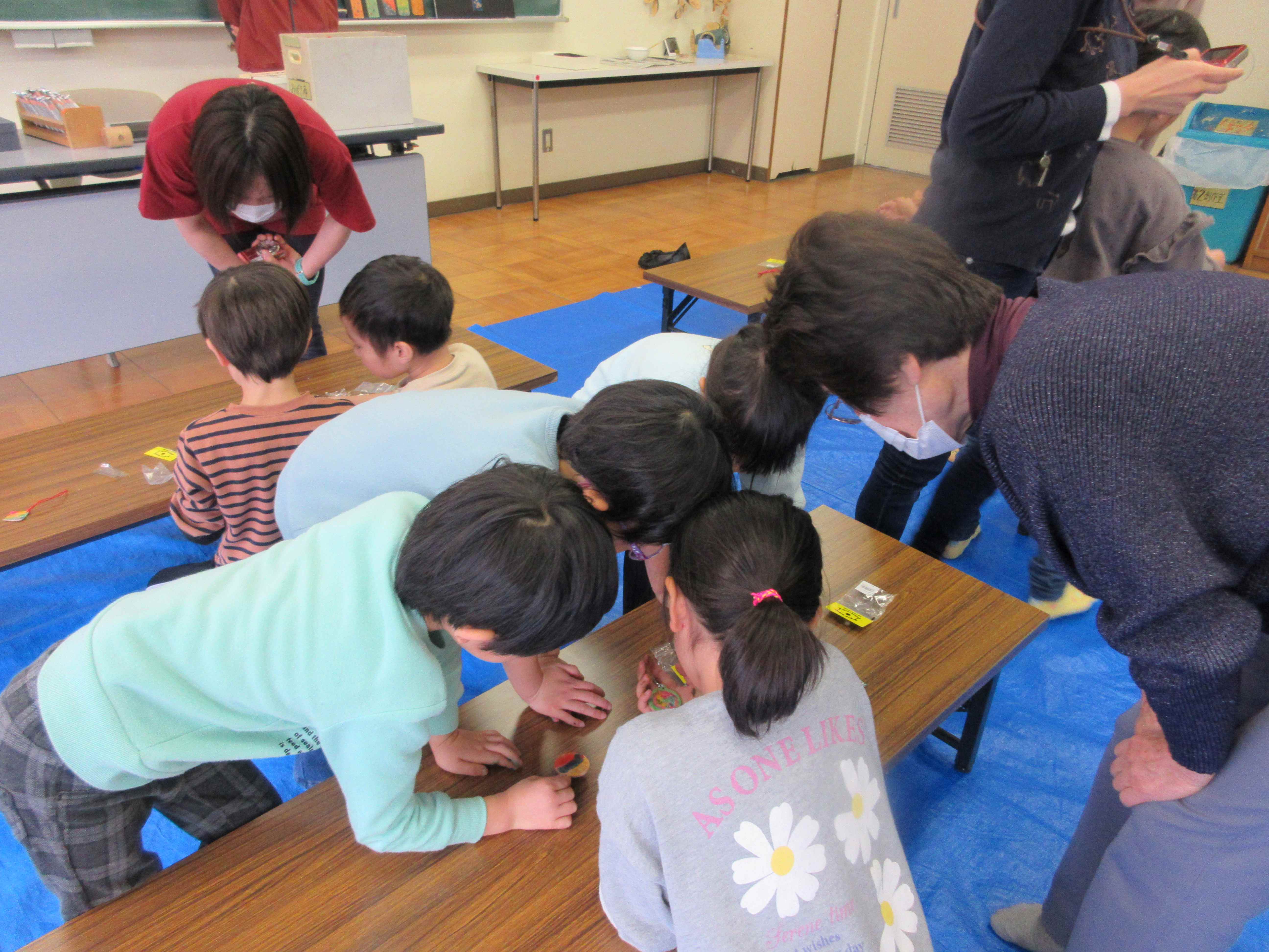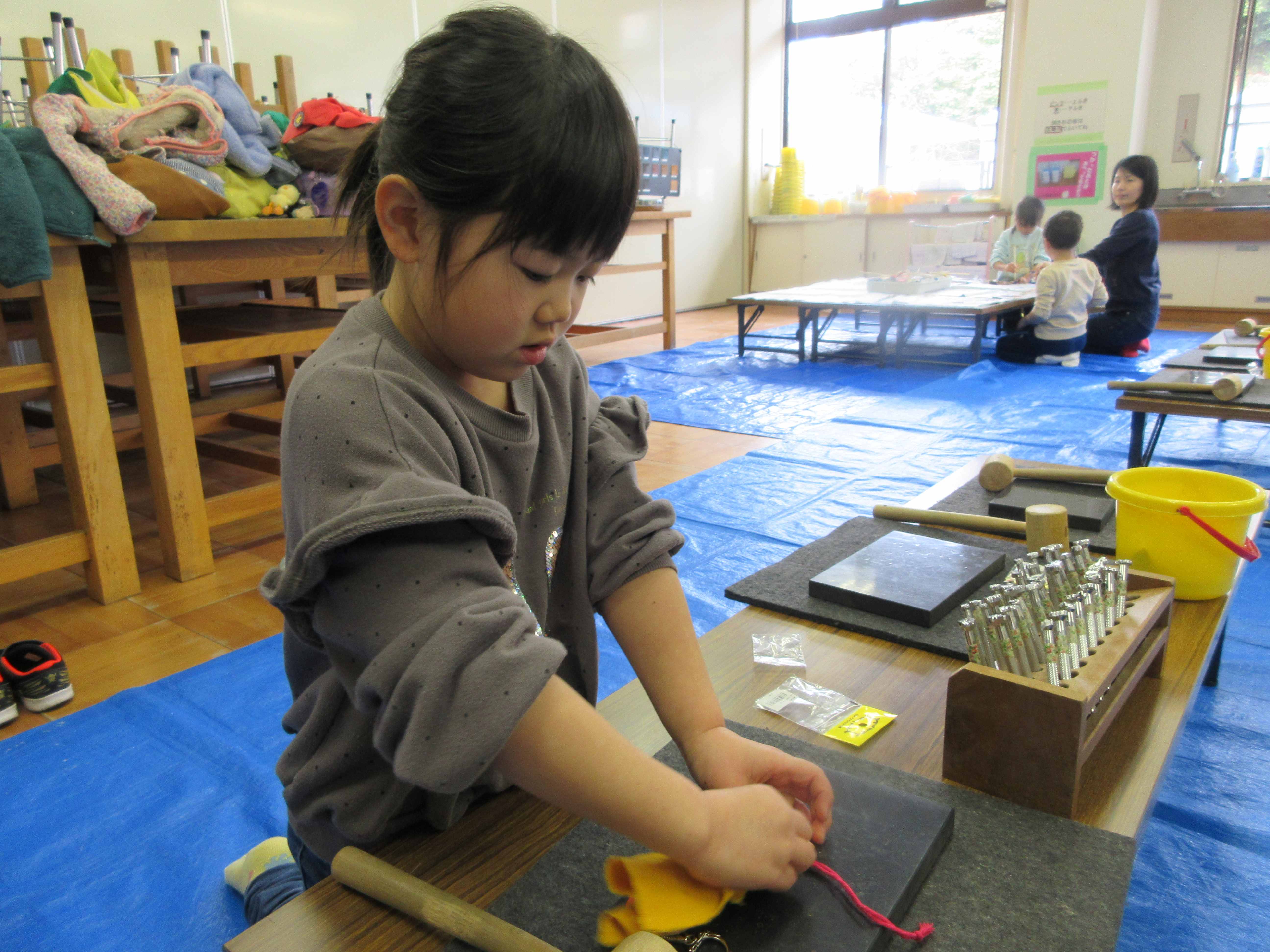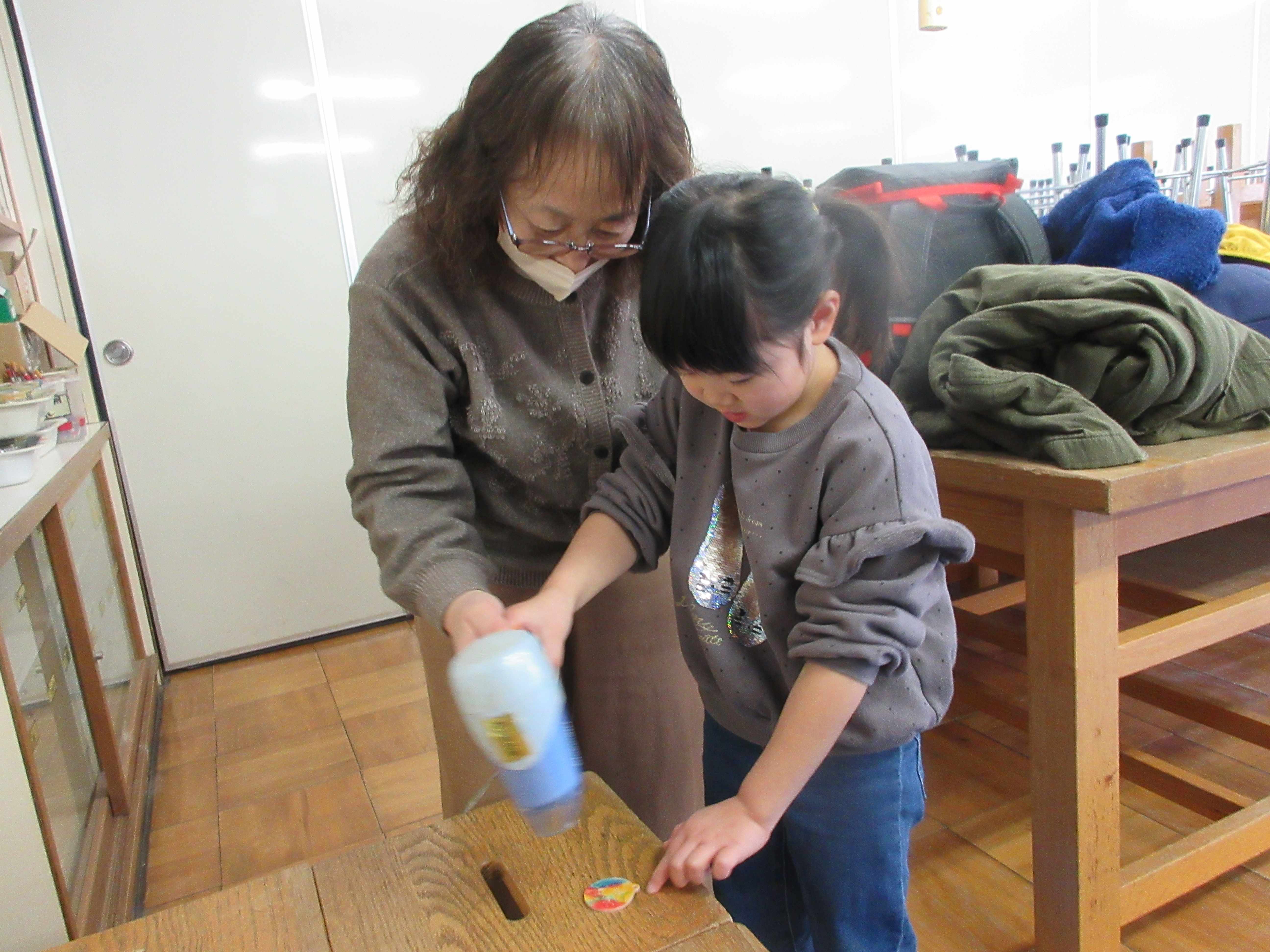 マリン保育所のくじら組さんと、今年度最後の5歳児交流をしました。午前中のレザークラフト体験では、好きな押し型を選んで打ちつけたり、色を塗ったりして、世界に一つだけのキーホルダーが出来ました。「わたしはランドセルにつける」「おでかけのかばんにつけようかな」と、嬉しそうな声があちこちで聞こえました。カレーセットを食べ終えてから、午後は戸外に出てクレヨン探検をしました。2,3人で1チームとなり「こっちじゃない?」「ここにこれがあるから・・・」などマップを頼りにチーム内で話をしたり、鳥の鳴き声や踏切の音に気付いて耳を澄ませたりしながら、シールの入った宝箱を探していました。笑顔があちこちで見られ、楽しい交流となりました。