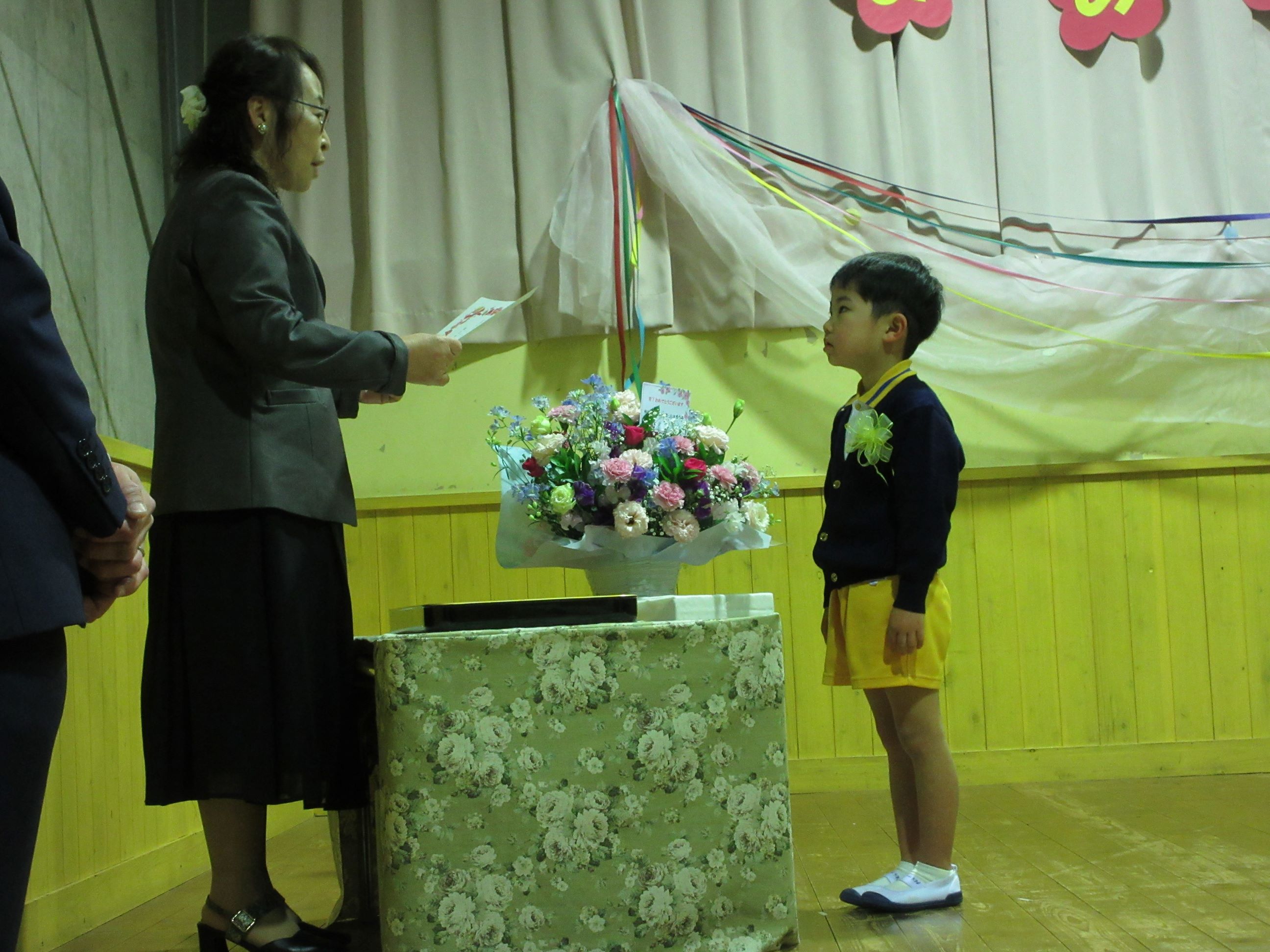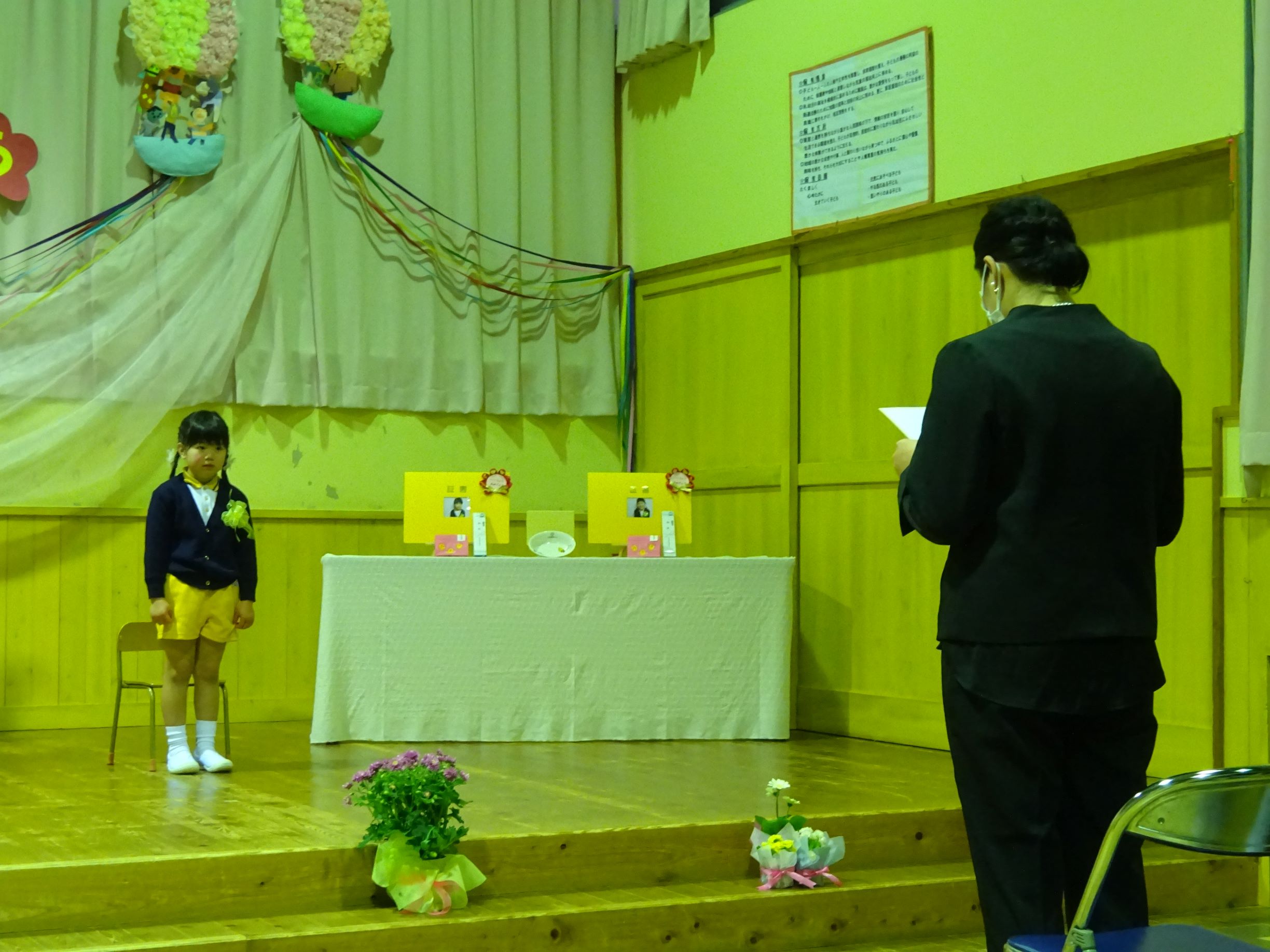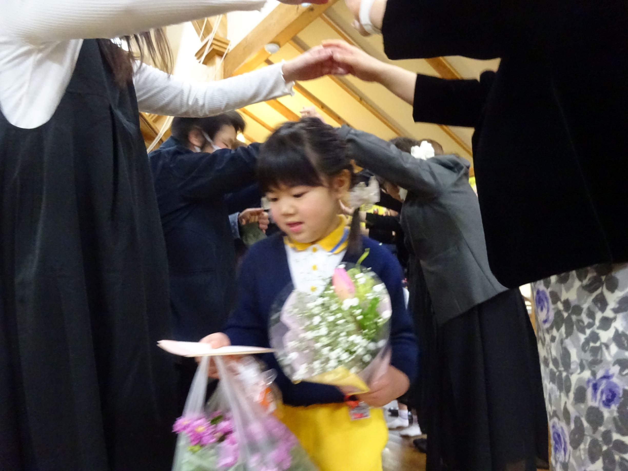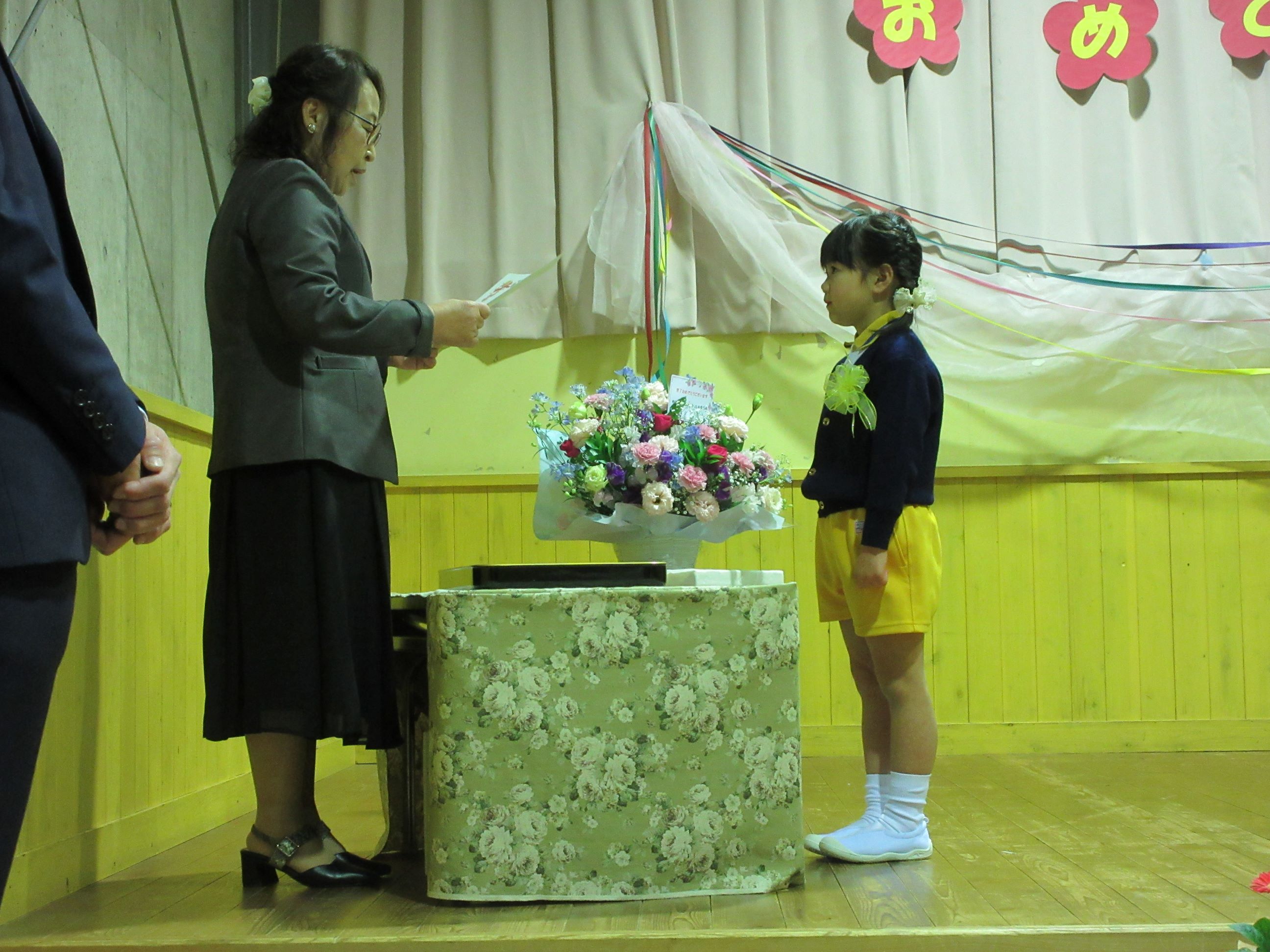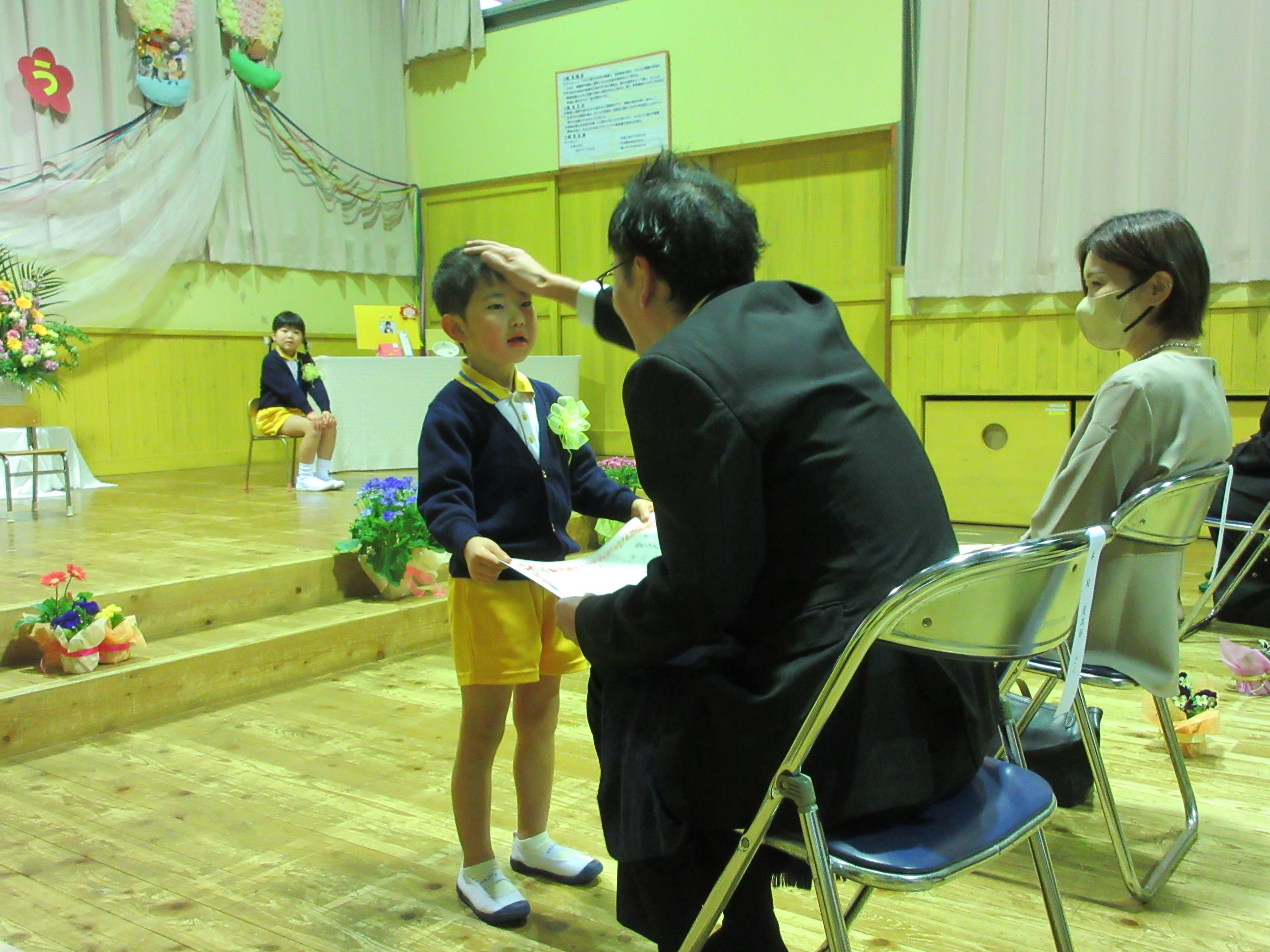 育了証書を頂く時のピンと伸ばした手や丁寧なお辞儀、友達と一緒に歌と言葉を言う姿に、成長を感じました。
