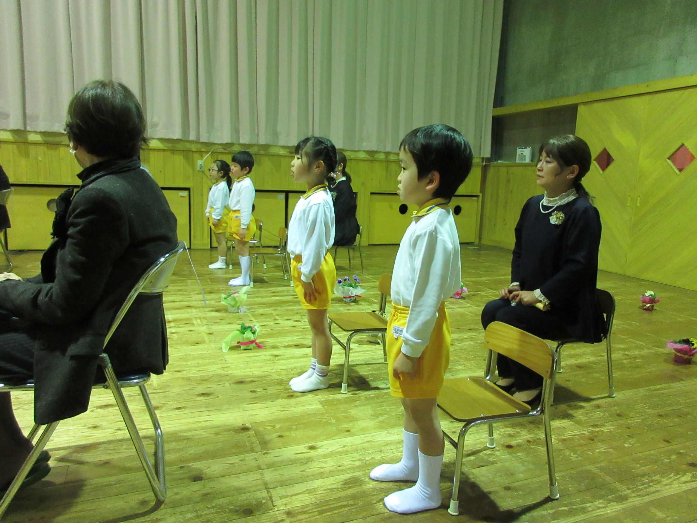 お父さん、お母さん、おじいさん、おばあさんに見守られる中、『はじめの一歩』のピアノにのせて、育了児が入場しました。今年度は4歳児も式に参列し、お祝いの歌と言葉を贈りました。