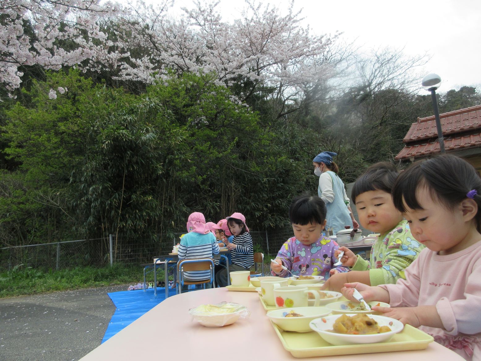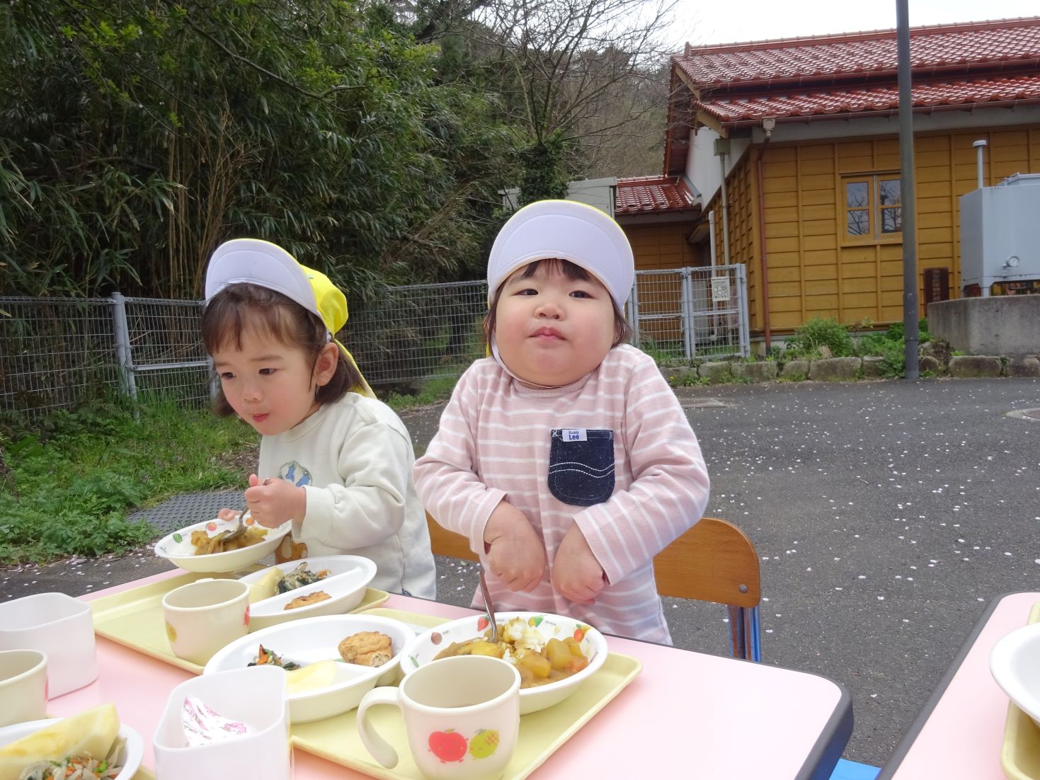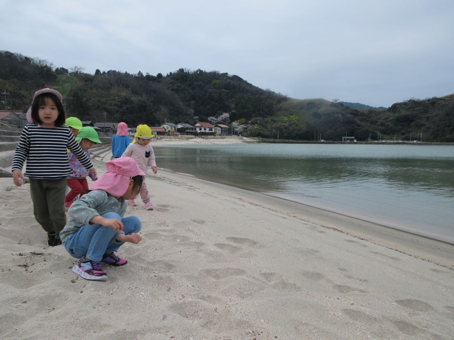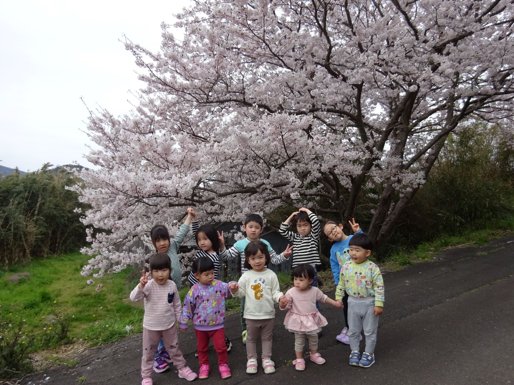 保育所の桜が見ごろを迎えました。今日は天気にも恵まれたので、小波の海まで散歩に出掛けました。道中に春のいいもの(桜、菜の花、野いちごの花、ダンゴムシ、テントウムシなど)をたくさん見つけました。現地で子ども達は貝殻を見つけ拾い集めて、大切にビニール袋に入れ持ち帰りました。そして保育士が何も言わなくても遊びながら海岸に落ちているゴミにも目が向き、ゴミ集めもして帰りました。帰って来たらおなかペコペコ‼桜の木の下で給食を食べました。子ども達にお話を聞いてみてくださいね。