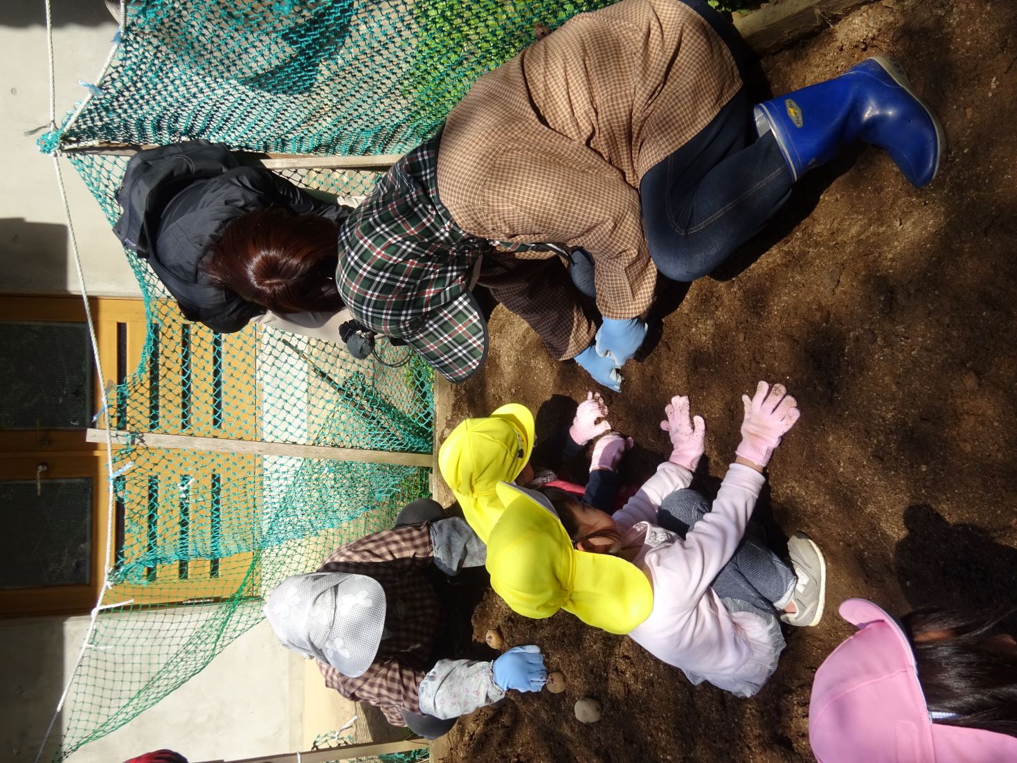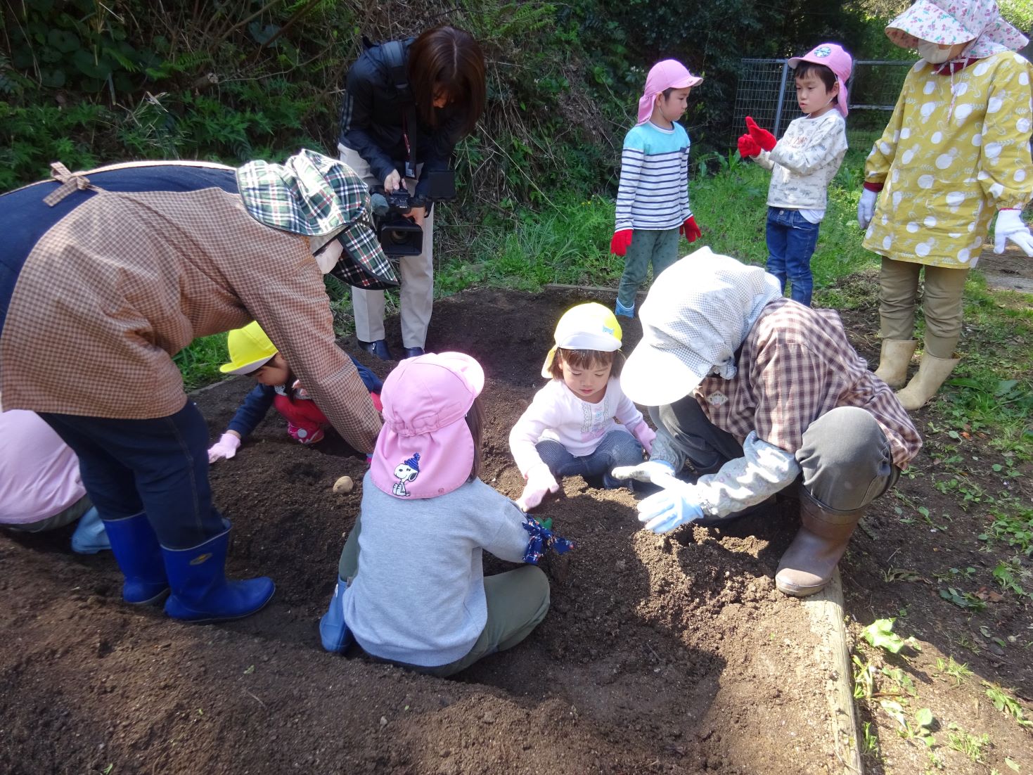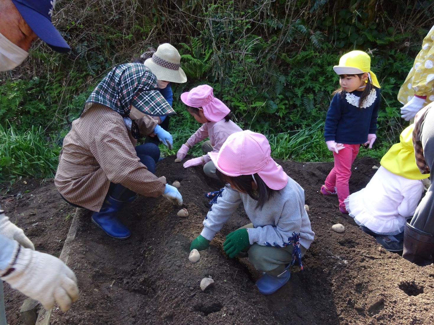 「これくらい掘るんだよ」「芽を上に向けてね」
