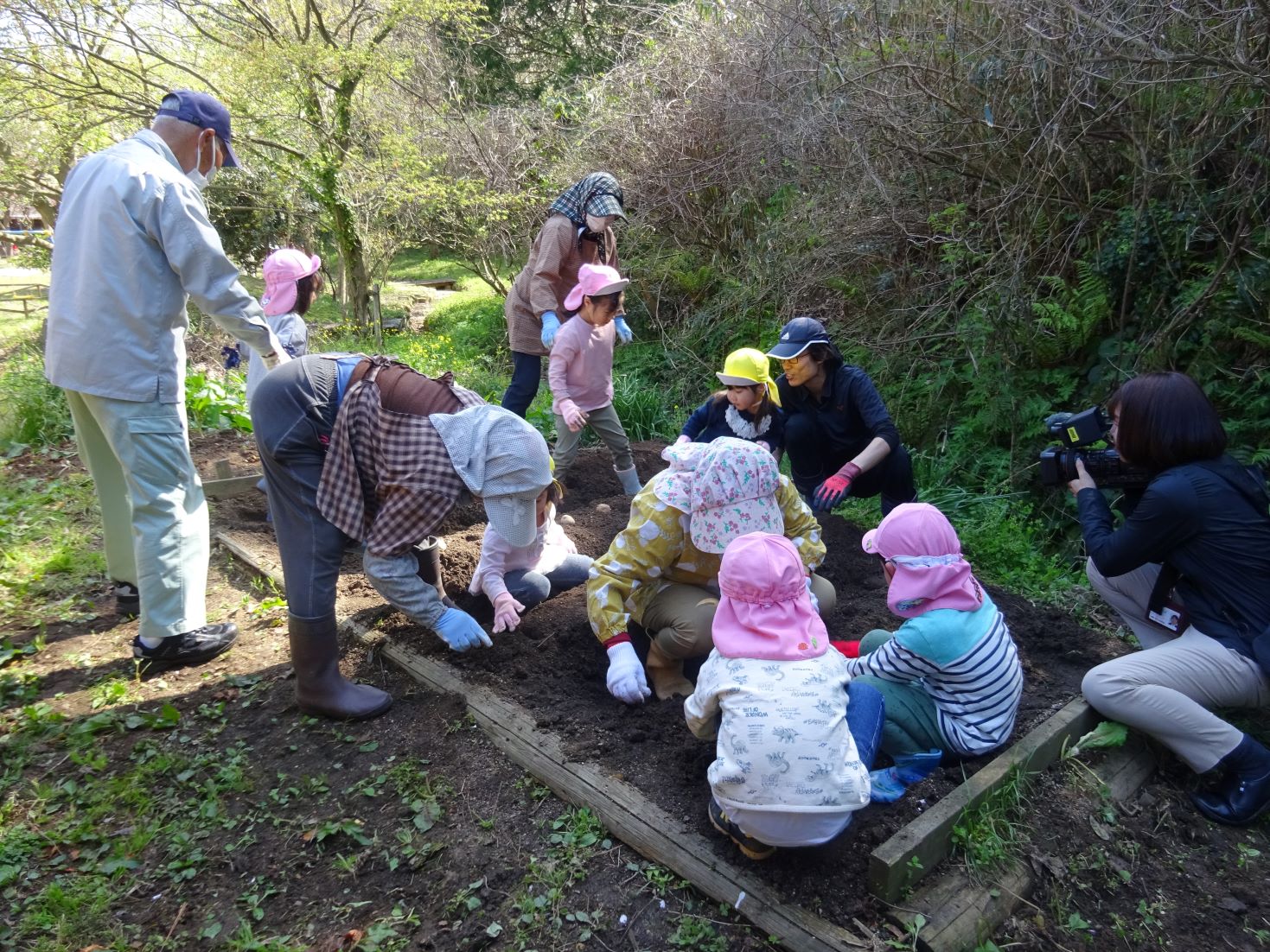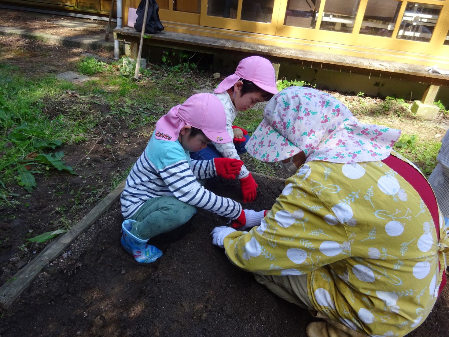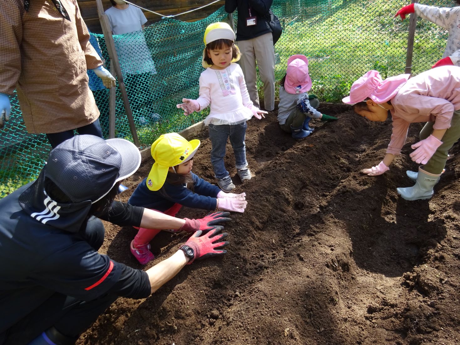 「これくらい掘るんだよ」「芽を上に向けてね」