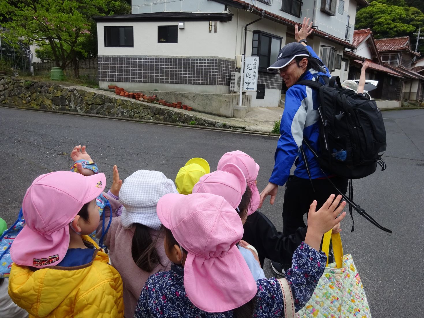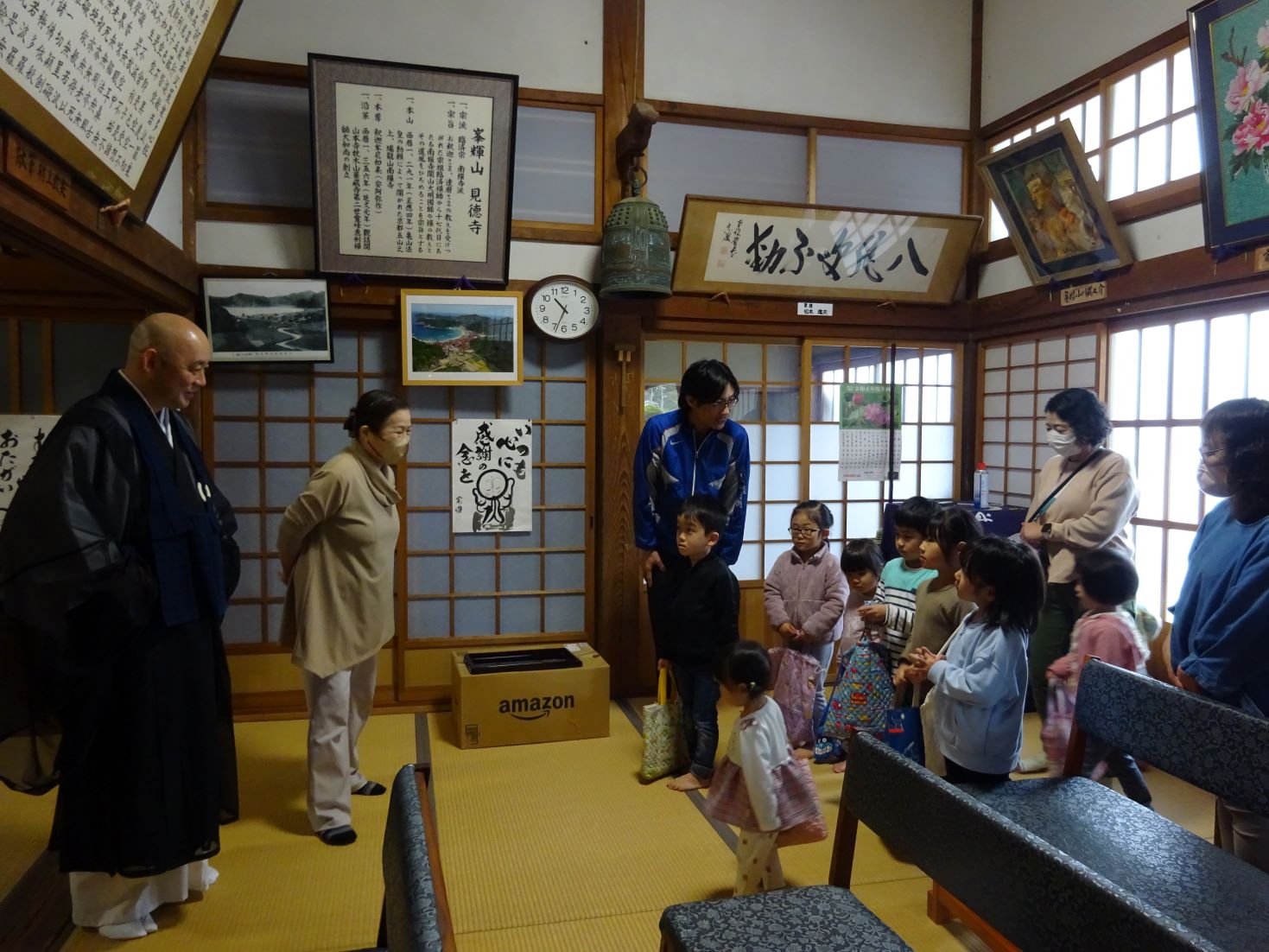 今日、お大師さんのお祭りで見徳寺、当番宿の客野さんお宅に行きました。本当は、昨日21日がお大師さんの日でしたが御厚意で保育所の子ども達のために待っていて下さいました。子ども達はお寺に着くと雰囲気を伺いながら少し緊張した様子で椅子に座り、住職さんと一緒にお経を唱えました。その後、お寺の鐘を1人ずつ突くかせていただきました。小さい子どもは保育者に抱っこされながら鐘を突きました。厳かに響き渡る鐘の音を子ども達は耳をすませて聞いていましたよ。次は客野さん宅にも伺い、お大師さん詣りをさせて頂きました。それぞれの場所で帰る時には気持ちを込めてお礼の挨拶をしました。帰り道、保育所が近づいてくると「おなか すいた~」と笑顔の子ども達。給食先生に出迎えてもらい、嬉しそうな子ども達でした。