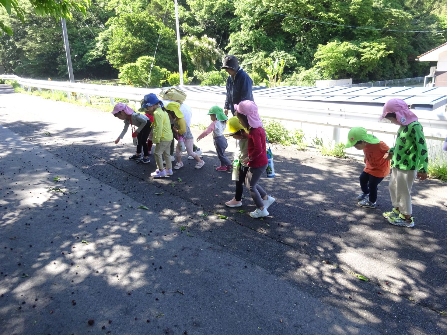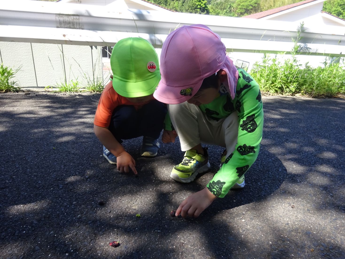 雲一つない、爽やかな青空の下、軽やかな足取りでスポーツ広場へ向かうと、道路に何かが沢山落ちていました。よーく見ると、それは“桑の実”でした。もうこんなに色づいているんだね、と季節の移り変わりを感じて歩きました。