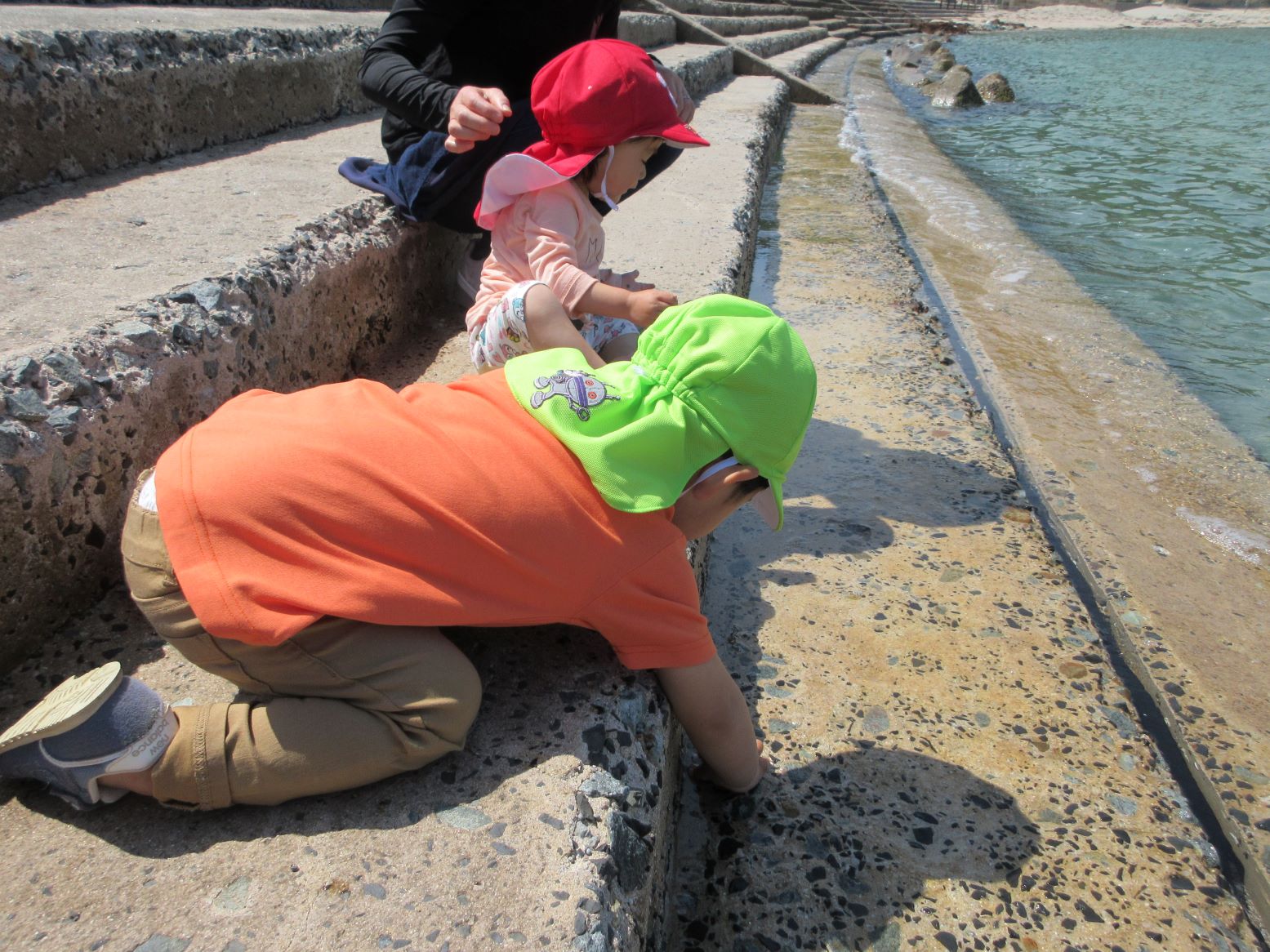 「みずにさわりたい」波に気をつけてそーっと手を伸ばします