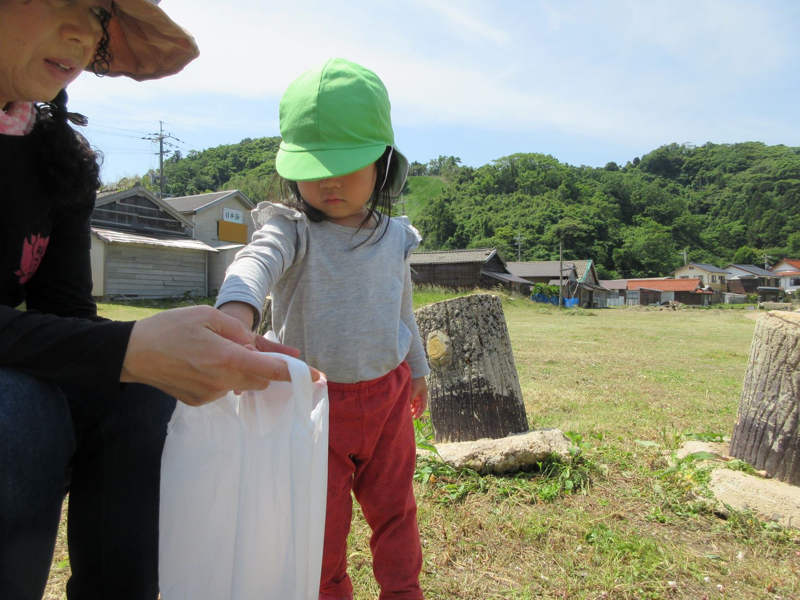 さて、海は…。大きなごみは無く、とっても綺麗になっていました。昨日、地域の皆さんがごみ拾いをされた後だったようです。「前に来た時と違って、今日は綺麗だね」と話していましたが、よく見ると小さいごみのかけらがありました。それに気付くと拾って袋に入れてくれました。僅かでしたが、クリーン大作戦をしてから遊びました。
