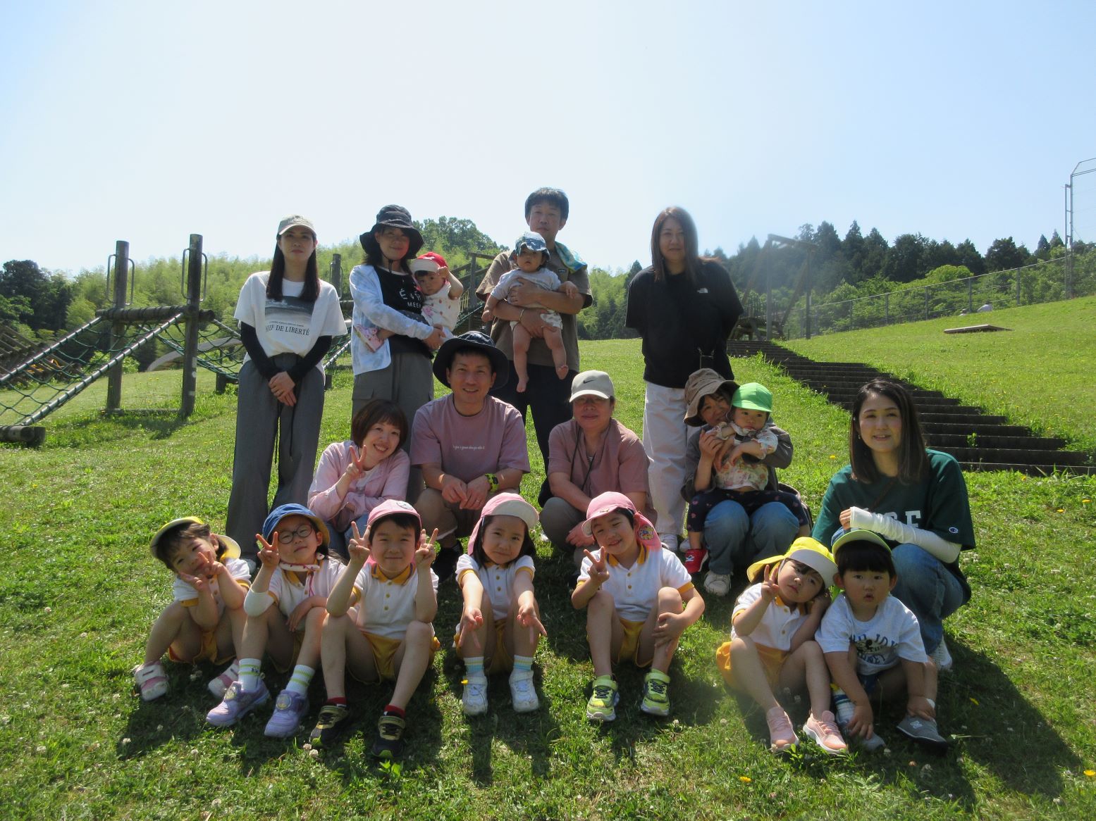 中型バスを貸し切って、雲南市大東町にある丸子山公園に行きました。晴天の中、子ども達は元気いっぱいに遊びました。バスの中や公園では約束を守って楽しく遊べた親子遠足でした。楽しかったね☆