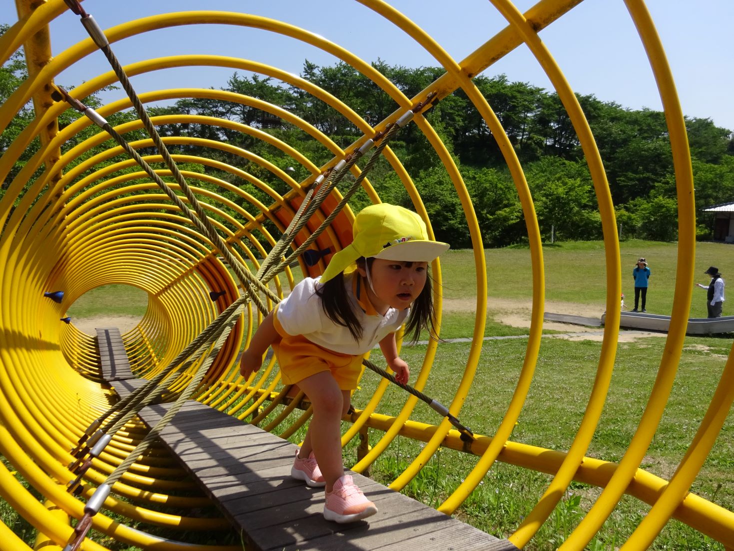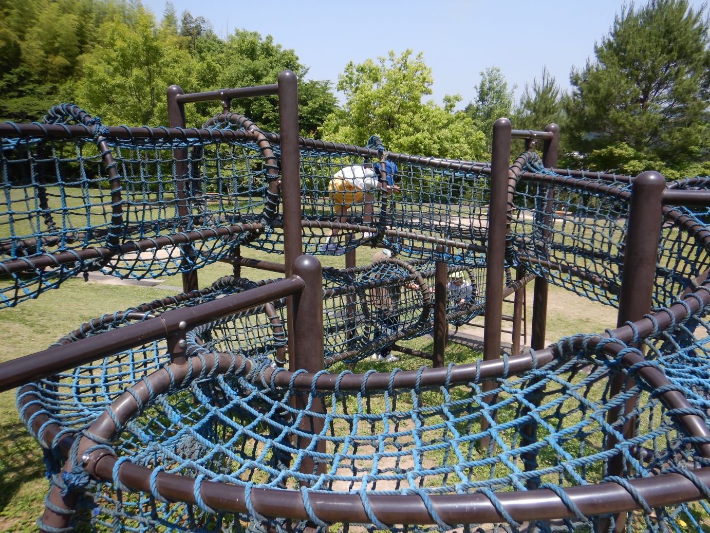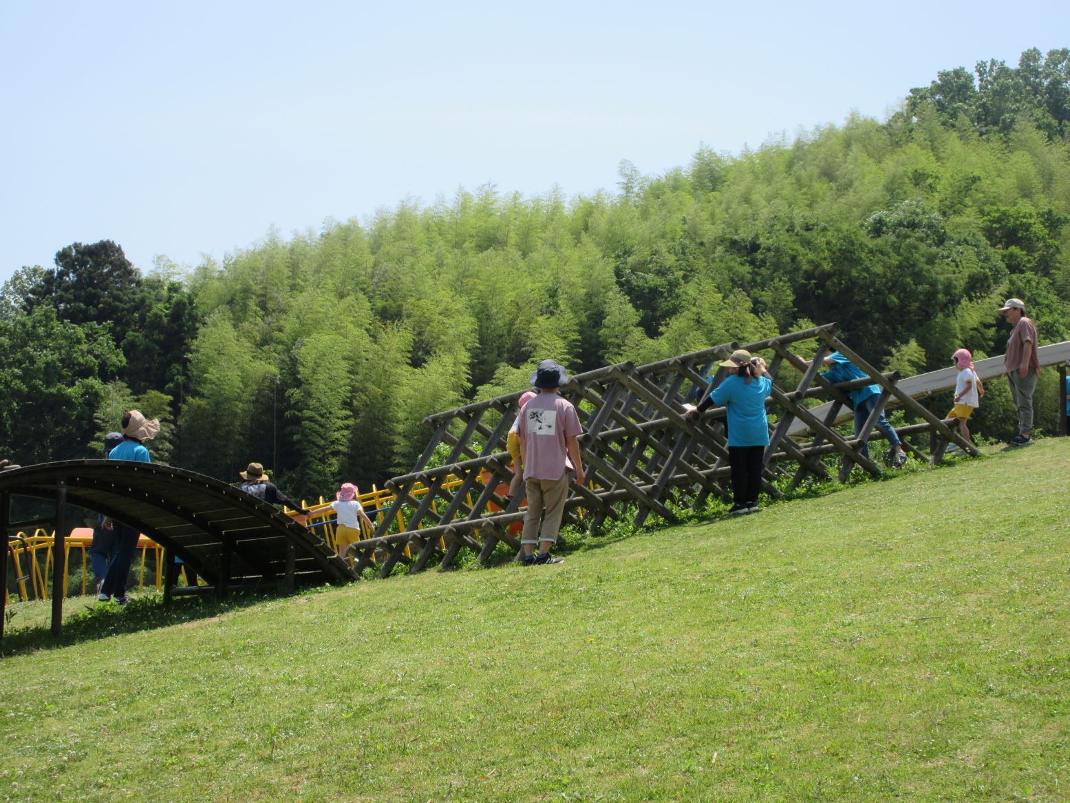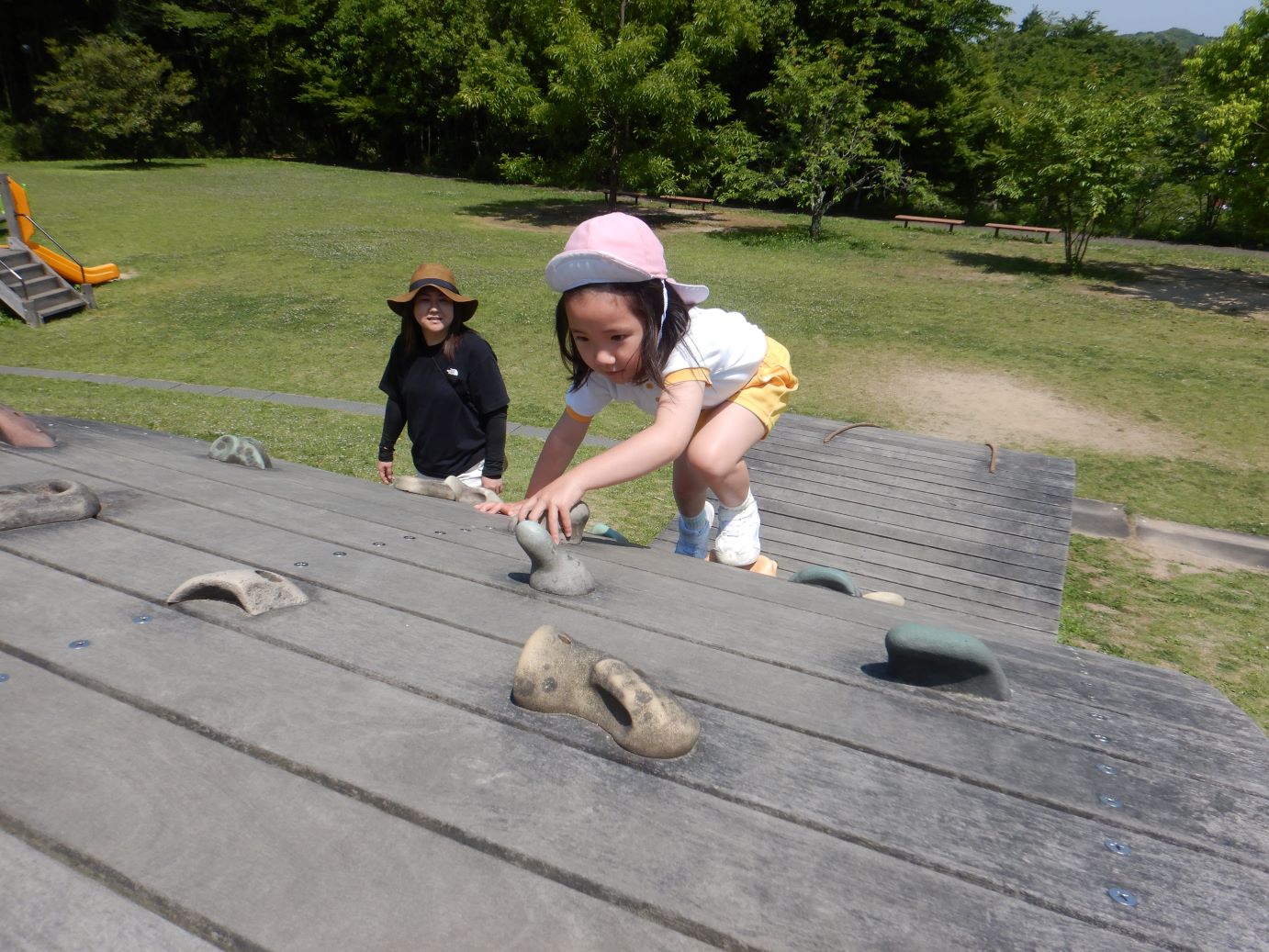 大きな木製ジャングルジムにチャレンジ