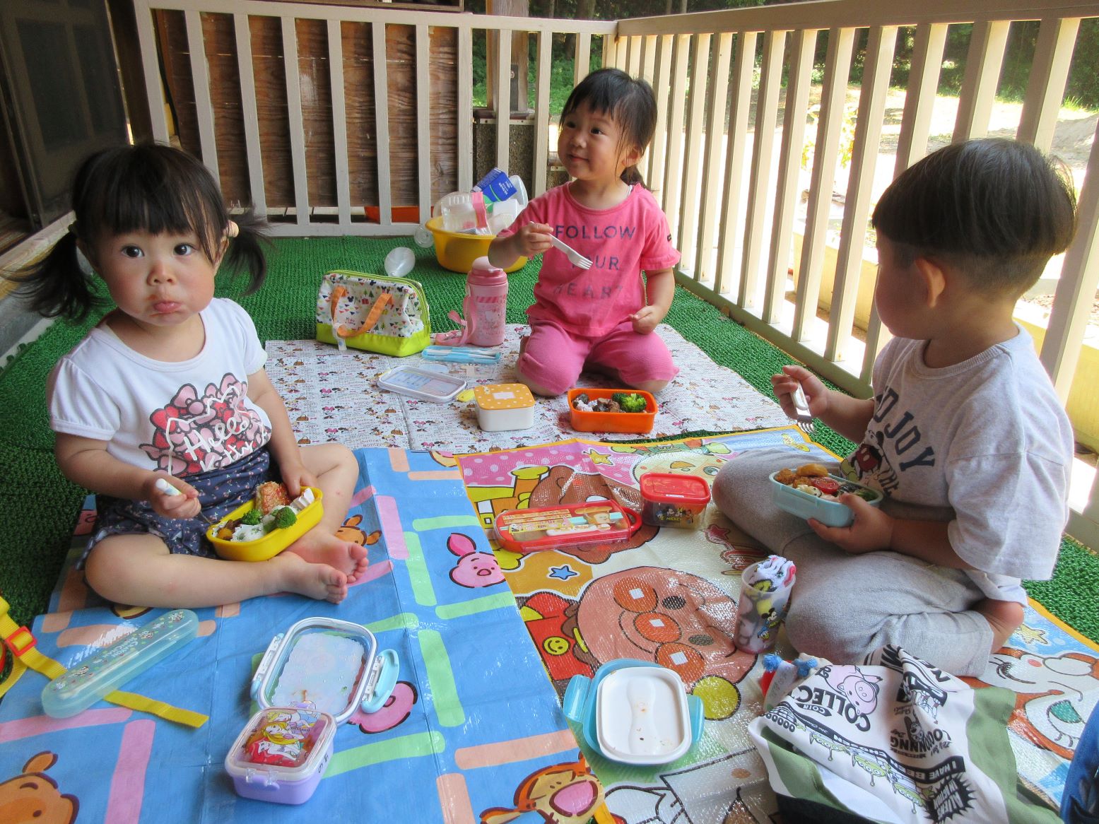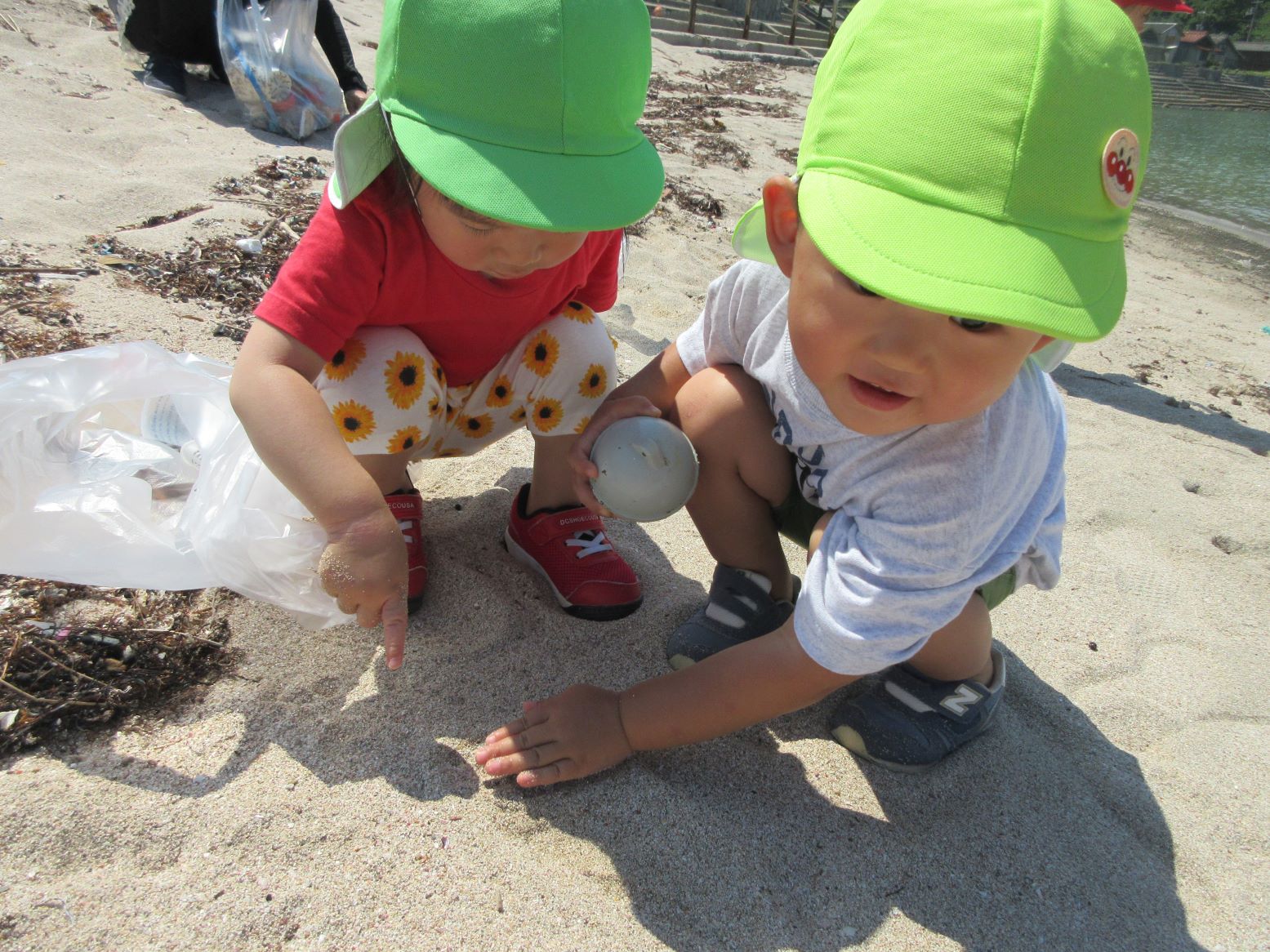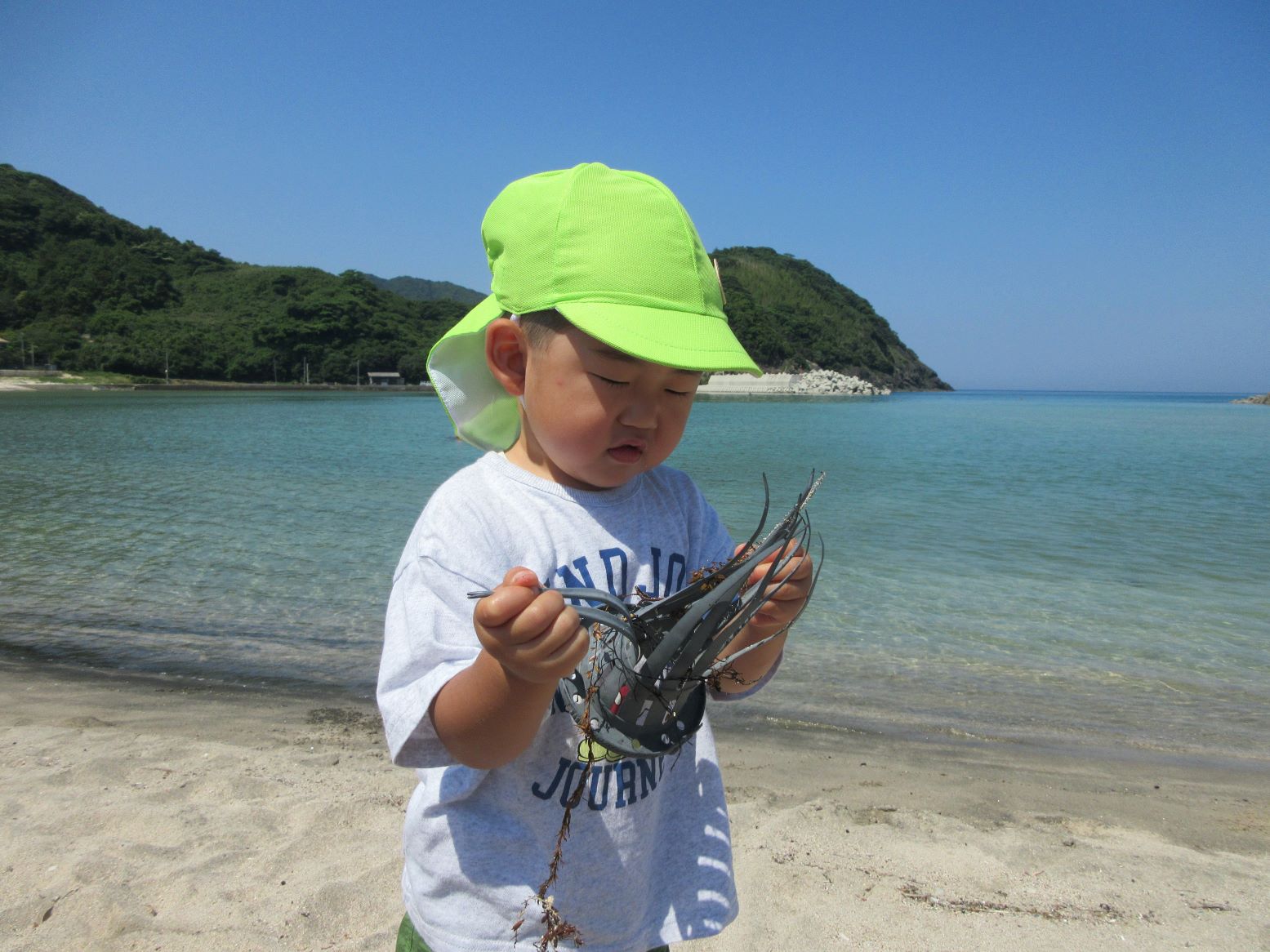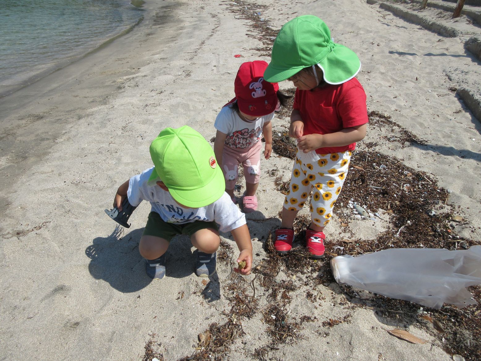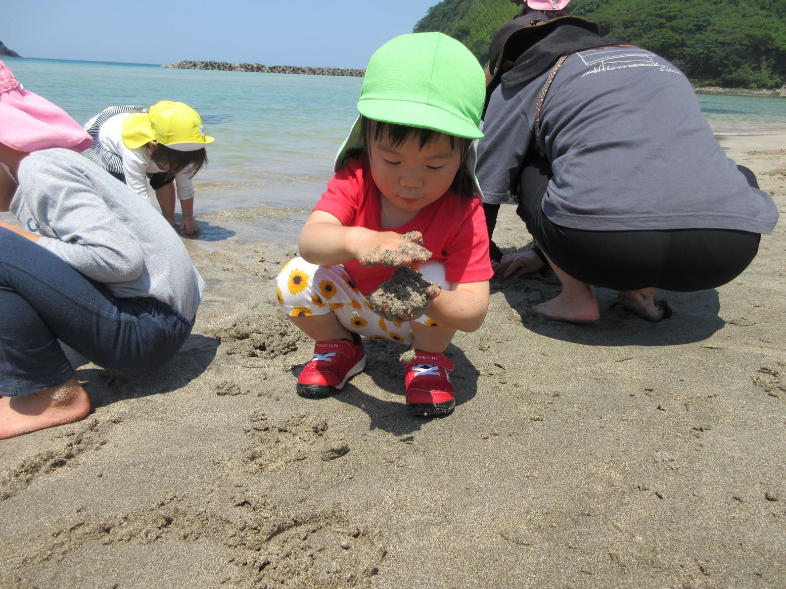 終わってから浜遊びをしていると、にじ・そら組さんもやってきて、一緒に遊びました。カニの穴を掘り進めていくと、探していた“カニ”に出会えました。すばしっこく動き回るカニを捕まえようと目をそらさずに追いかけていた子ども達。いつでも手に捕まえられるように、中腰で…。遊びながら、しっかり体を動かしたので、お腹がぺこぺこ!今日はお弁当の日。保育所へ帰ってから、愛情いっぱいのお弁当をいただきました。