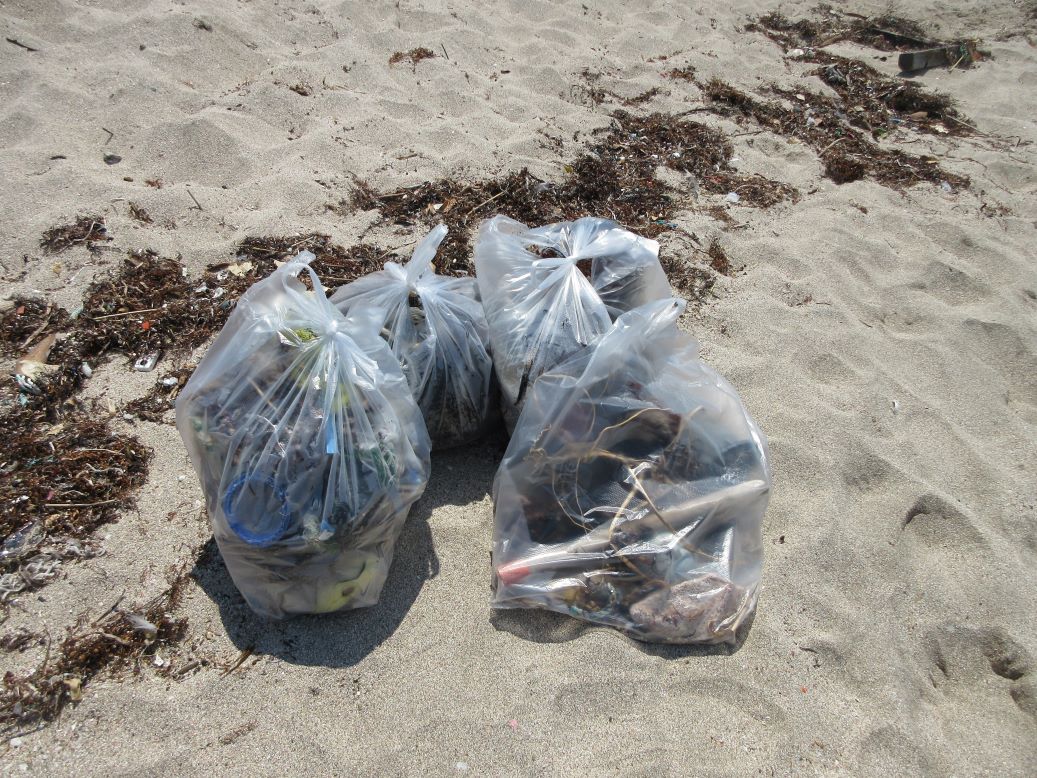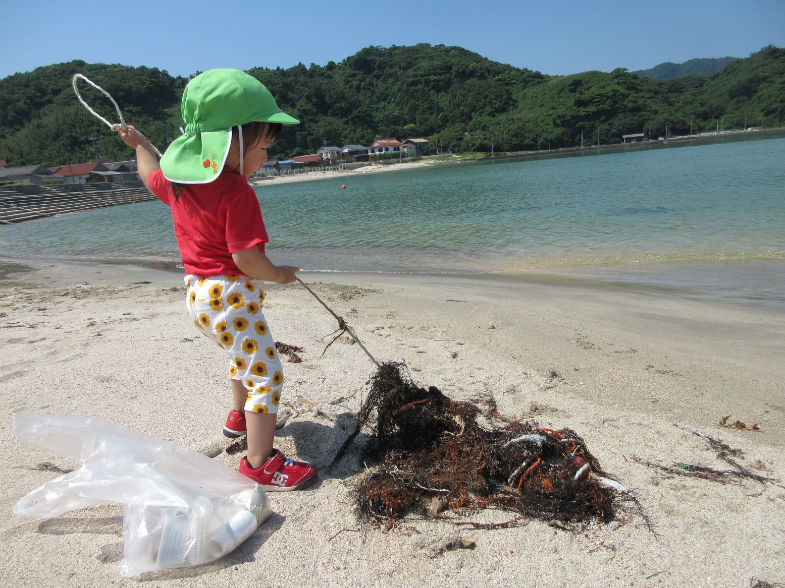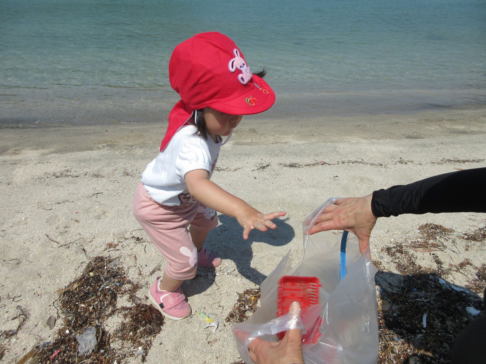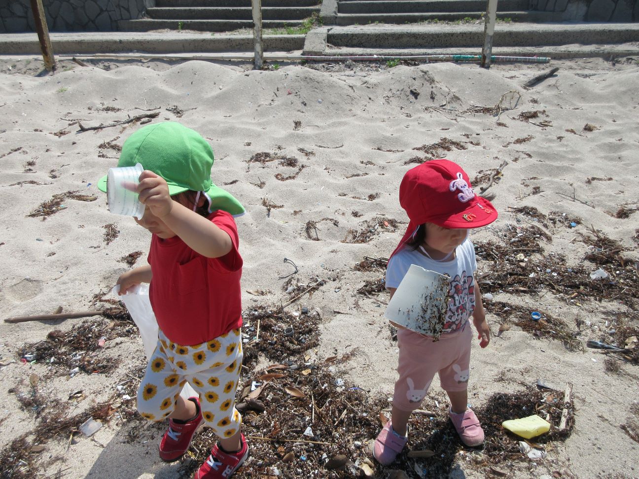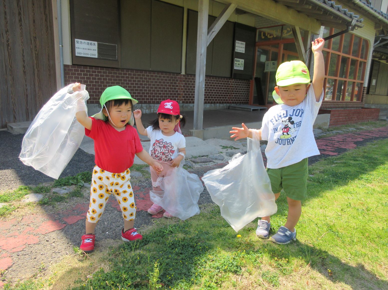 小さいけれど沢山のごみが落ちていたので、早速袋を片手に、「がんばるぞー」とかけ声をかけて始めました。ごみの中にはボールのような球体の物があり、気に入って持ち歩ていました。ペットボトルの蓋がとても多かったです。
