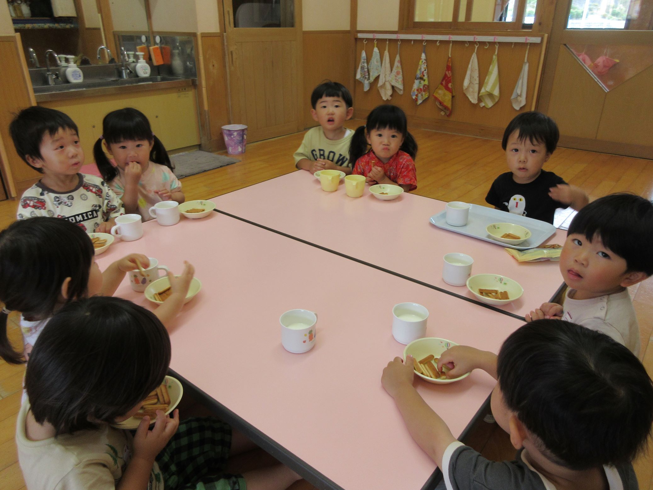 朝のおやつ中はまだ緊張気味…