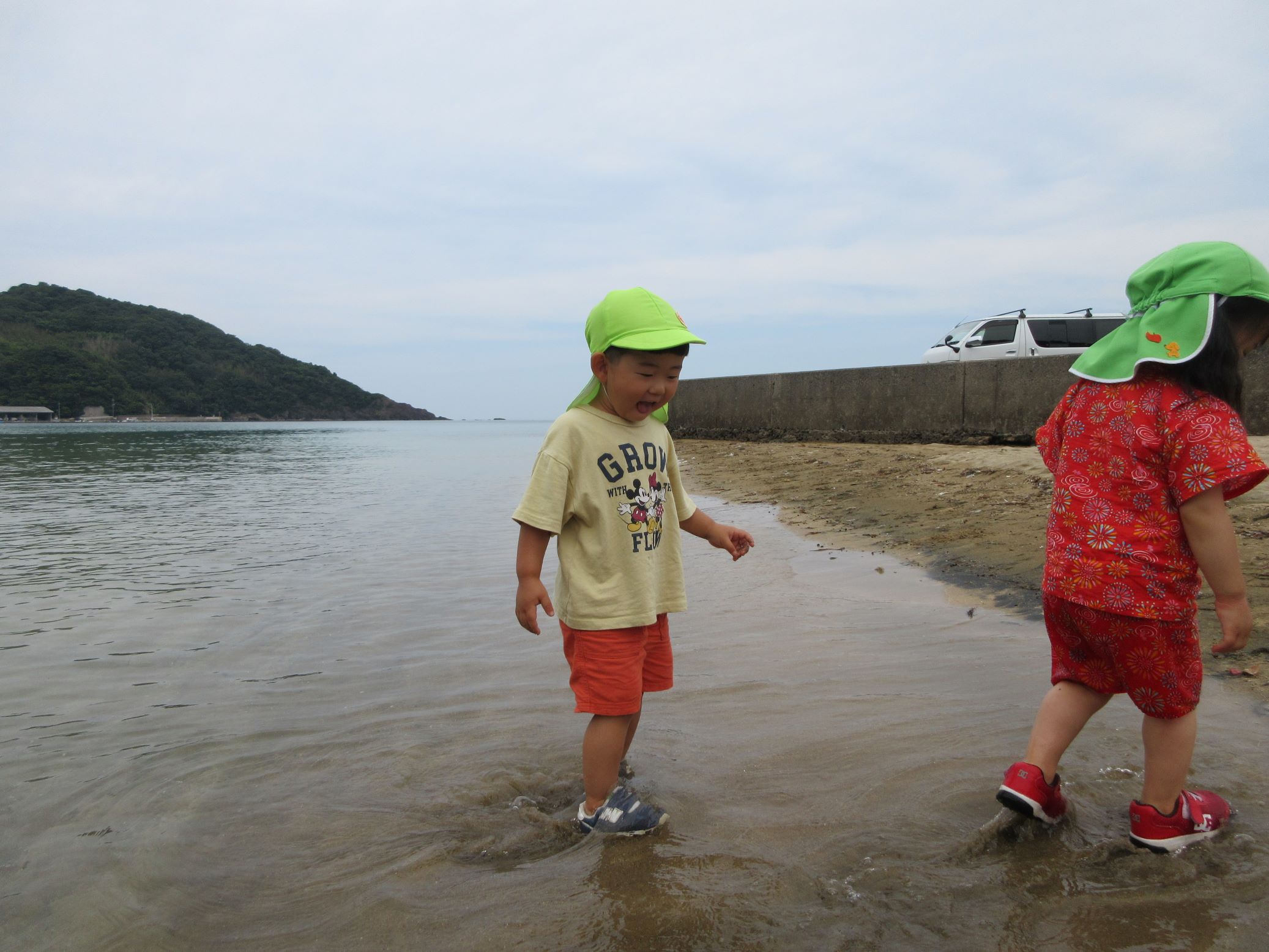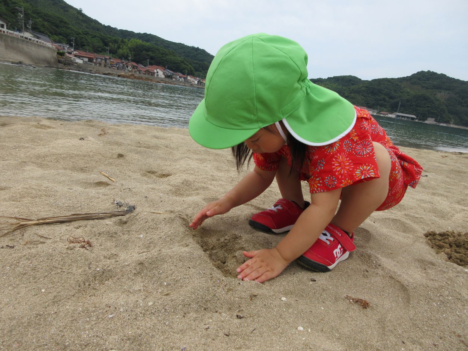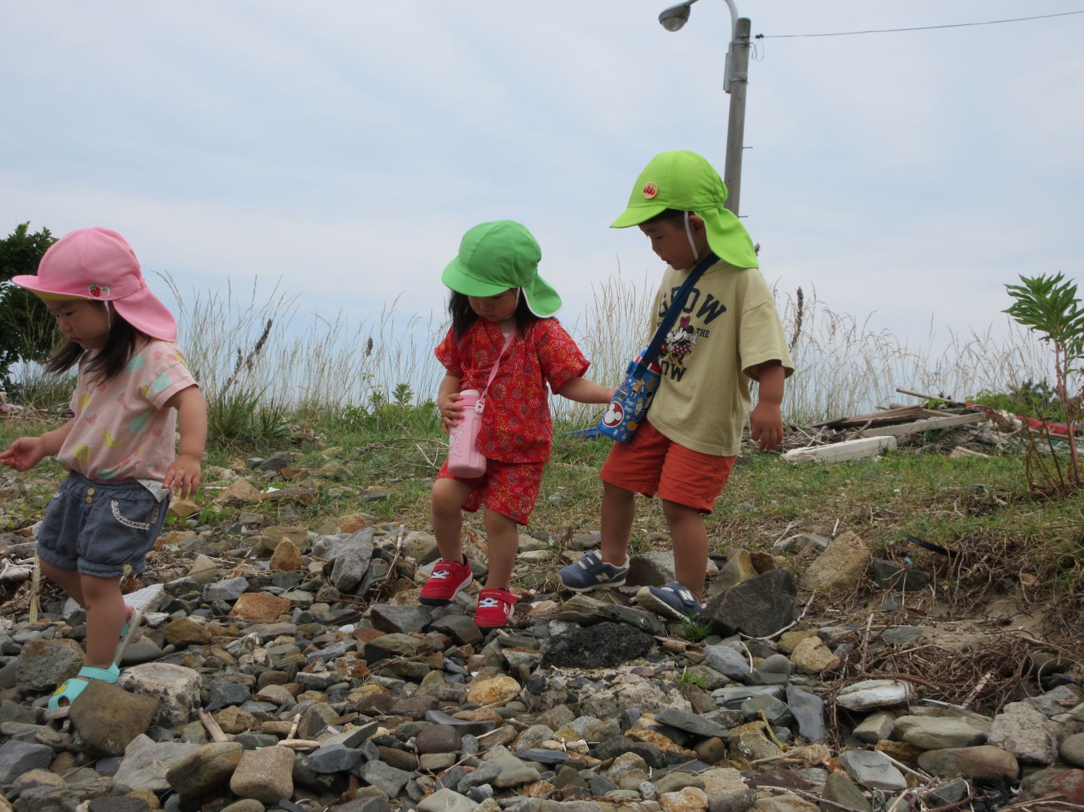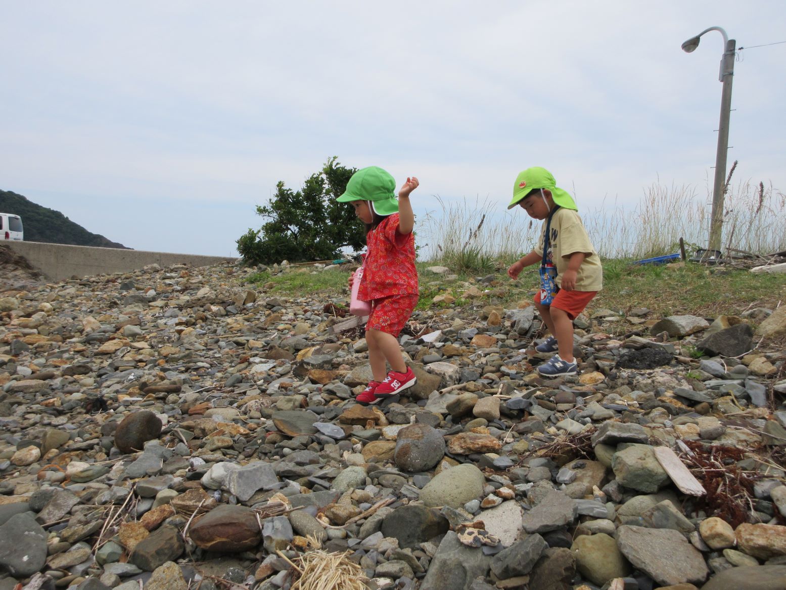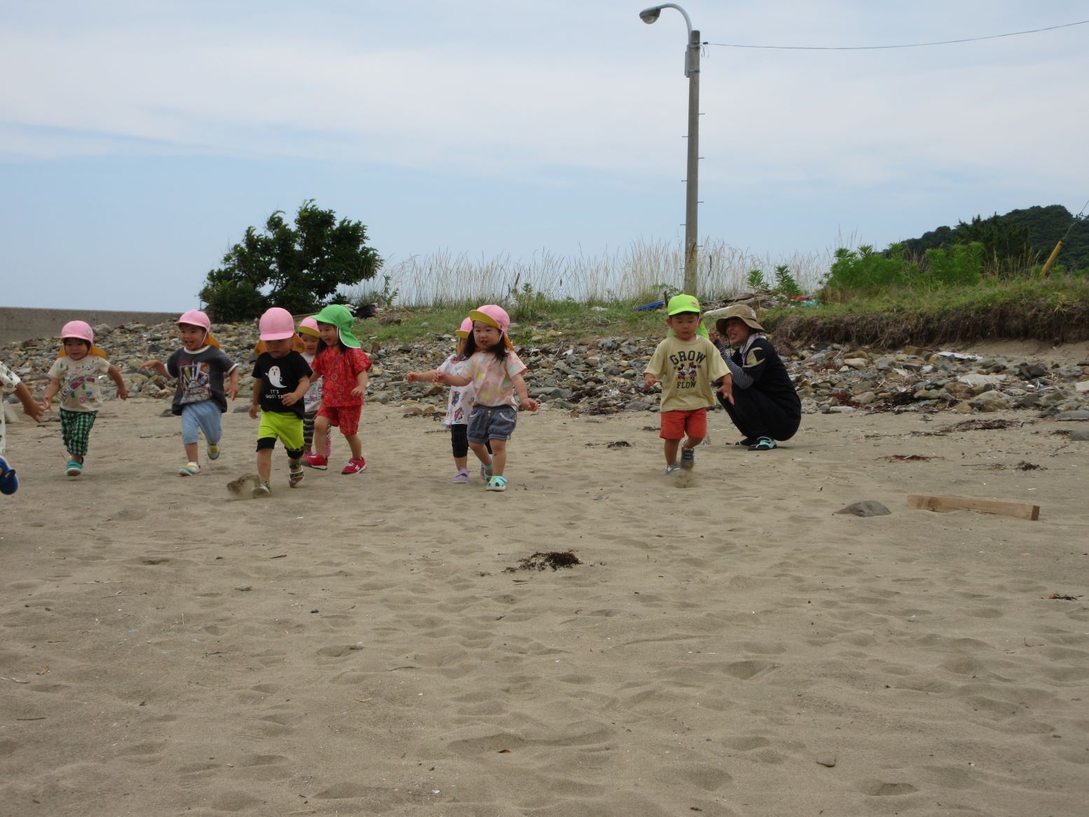 浜に下りる所にはごろごろとした石があり、その上をバランスを取りながら歩くのも楽しかったです。浜に下りると、乾いた所と湿った所があり、両方の走りを体験したり、カニの穴を掘り探したり、海に足をつけたりして遊びました。