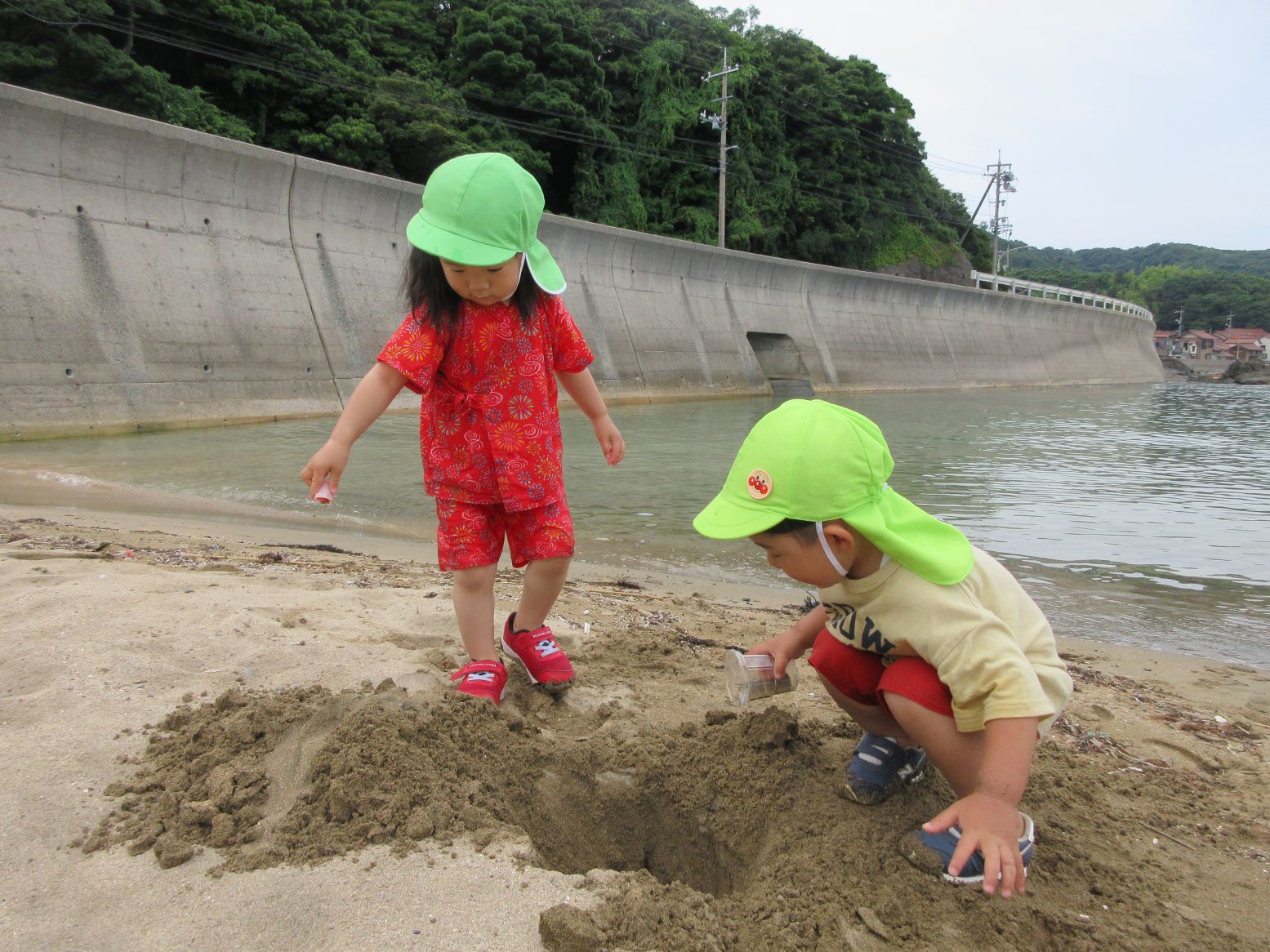 カップを見つけ、水汲みが始まりました。汲んだ水をカニの穴へ流し込みます
