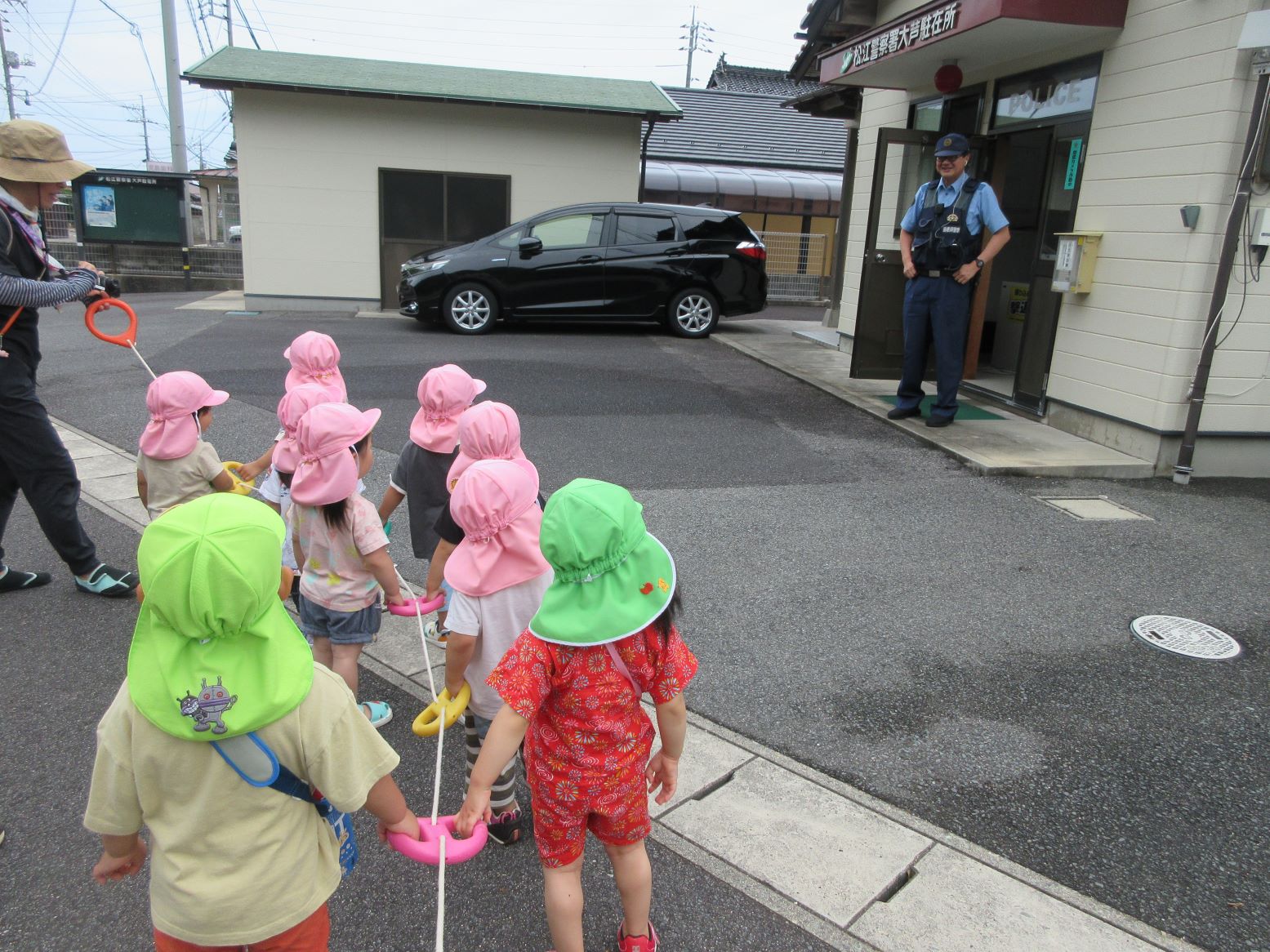 誘導ロープにつかまって、出発!途中の派出所でおまわりさんに会うことが出来ました 「いってきます」
