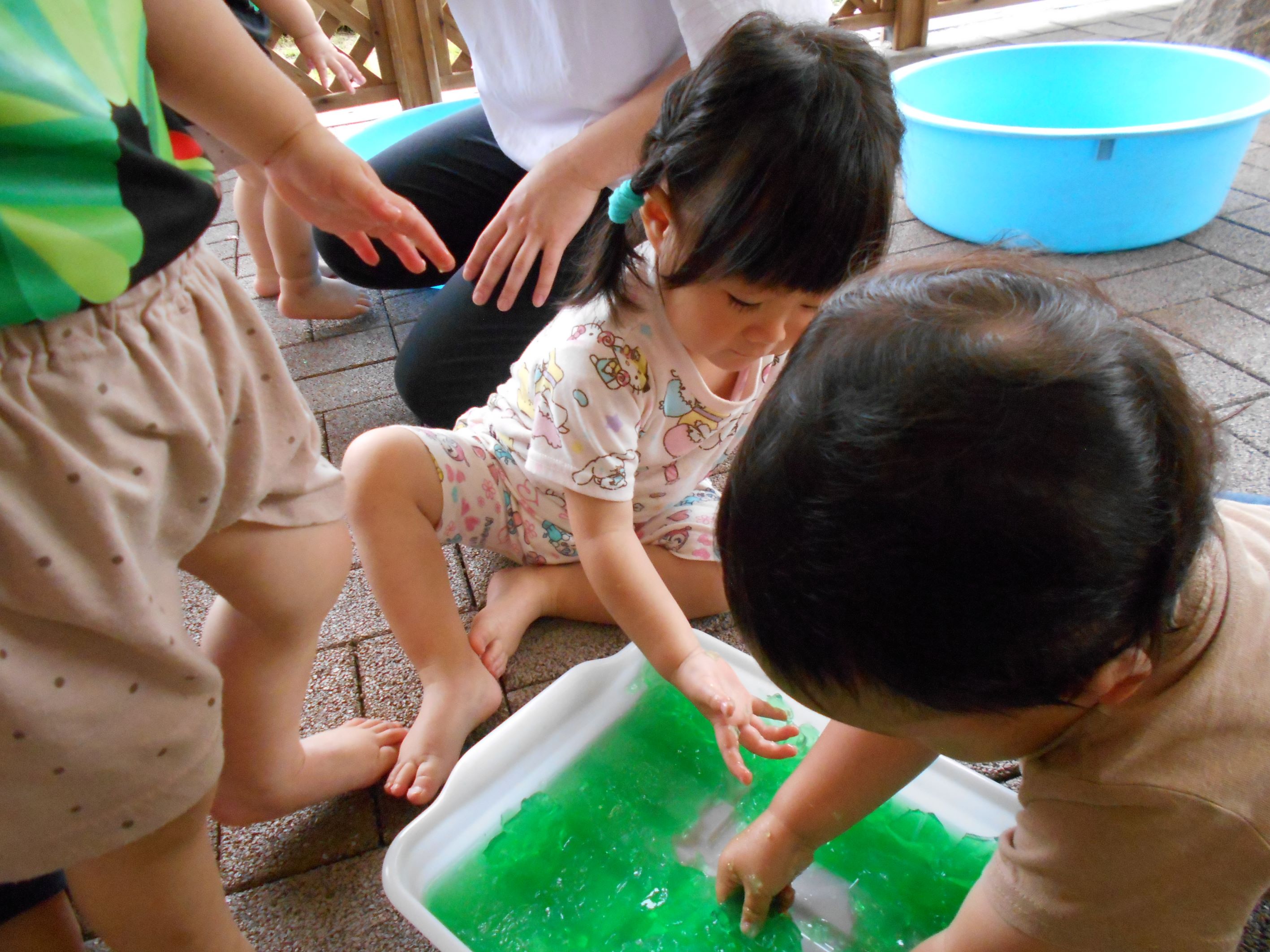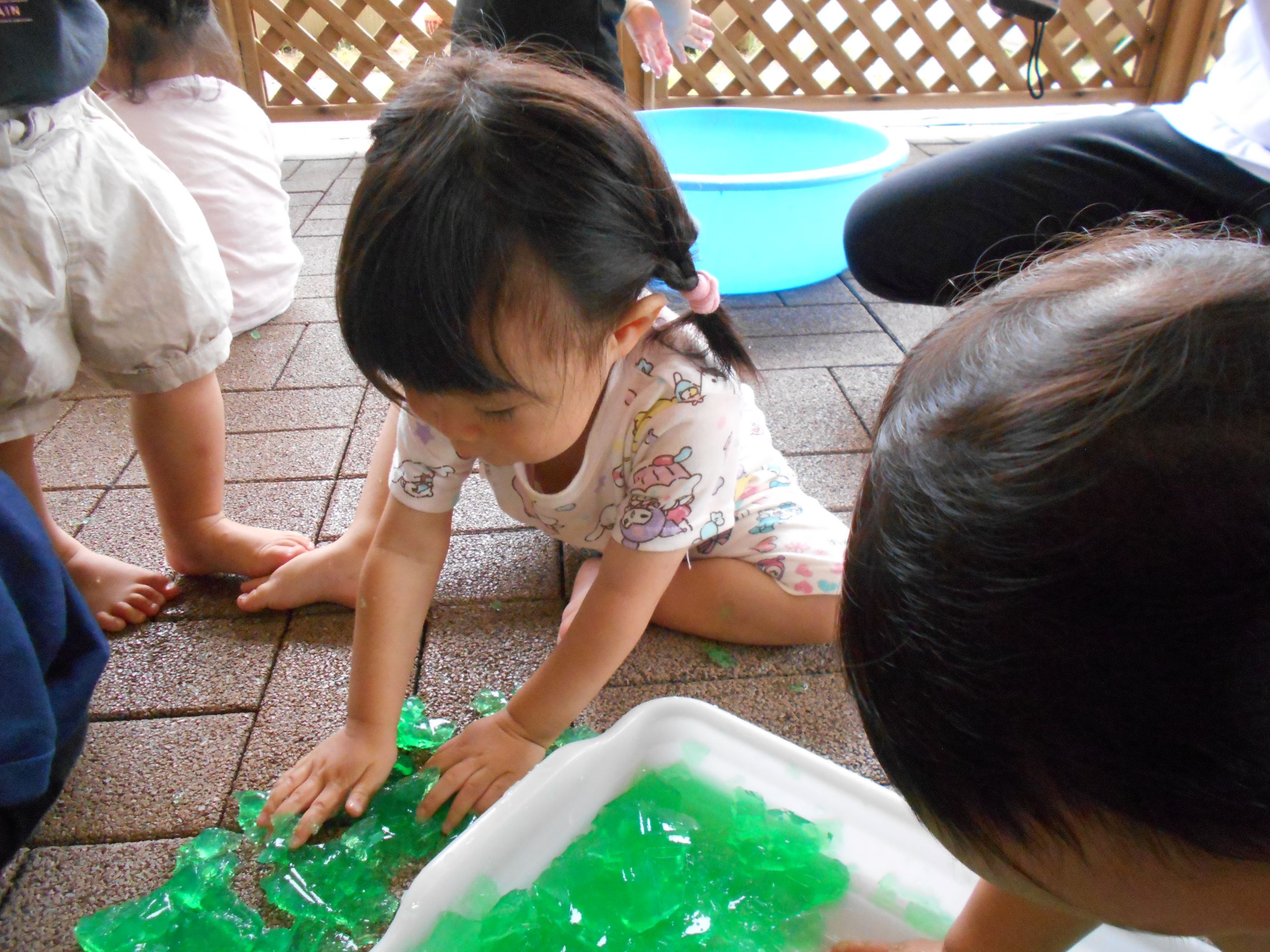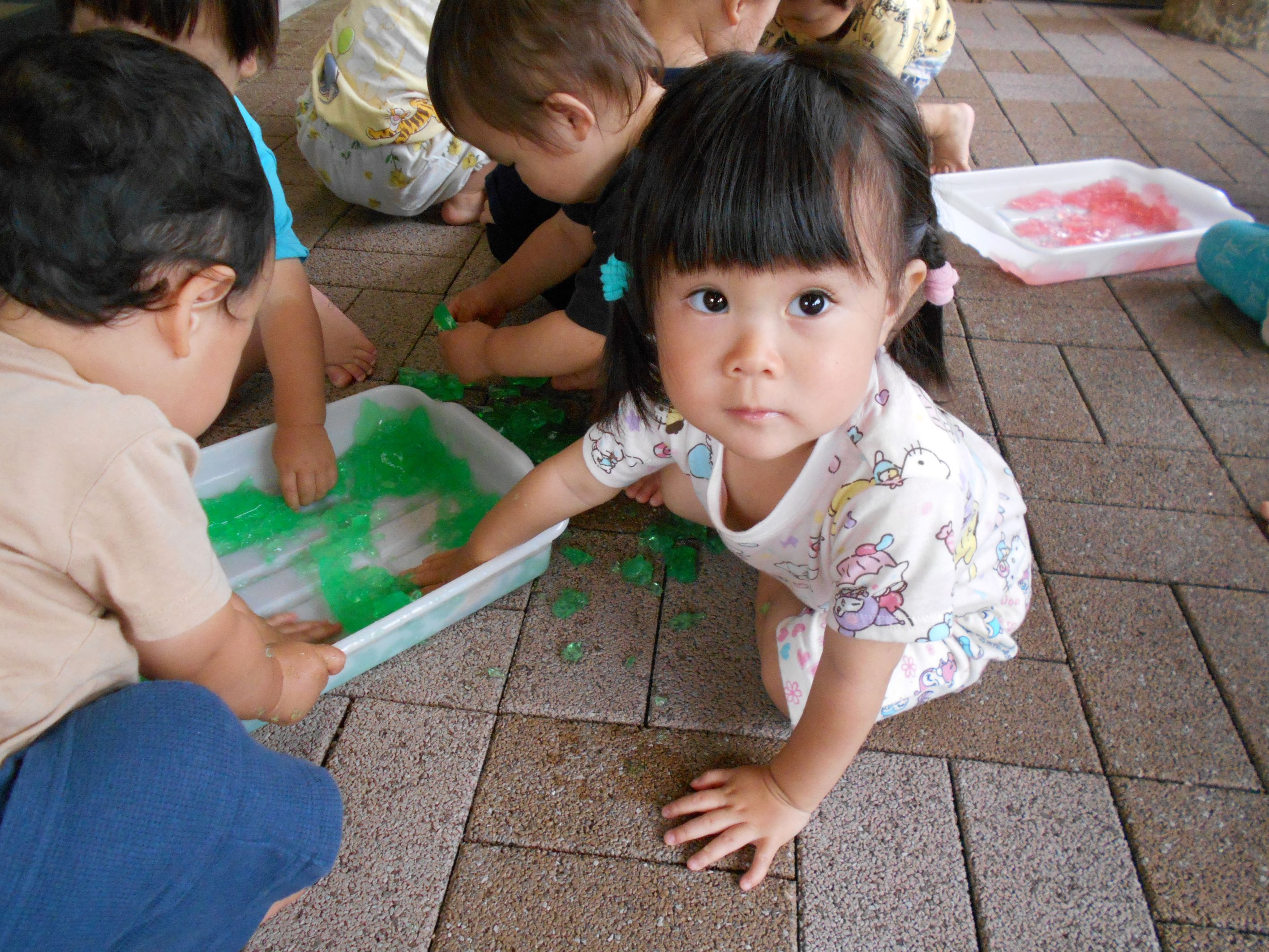 今日はふれあい交流の日。かに組のお部屋に遊びに行きました。テラスでは、一緒にボールを投げたり、絵本を見たりしました。寒天遊びに興味津々で、寒天を触るとギュッと握ったり、両手ですくったりして、感触を楽しんでいました。容器にいろいろな色の寒天を入れて、ゼリー作りも楽しんでいましたよ。