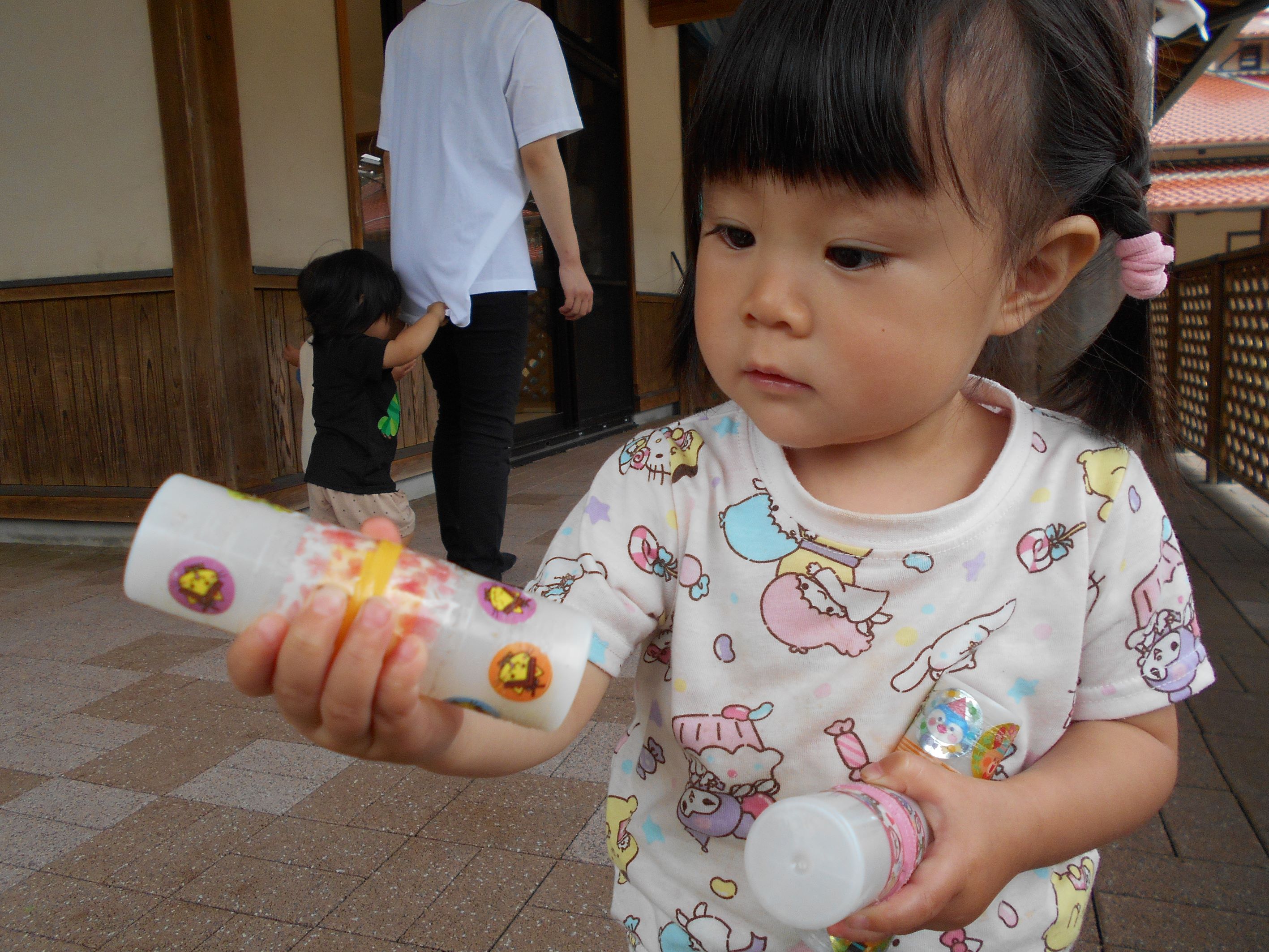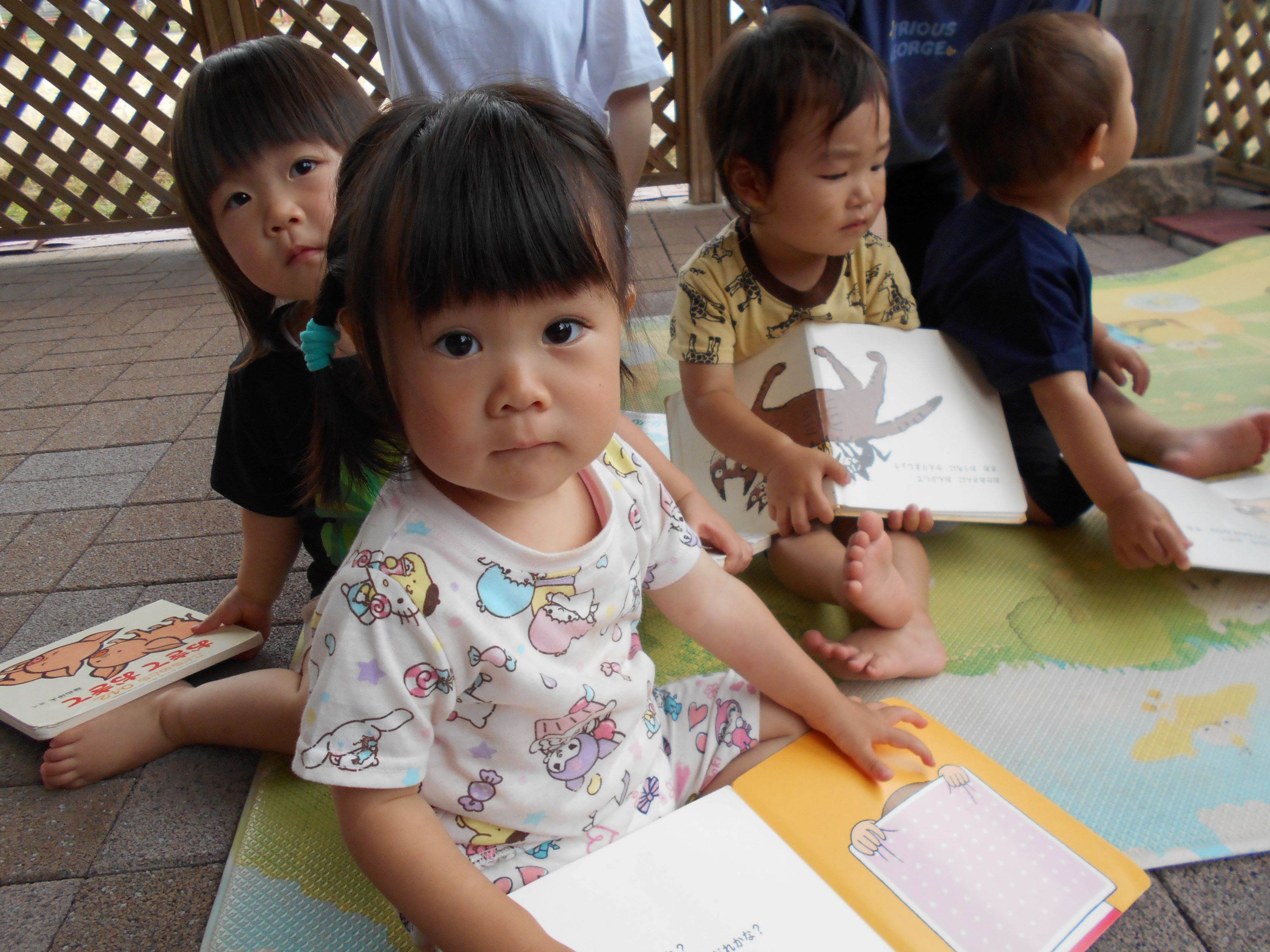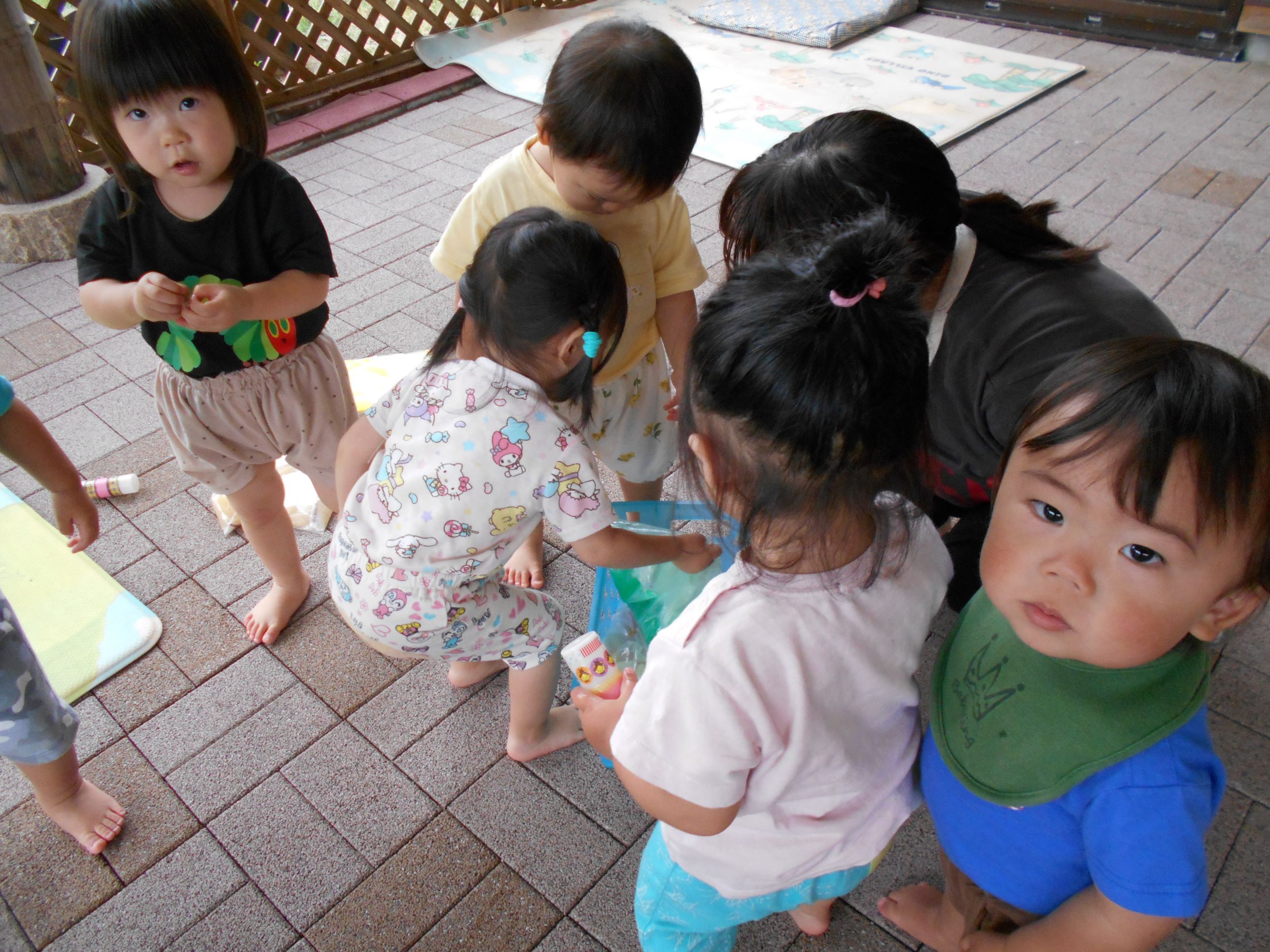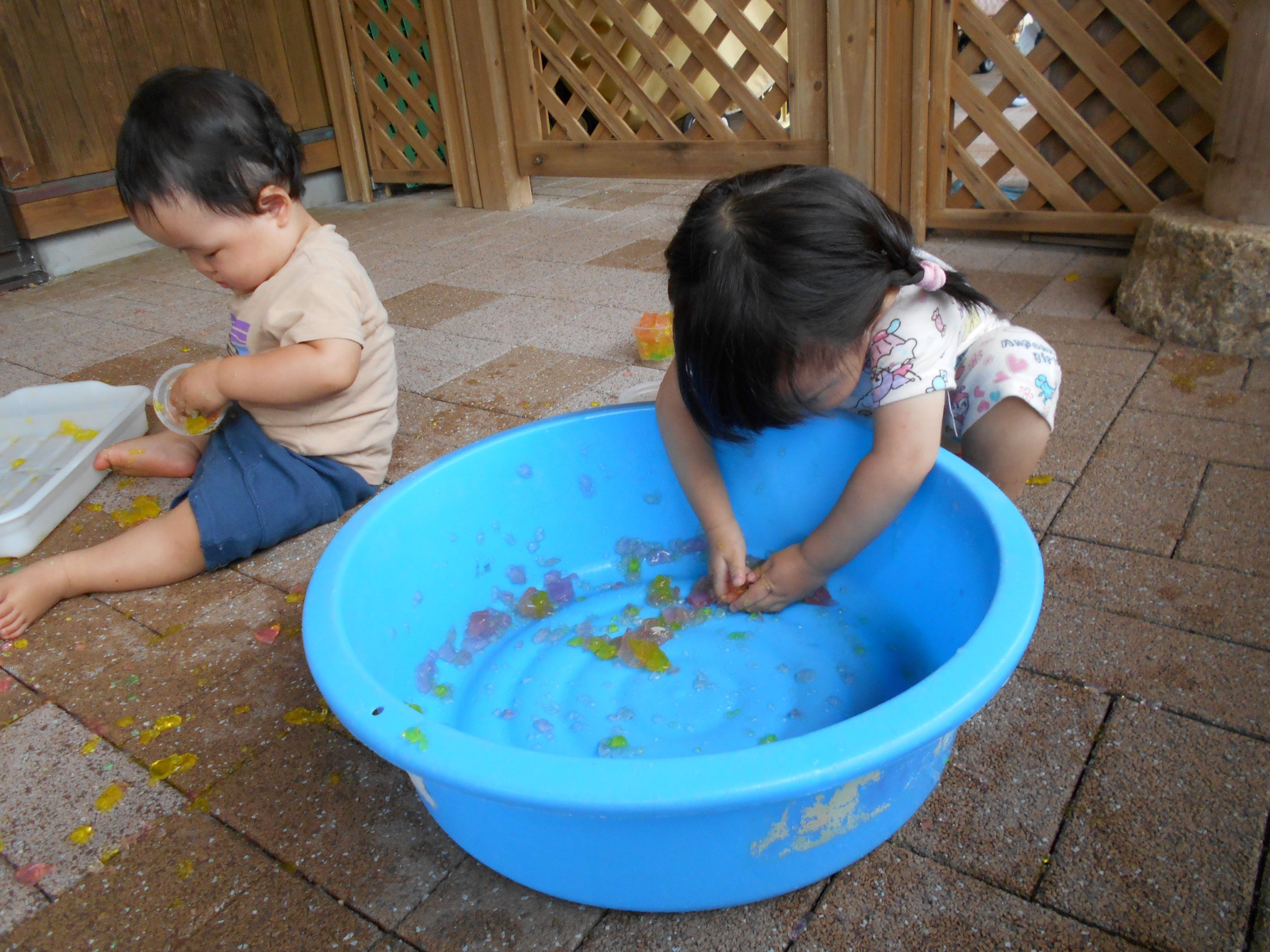 今日はふれあい交流の日。かに組のお部屋に遊びに行きました。テラスでは、一緒にボールを投げたり、絵本を見たりしました。寒天遊びに興味津々で、寒天を触るとギュッと握ったり、両手ですくったりして、感触を楽しんでいました。容器にいろいろな色の寒天を入れて、ゼリー作りも楽しんでいましたよ。