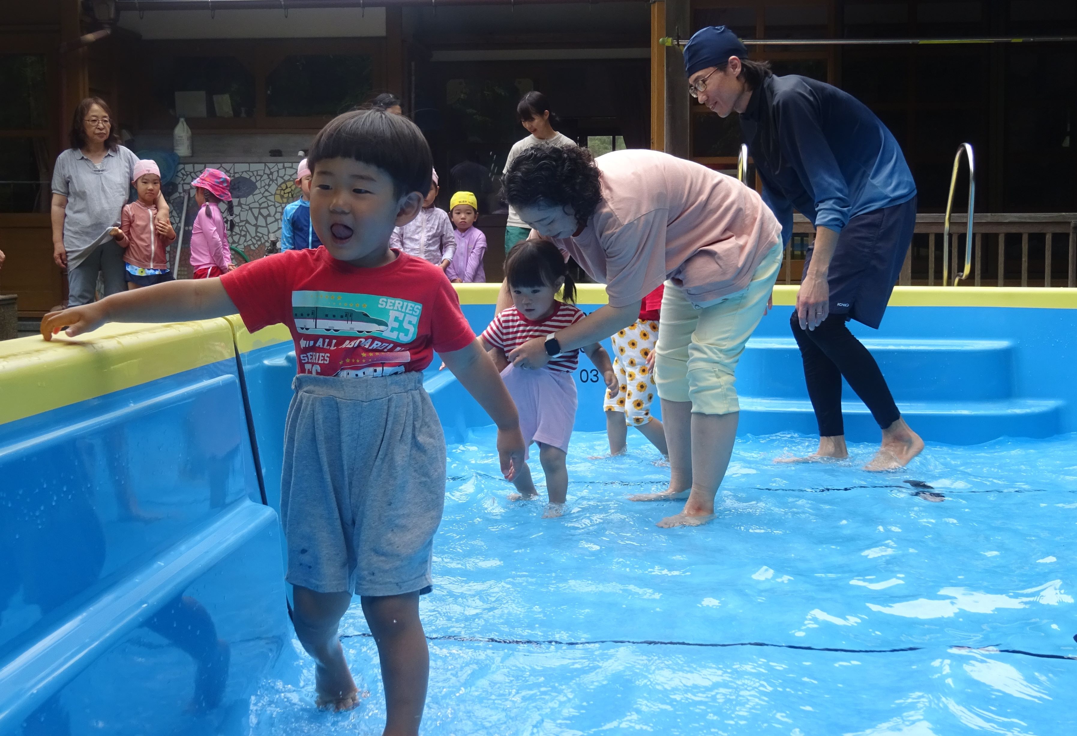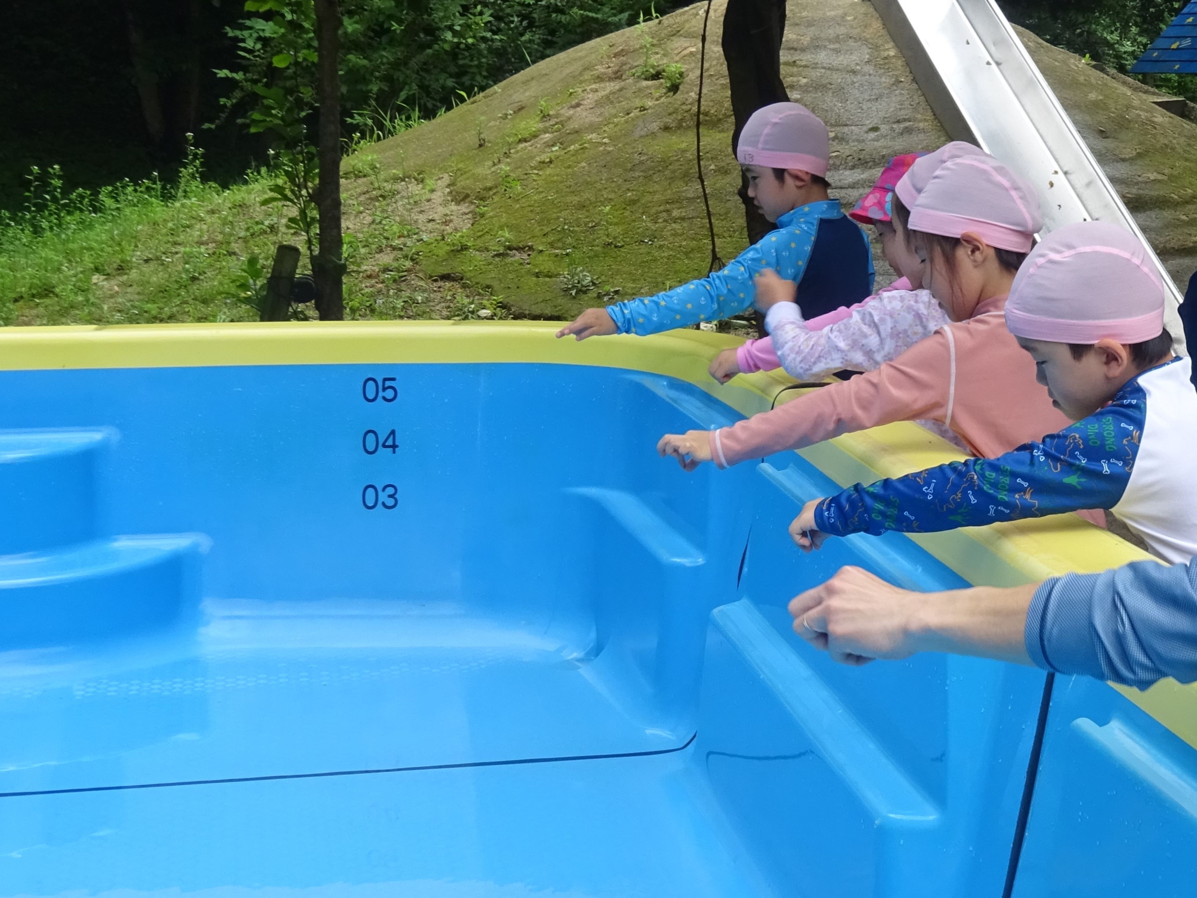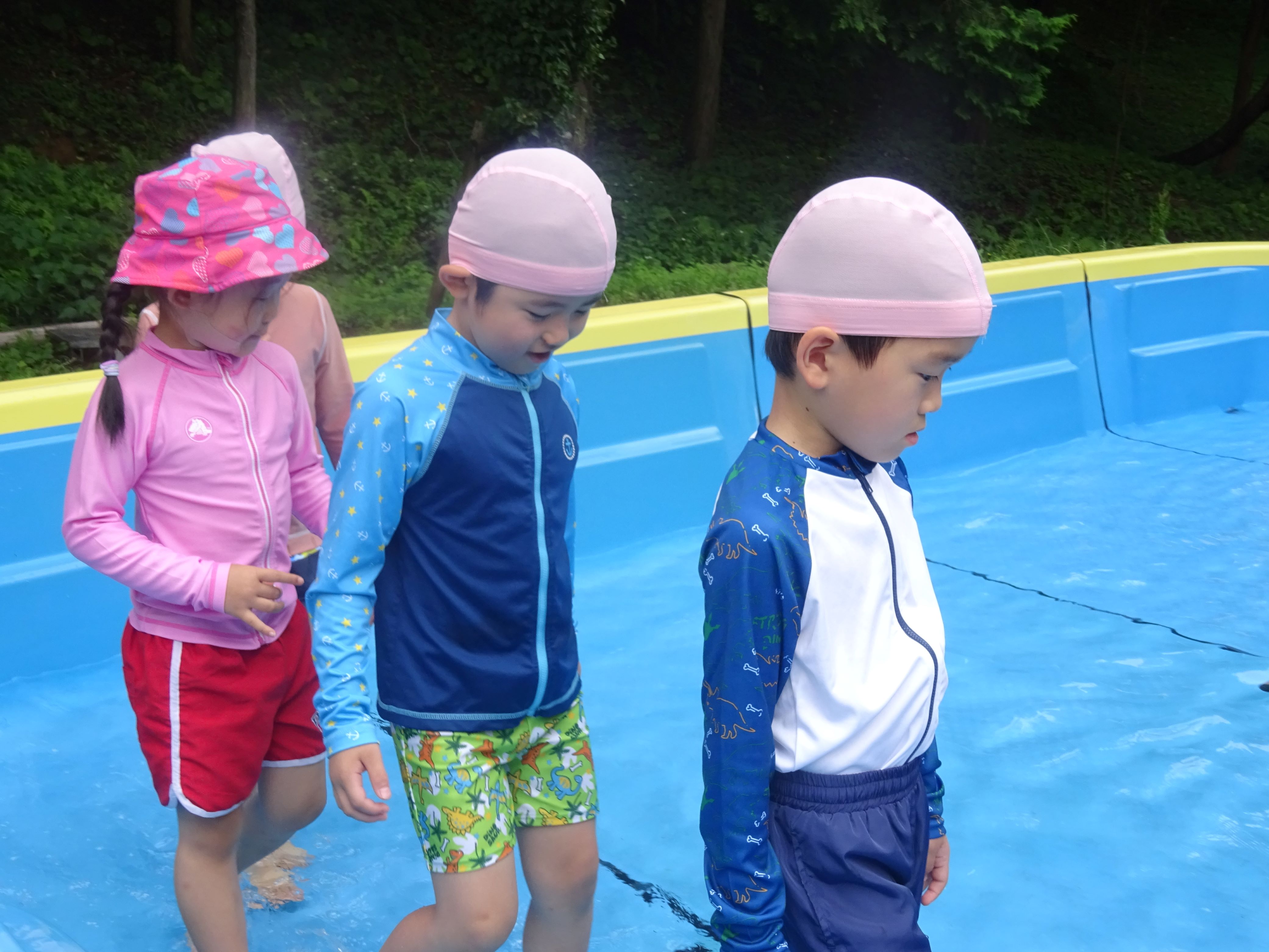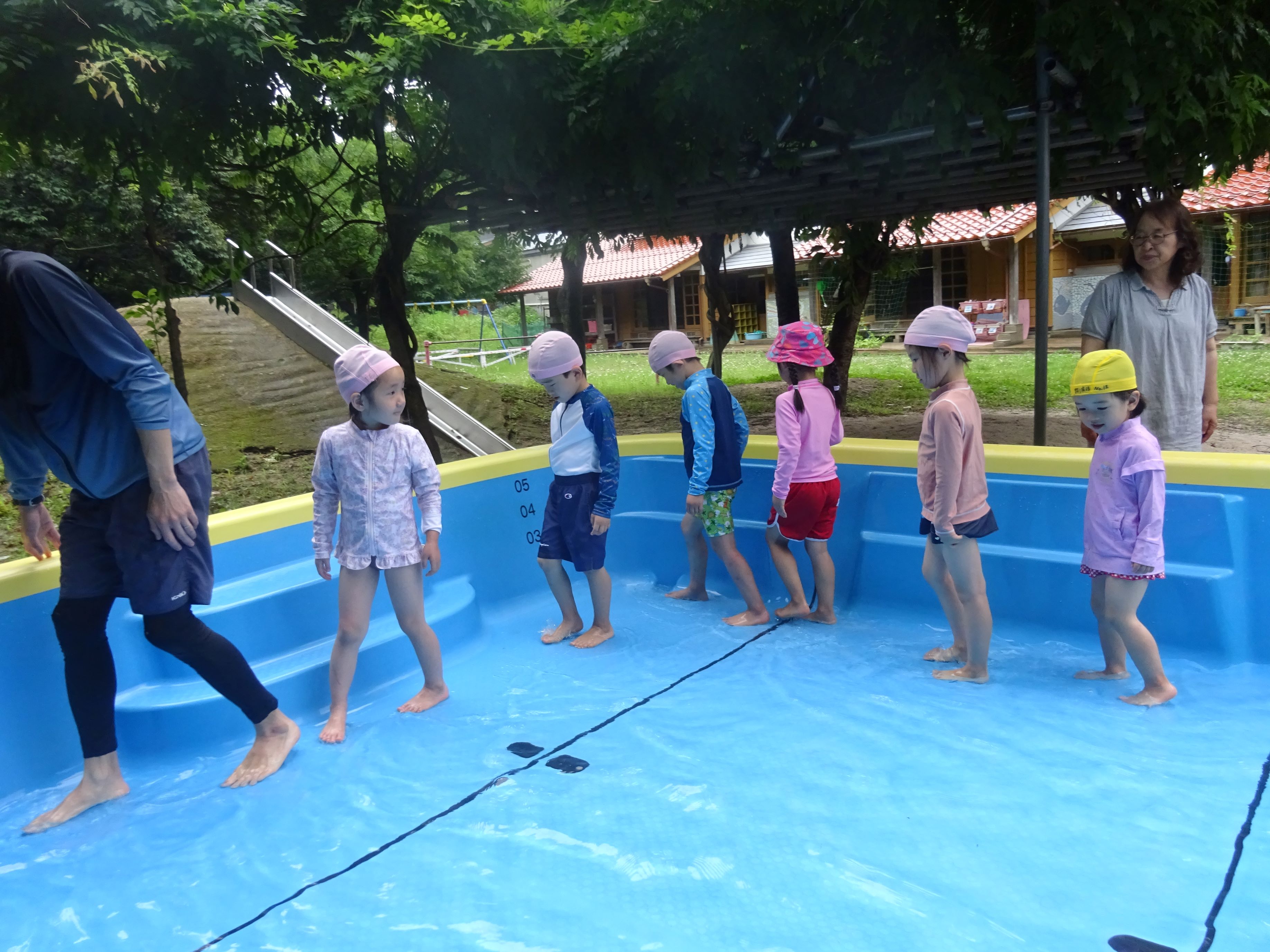まず、遊戯室に集まってプールに入る時の約束をみんなで確認しました。その後は所庭に出て、所長先生と年長児が水の神様にご挨拶をし、安全にプールや水遊びが出来るよう祈願をしました。朝は降っていた雨もこの時には上がり、プールの中を歩くことが出来て子ども達も「きもちいいね」と嬉しそうでした。