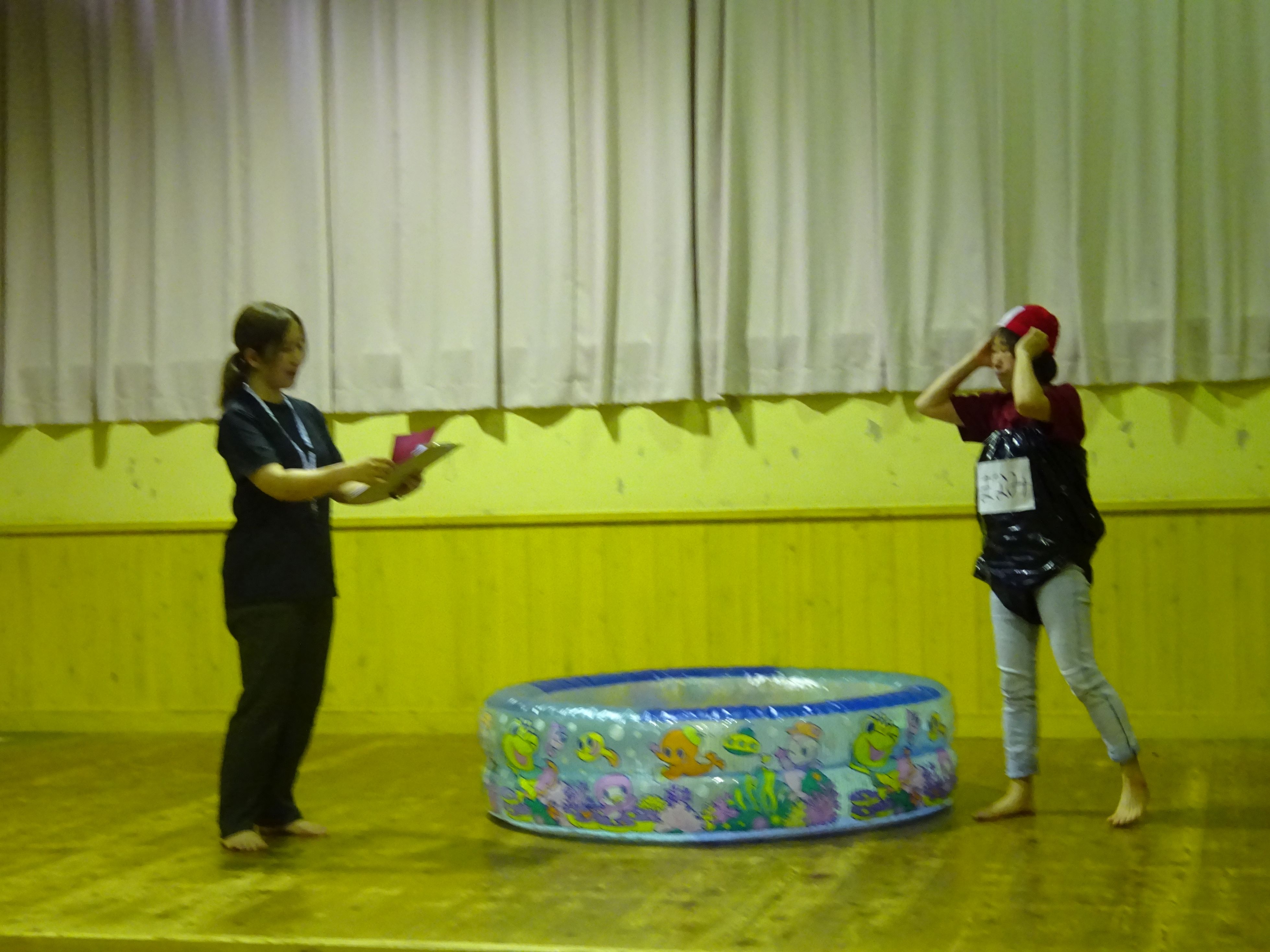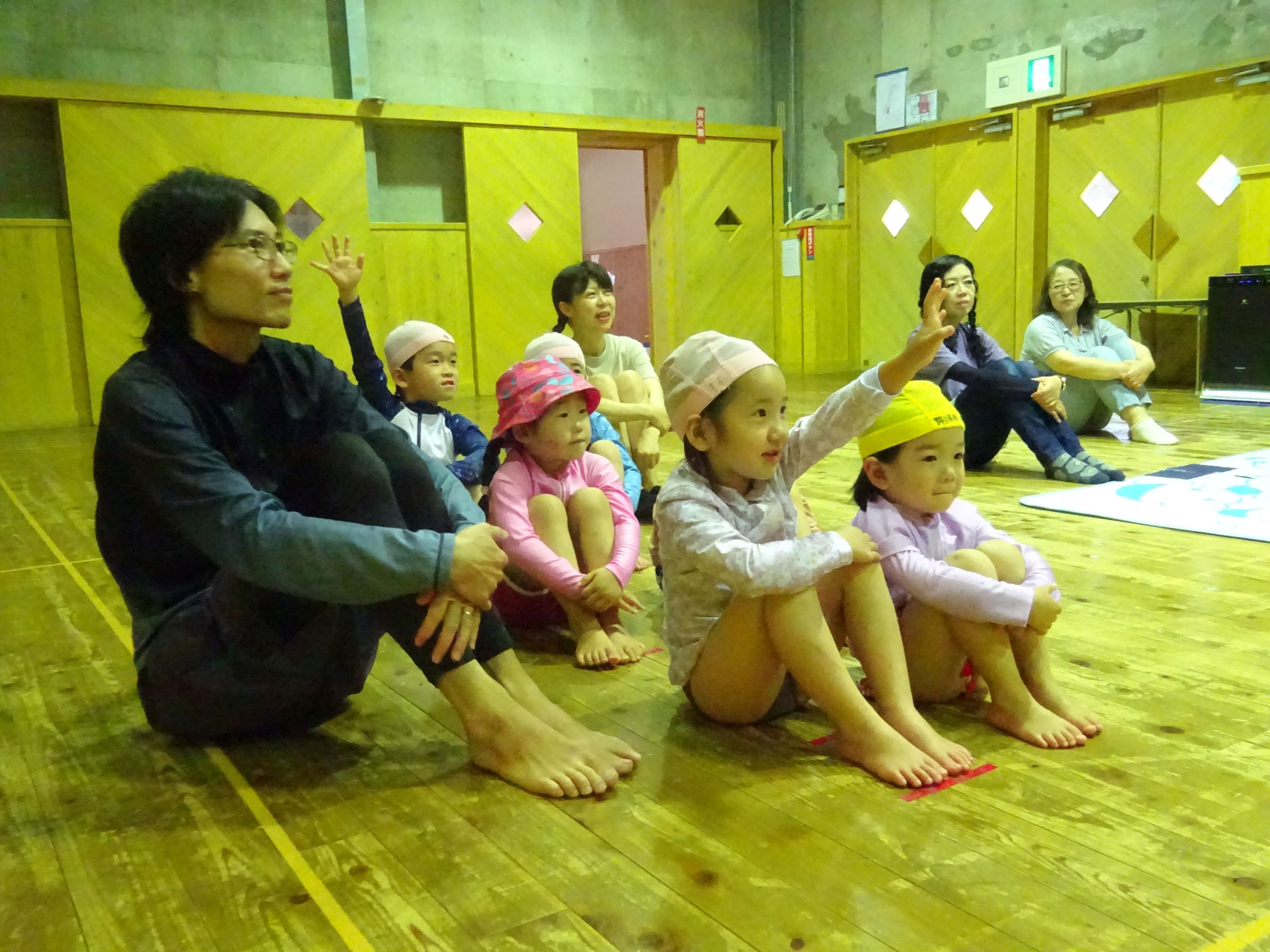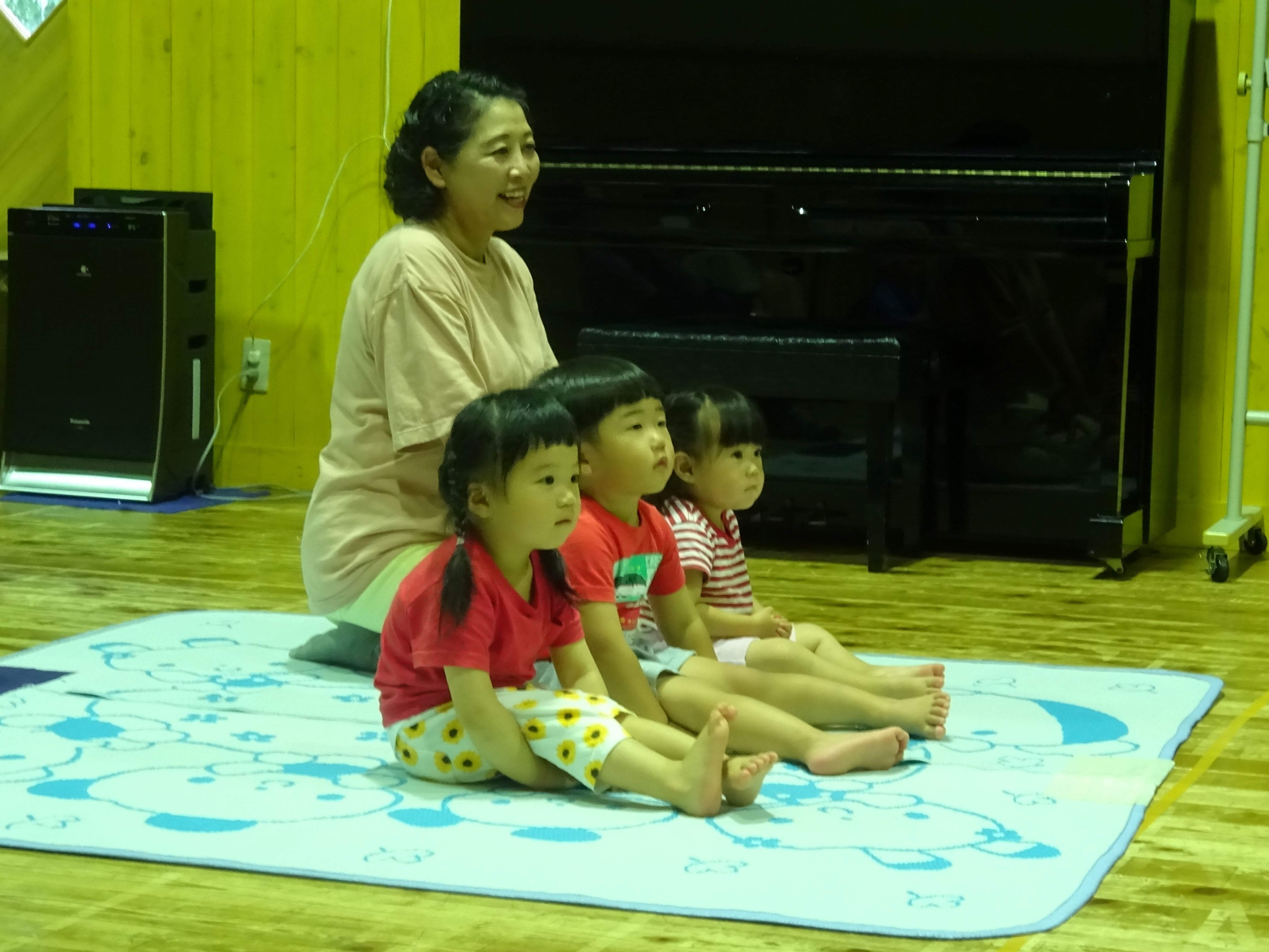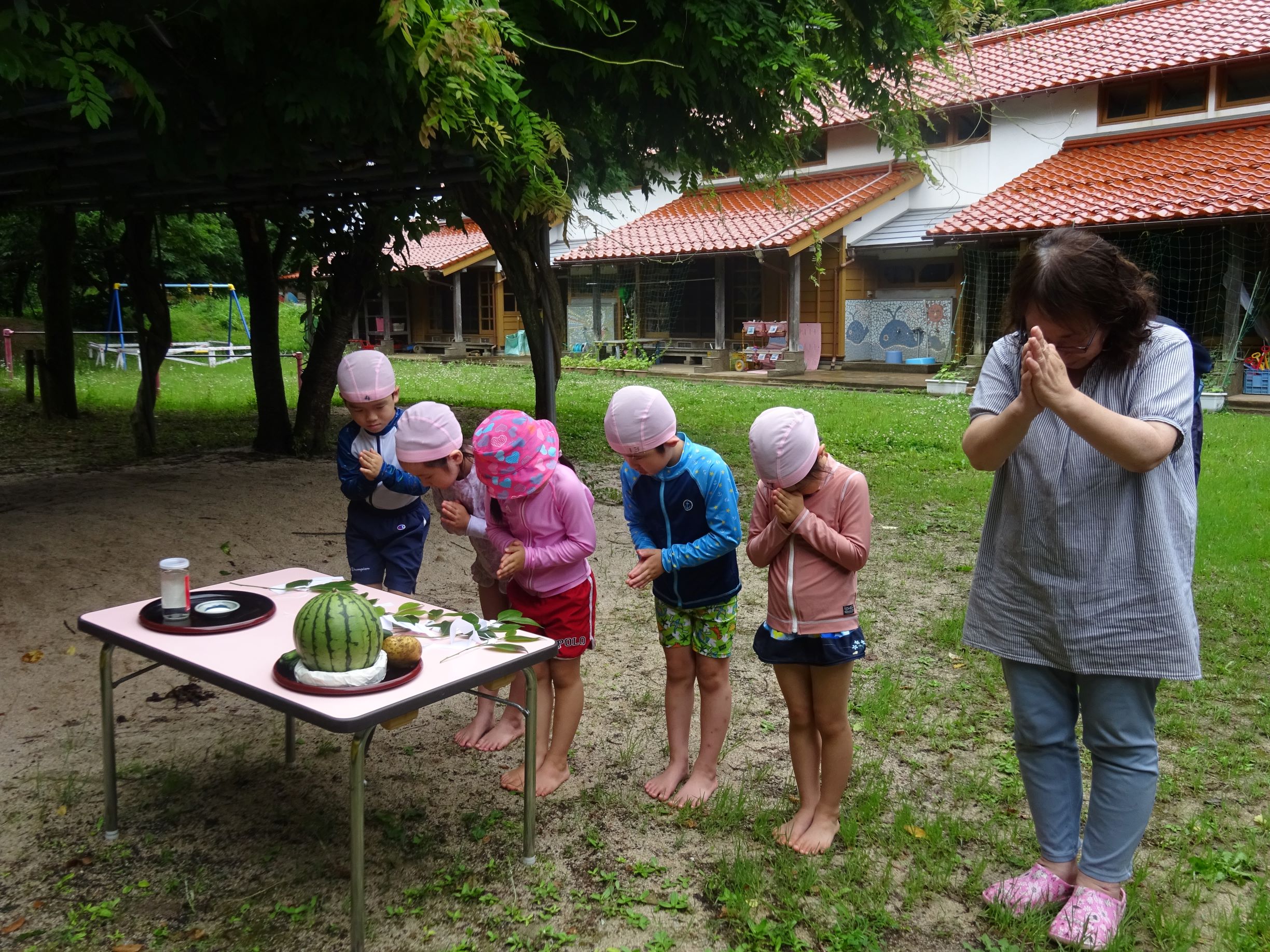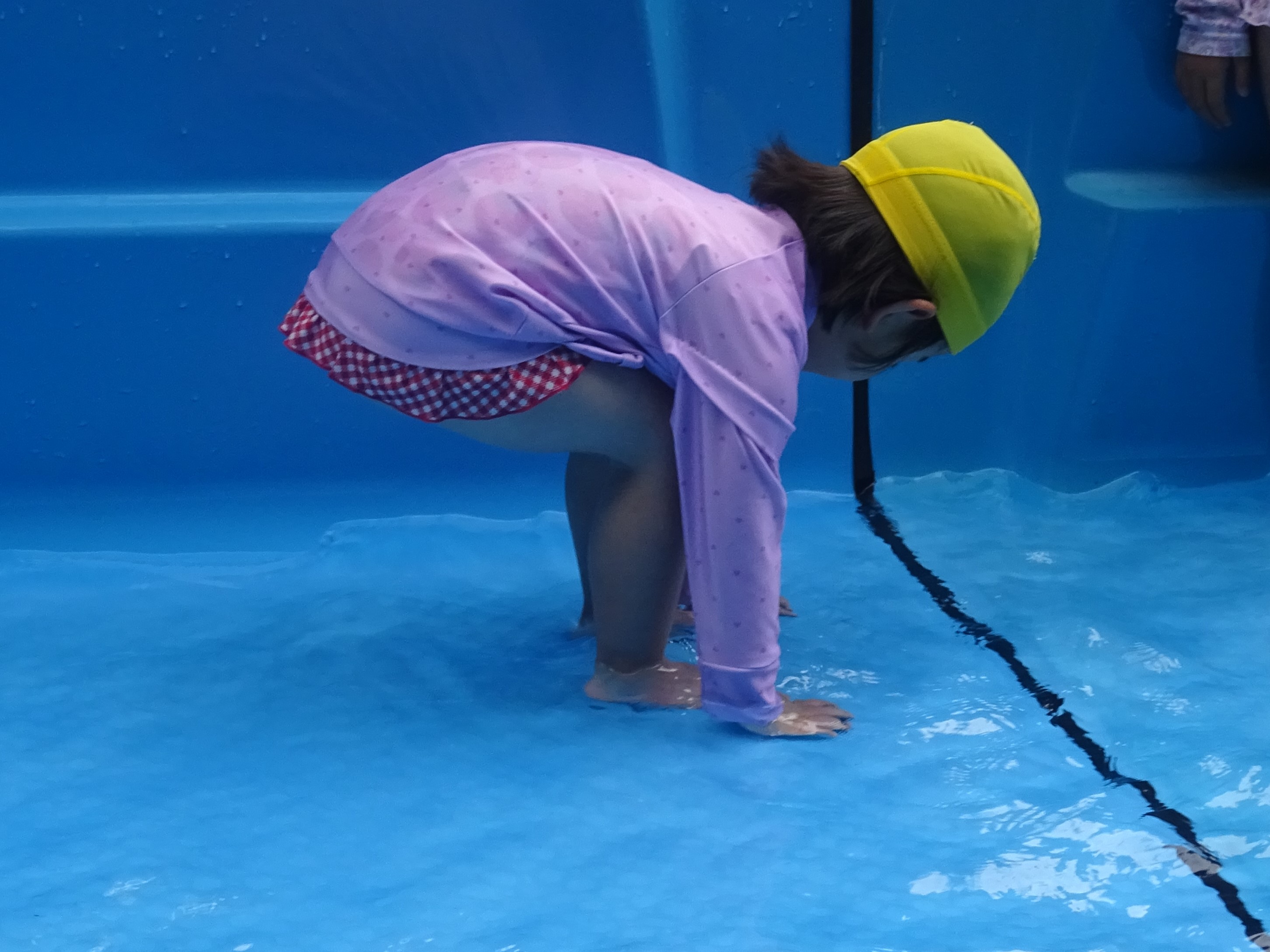まず、遊戯室に集まってプールに入る時の約束をみんなで確認しました。その後は所庭に出て、所長先生と年長児が水の神様にご挨拶をし、安全にプールや水遊びが出来るよう祈願をしました。朝は降っていた雨もこの時には上がり、プールの中を歩くことが出来て子ども達も「きもちいいね」と嬉しそうでした。