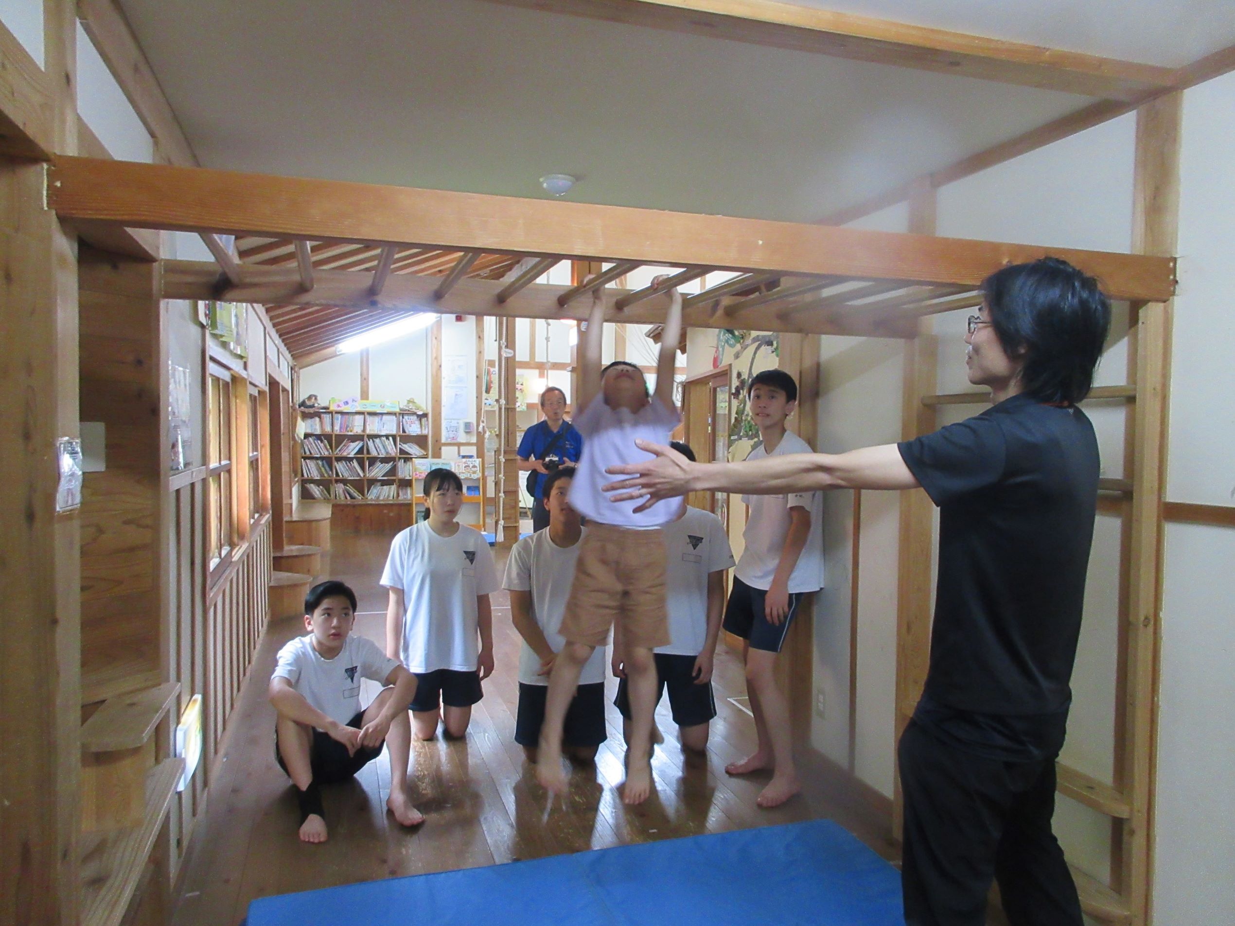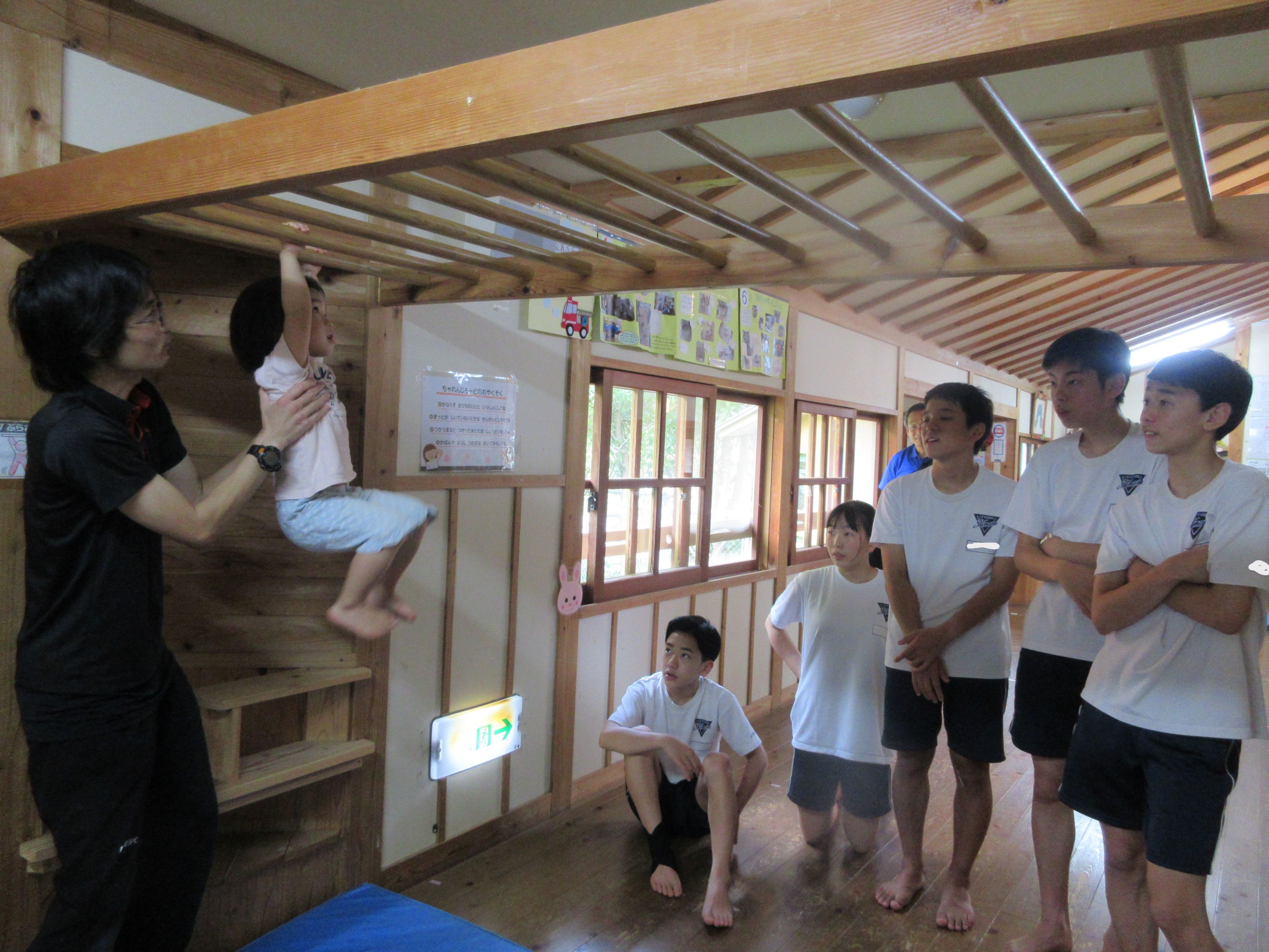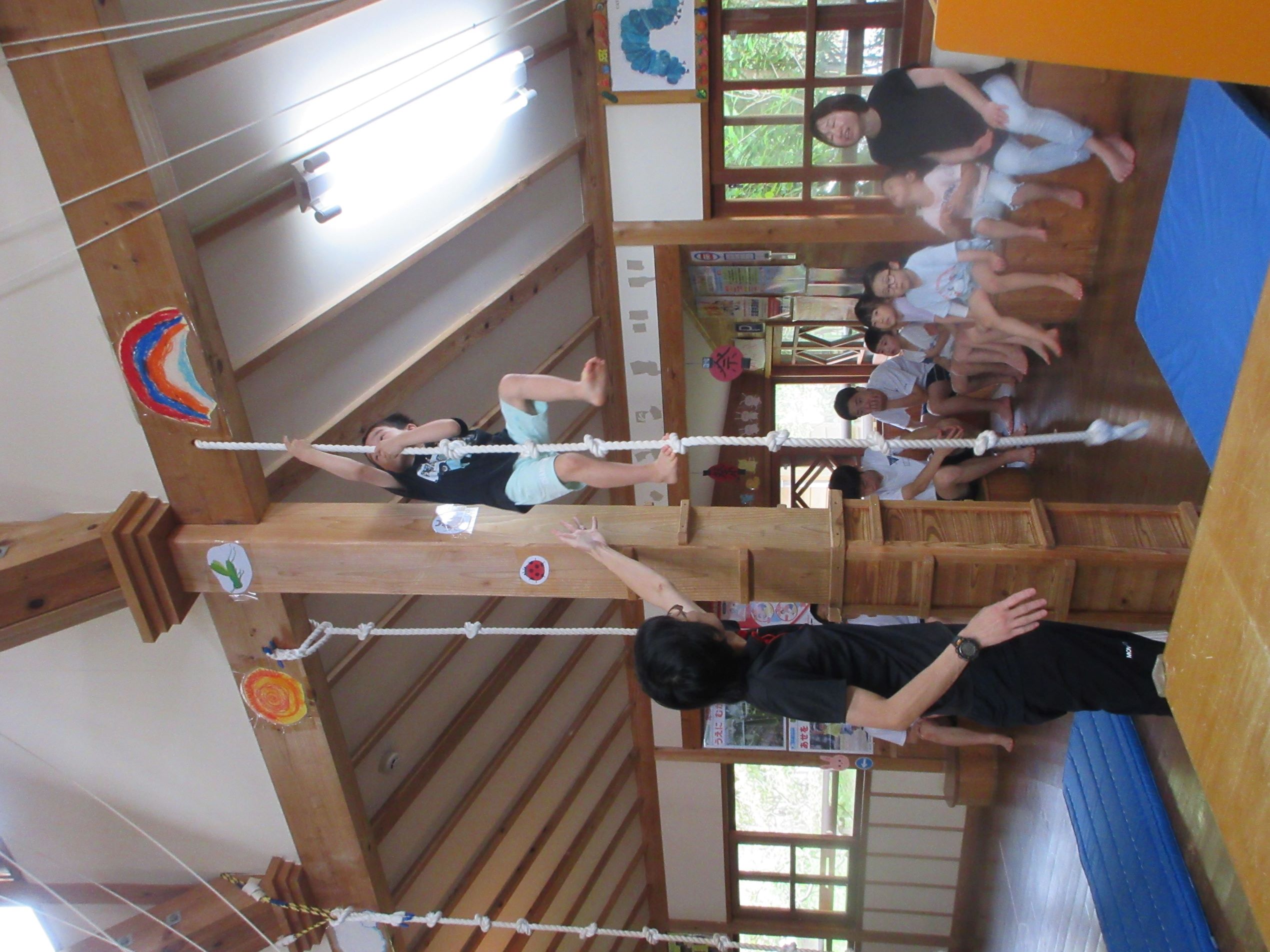 お兄さんやお姉さんにロープ登りや、うんていをするところも見てもらいました。「がんばれー」「すごーい」と声かけをしてもらってとても励みになったようです。