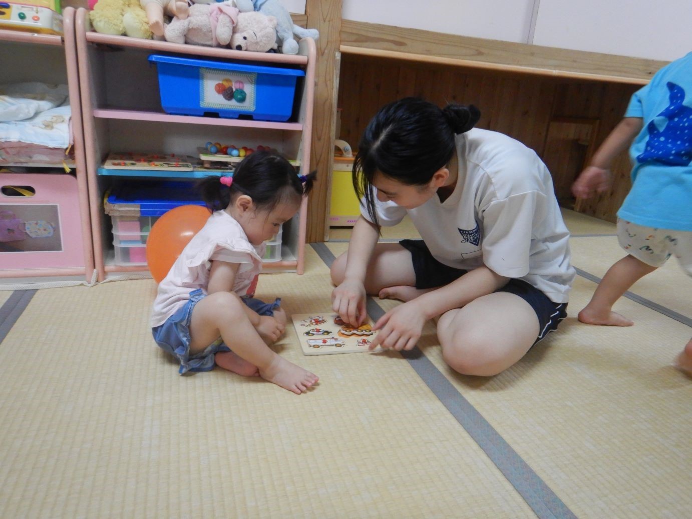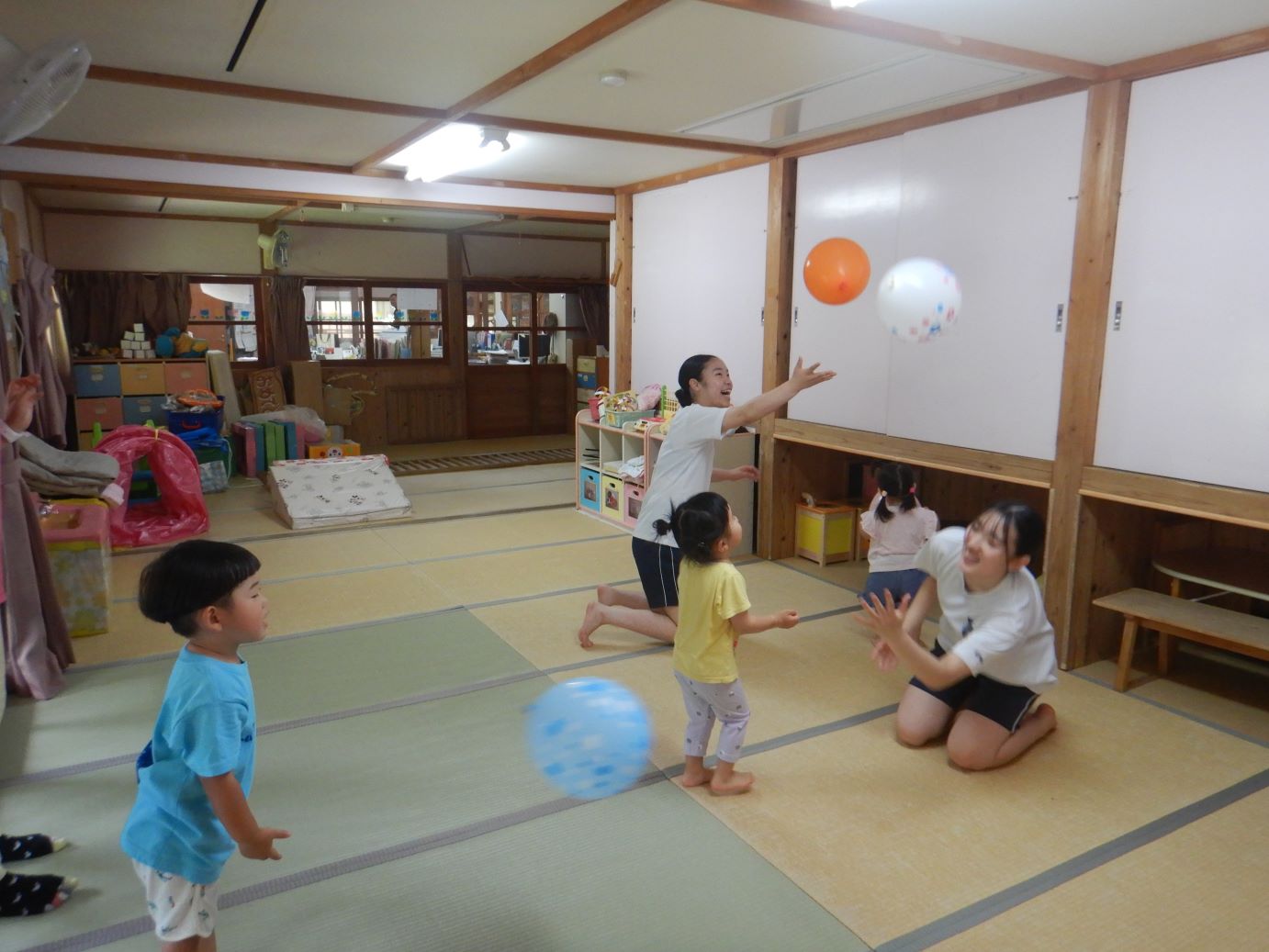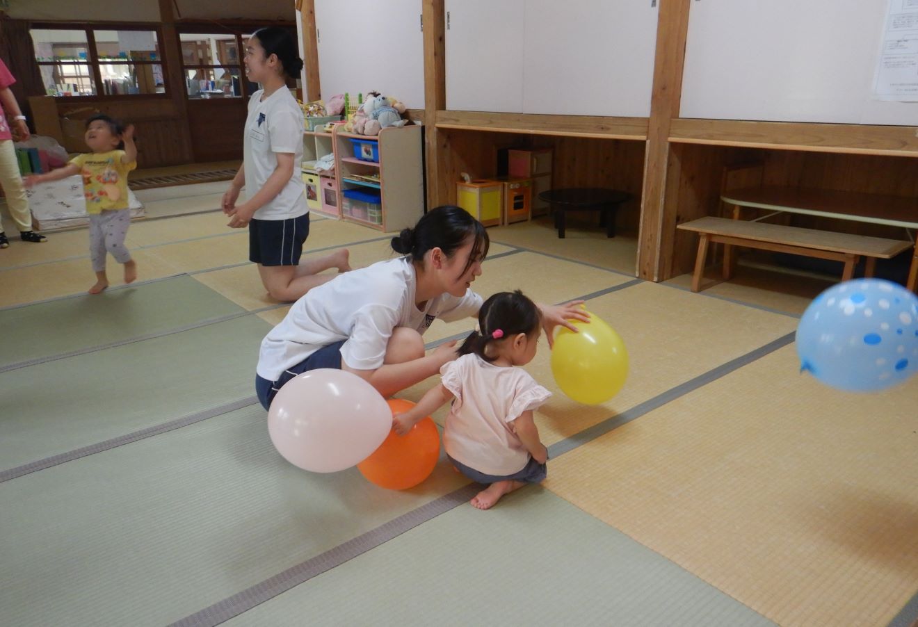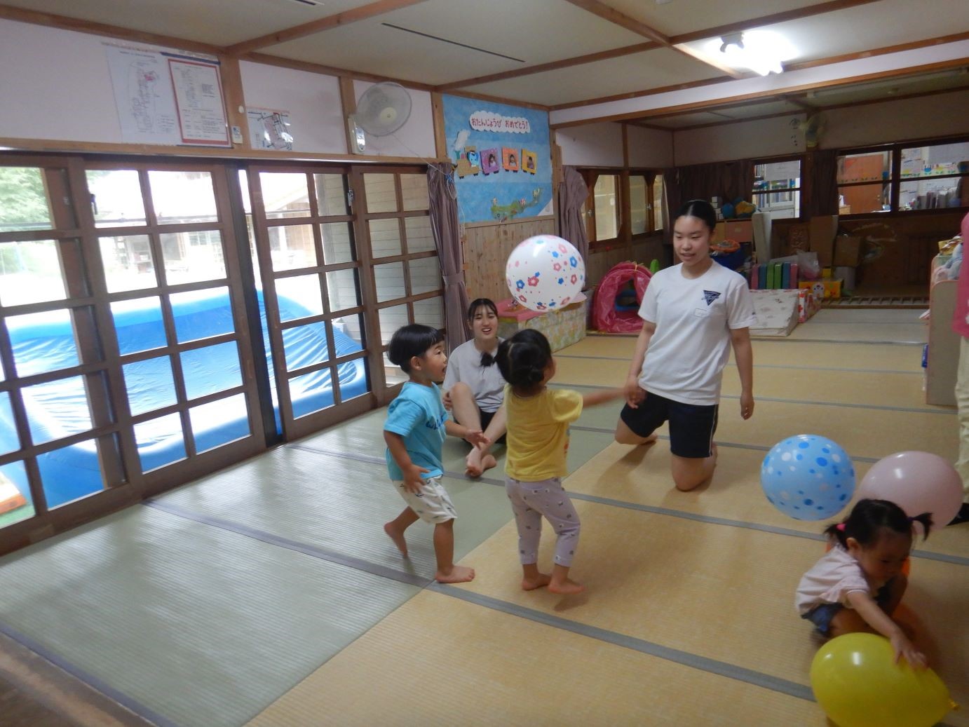 風船が出てくると、お姉さんや中学校の先生を相手に打ち合って楽しみました。パズルを一緒にしたお友達もいました。