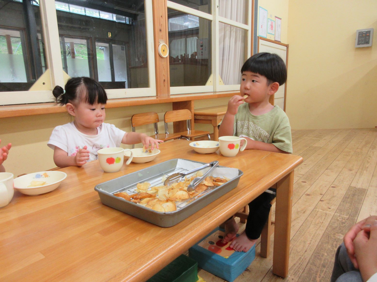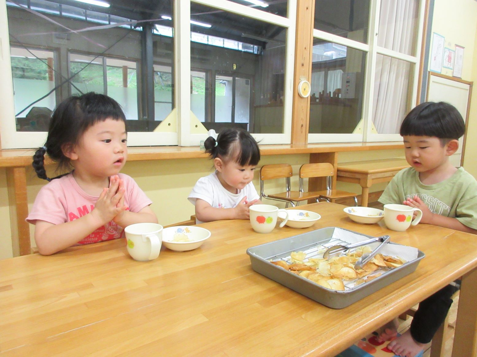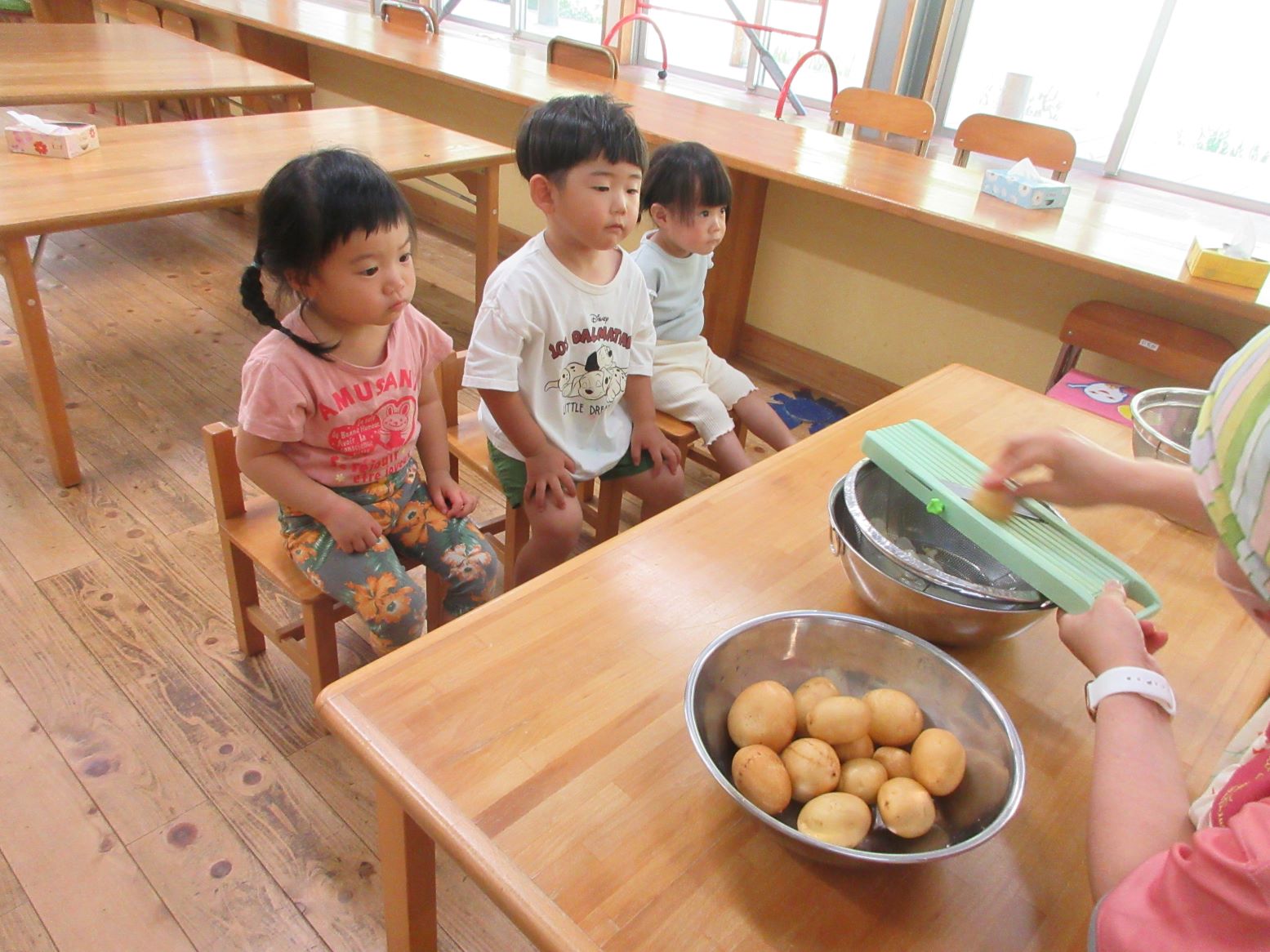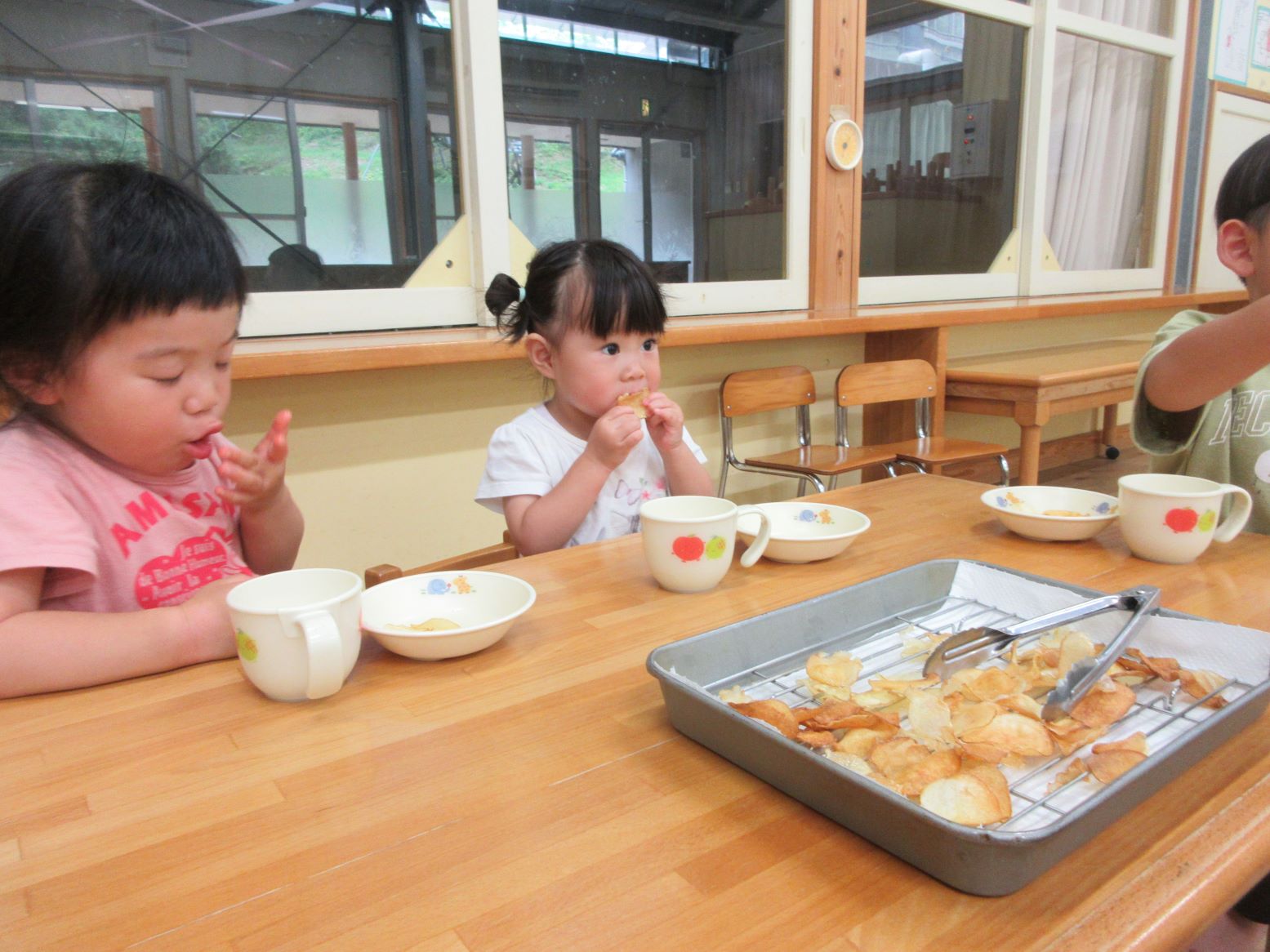 担任がスライサーでスライスする様子を見たり、スライスした薄いじゃが芋を触ってみたりしました。お昼寝から起きて、給食の先生が油で揚げてくださる様子を見ると「はやくたべたい~」と満面の笑顔!早速おやつでいただきました。「かりかりしてる」「おいしー」「おかわりある?」と喜んで食べていました。にじ・そら組さんにも食べてもらうと「お店で買ったポテトチップスよりおいしいー」と嬉しい言葉が聞かれました。