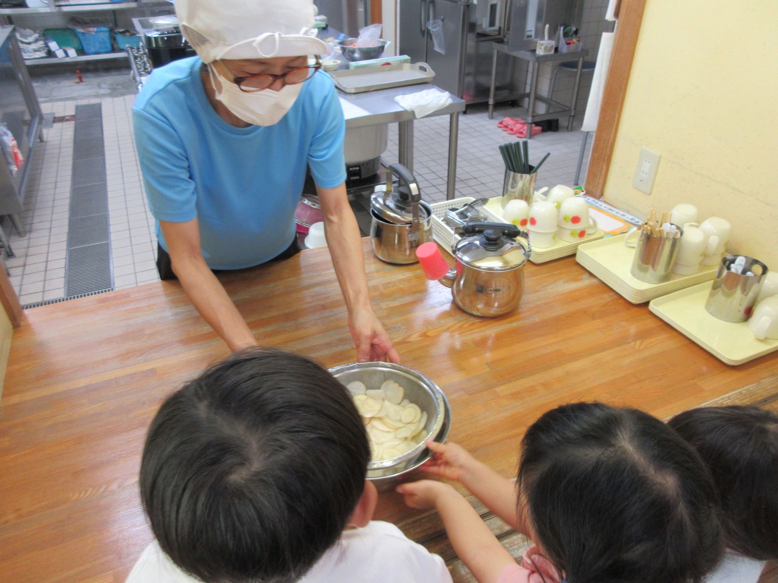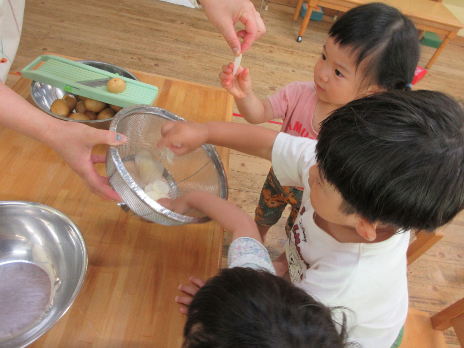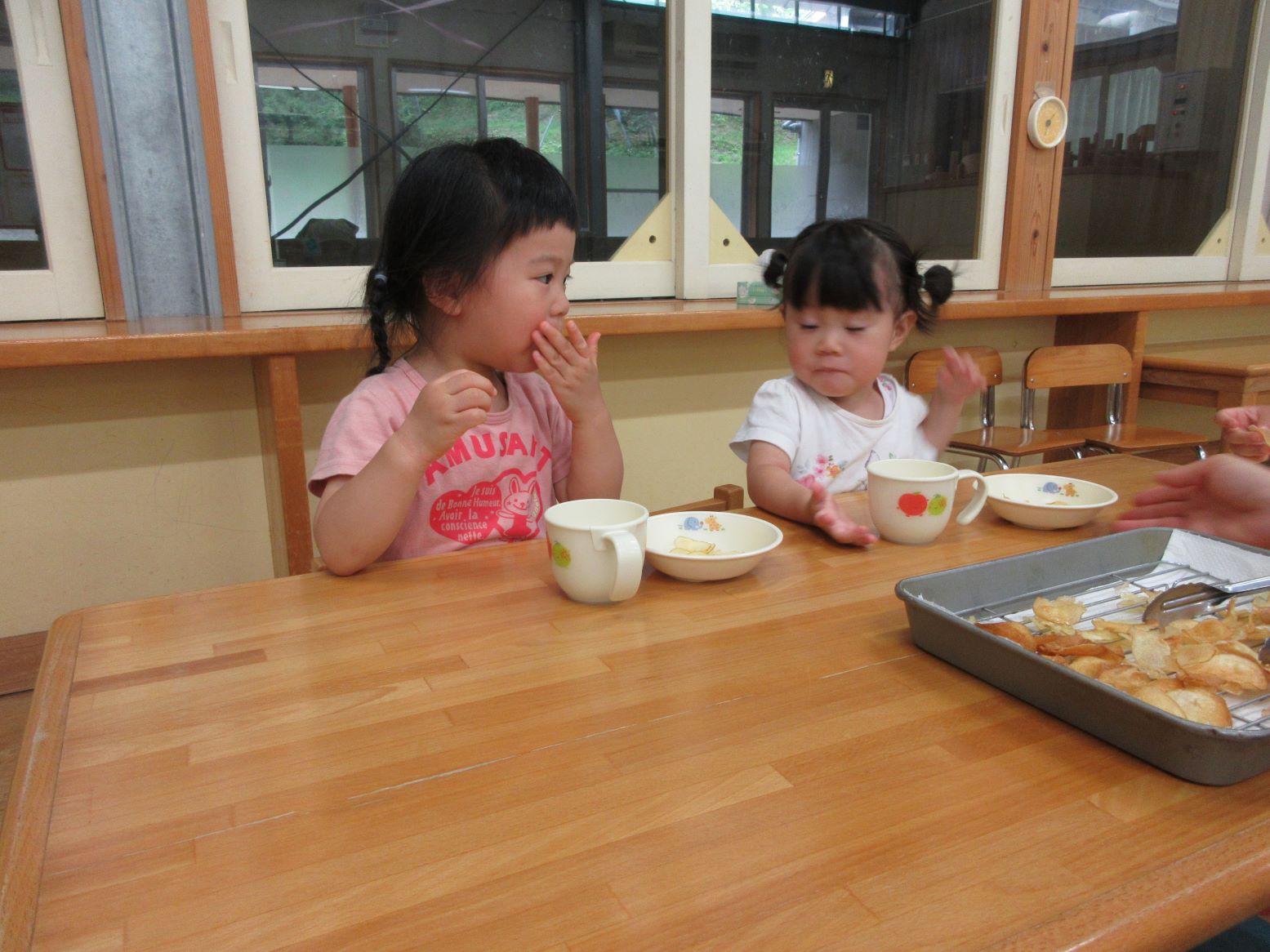 担任がスライサーでスライスする様子を見たり、スライスした薄いじゃが芋を触ってみたりしました。お昼寝から起きて、給食の先生が油で揚げてくださる様子を見ると「はやくたべたい~」と満面の笑顔!早速おやつでいただきました。「かりかりしてる」「おいしー」「おかわりある?」と喜んで食べていました。にじ・そら組さんにも食べてもらうと「お店で買ったポテトチップスよりおいしいー」と嬉しい言葉が聞かれました。