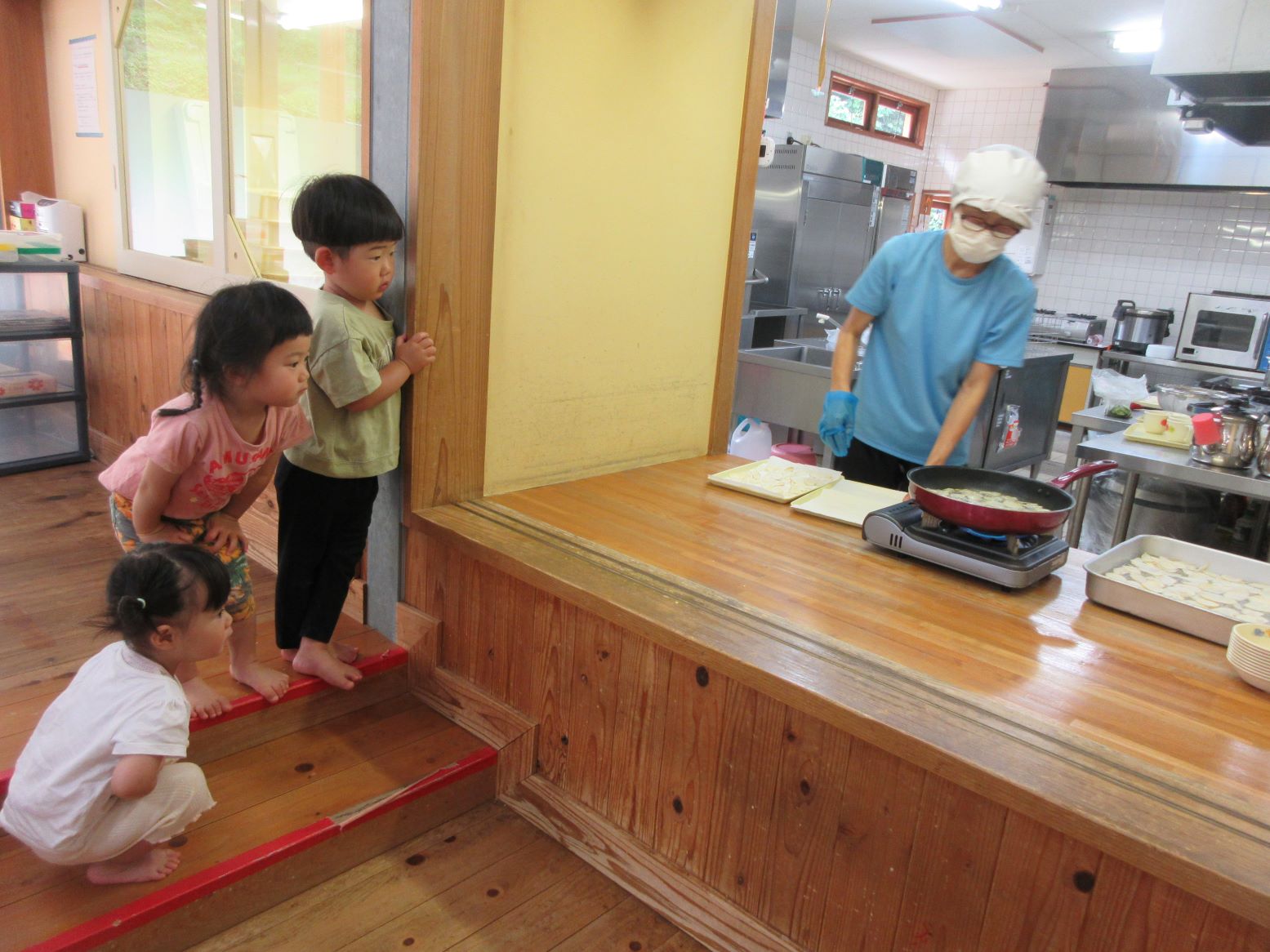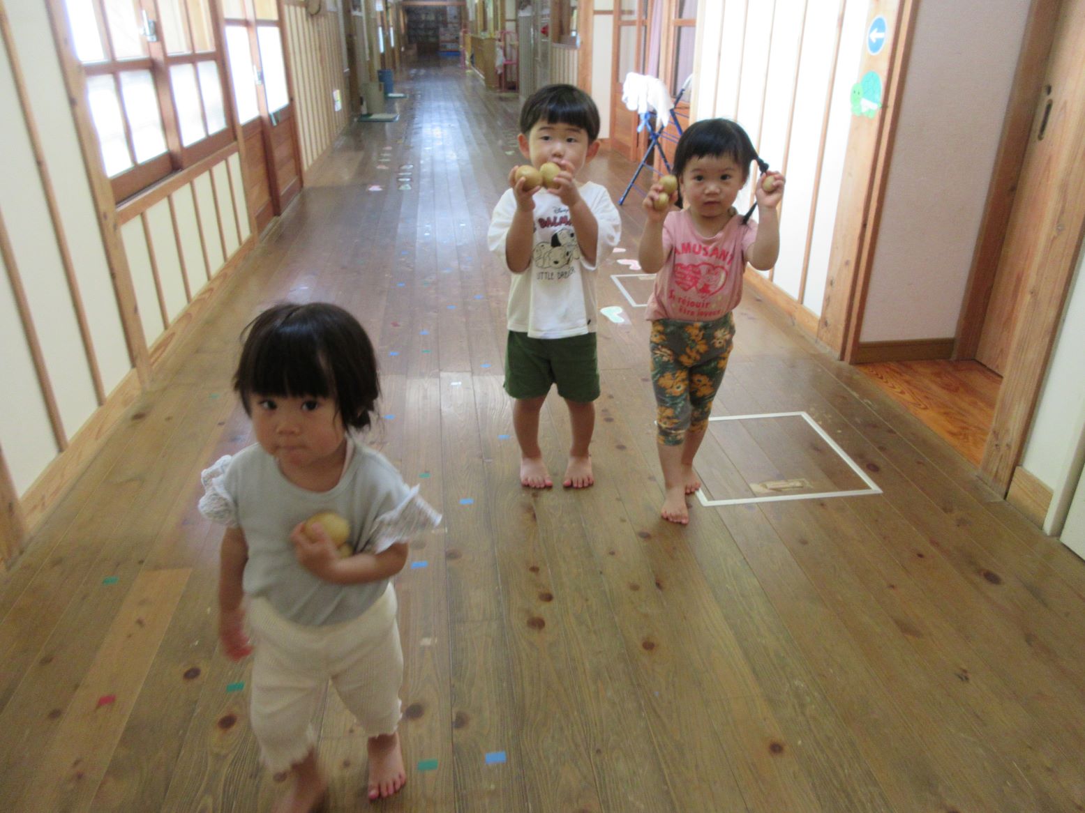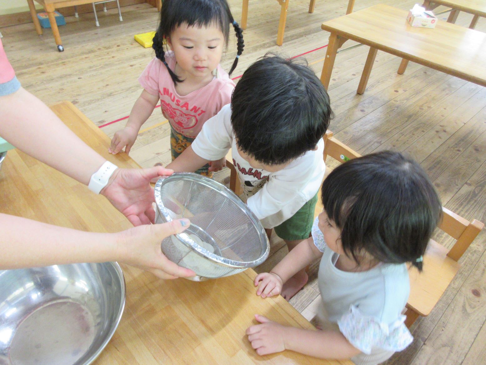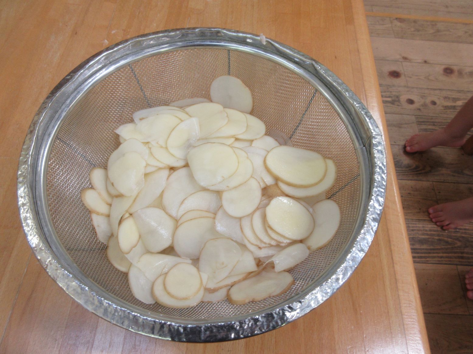 担任がスライサーでスライスする様子を見たり、スライスした薄いじゃが芋を触ってみたりしました。お昼寝から起きて、給食の先生が油で揚げてくださる様子を見ると「はやくたべたい~」と満面の笑顔!早速おやつでいただきました。「かりかりしてる」「おいしー」「おかわりある?」と喜んで食べていました。にじ・そら組さんにも食べてもらうと「お店で買ったポテトチップスよりおいしいー」と嬉しい言葉が聞かれました。