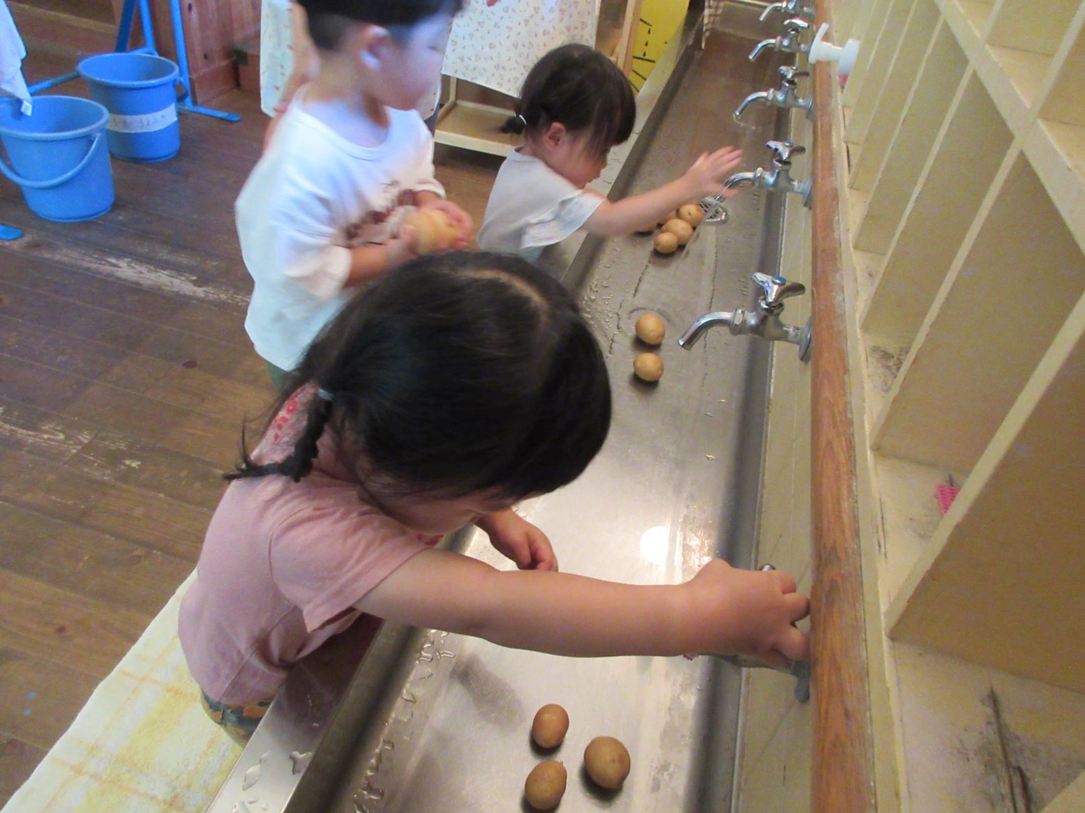 子ども達は収穫したじゃが芋から、選んで流し台まで運び、流水できれいに洗いました。