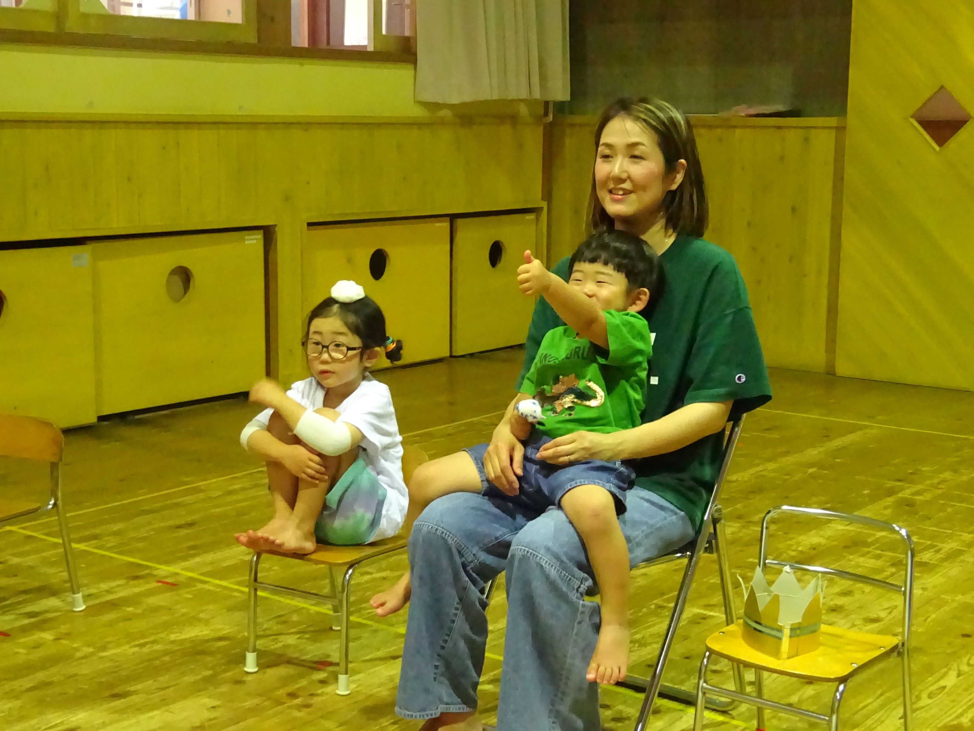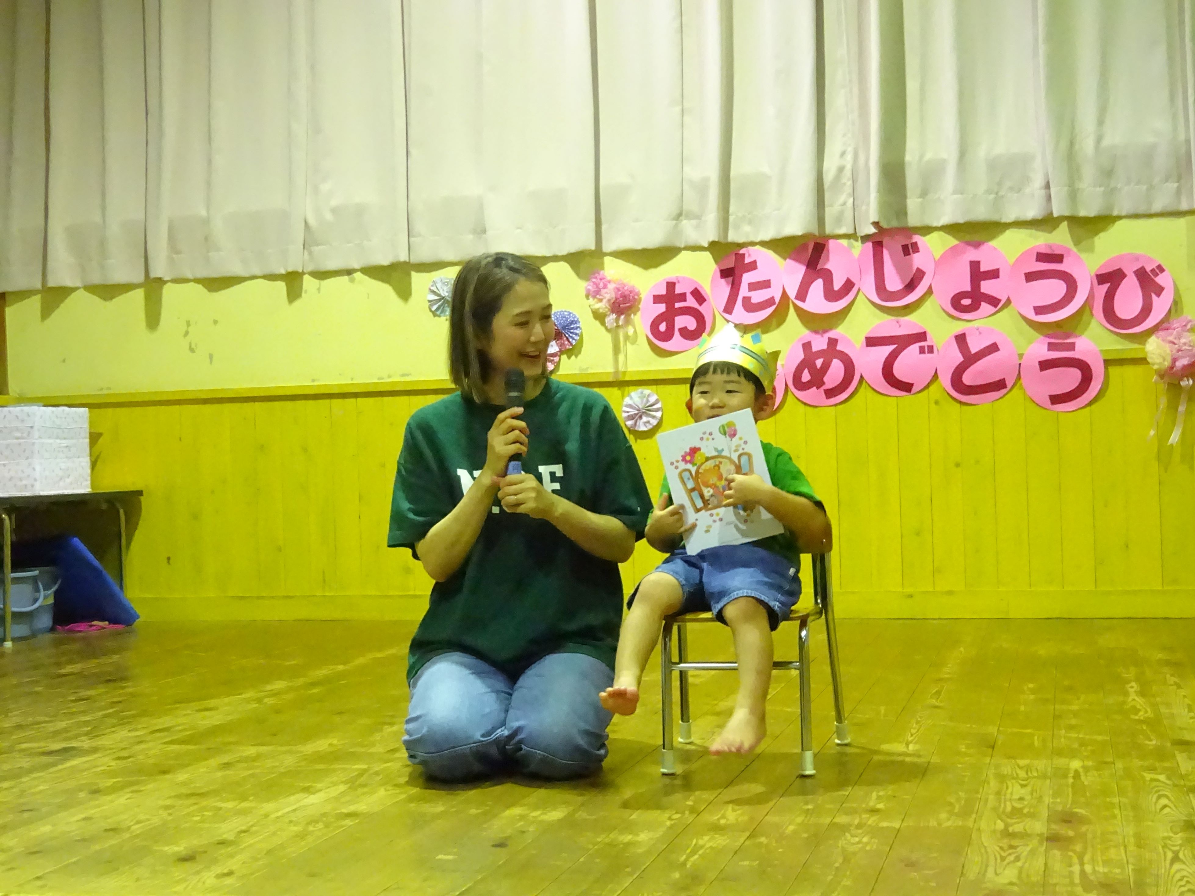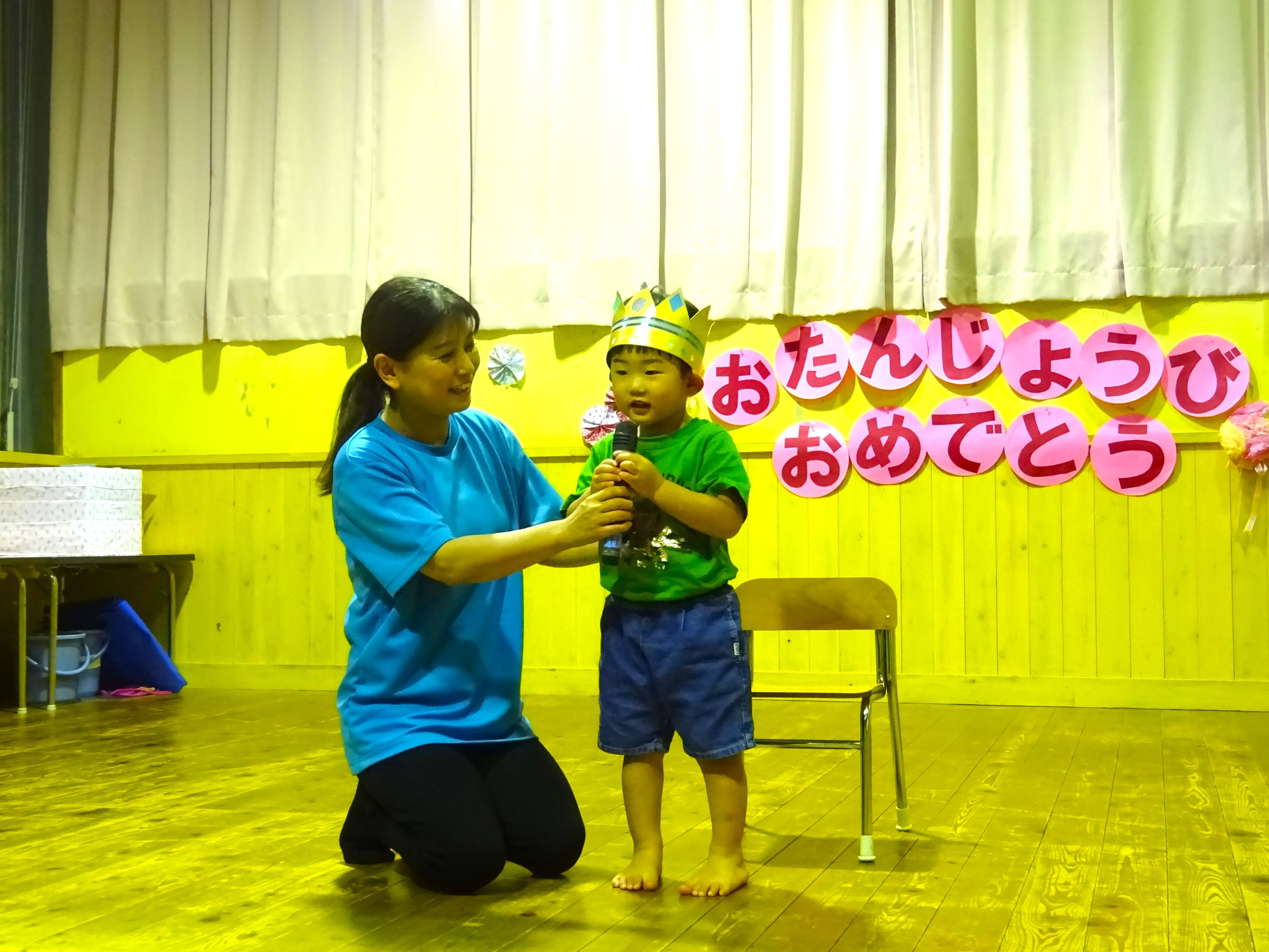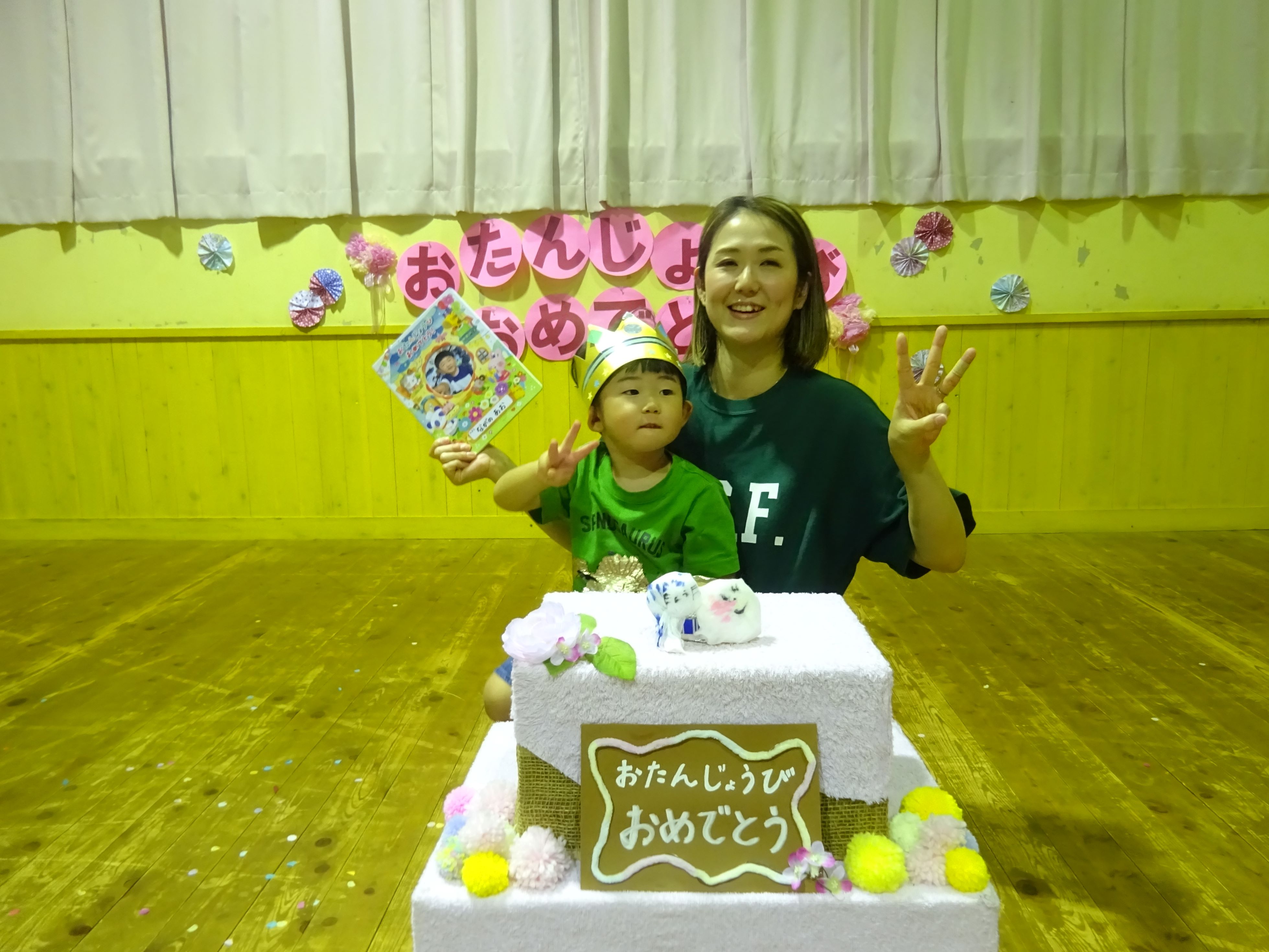 「おたんじょうかいはいつ?」と楽しみにしていた誕生児さん。今日は、お母さんをお招きし、みんなでお祝いをしました。いつもは、恥ずかしがり屋さんですが、今日は堂々とステージの上に上がり、自己紹介や好きなことのお話をうれしそうにしてくれました。三歳になり、お兄さんらしくなったと感じられた姿でした。お母さんから名前の由来や生まれた時のエピソードを聞き、この野波の自然の中で、すくすくと成長していって欲しいというご家族の思いを知り、あたたかい気持ちになりました。