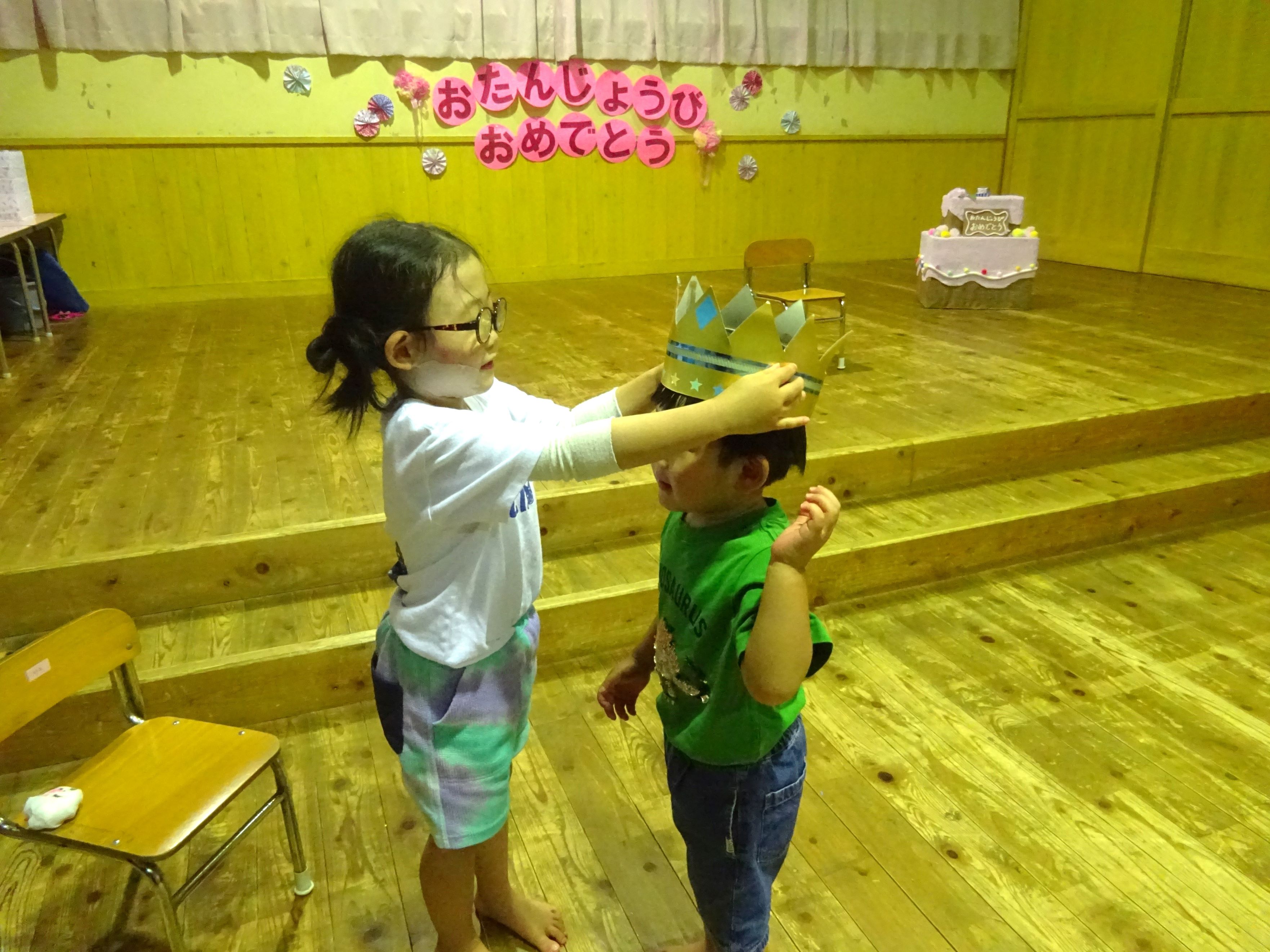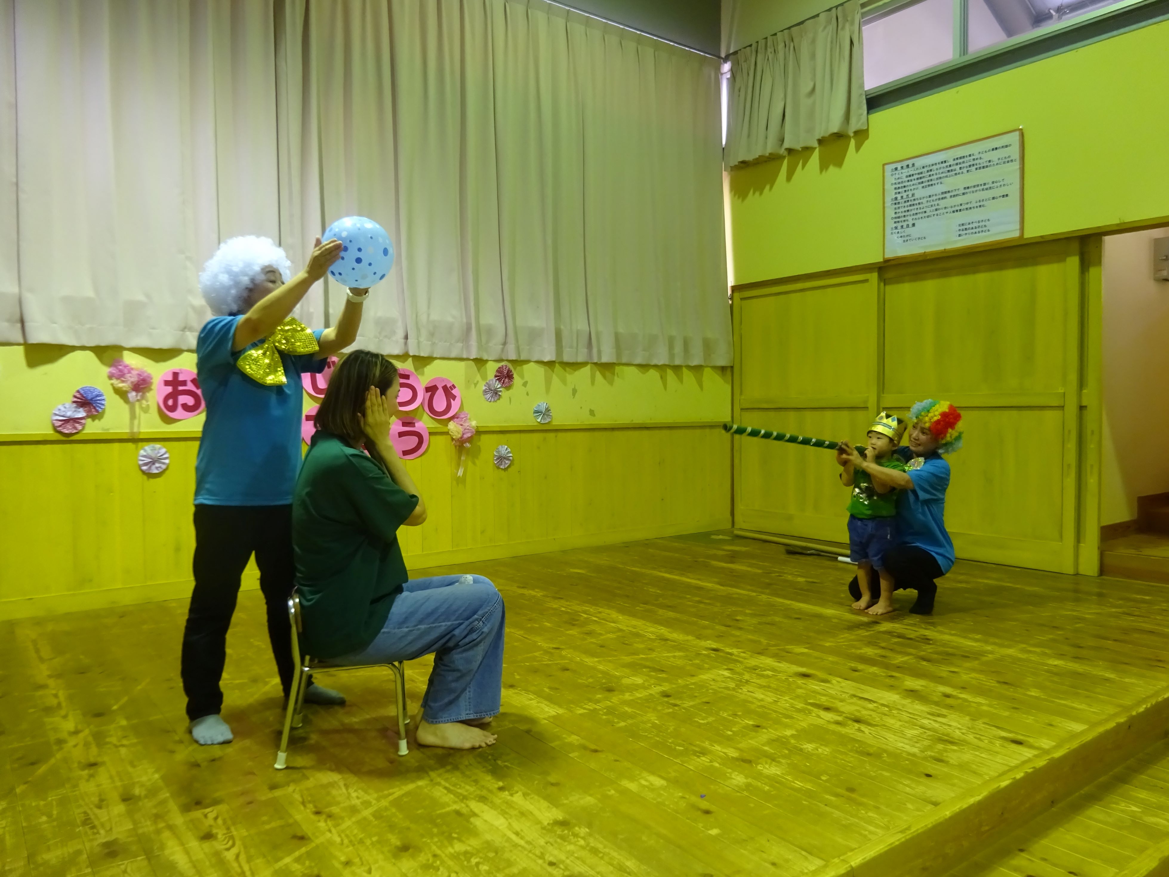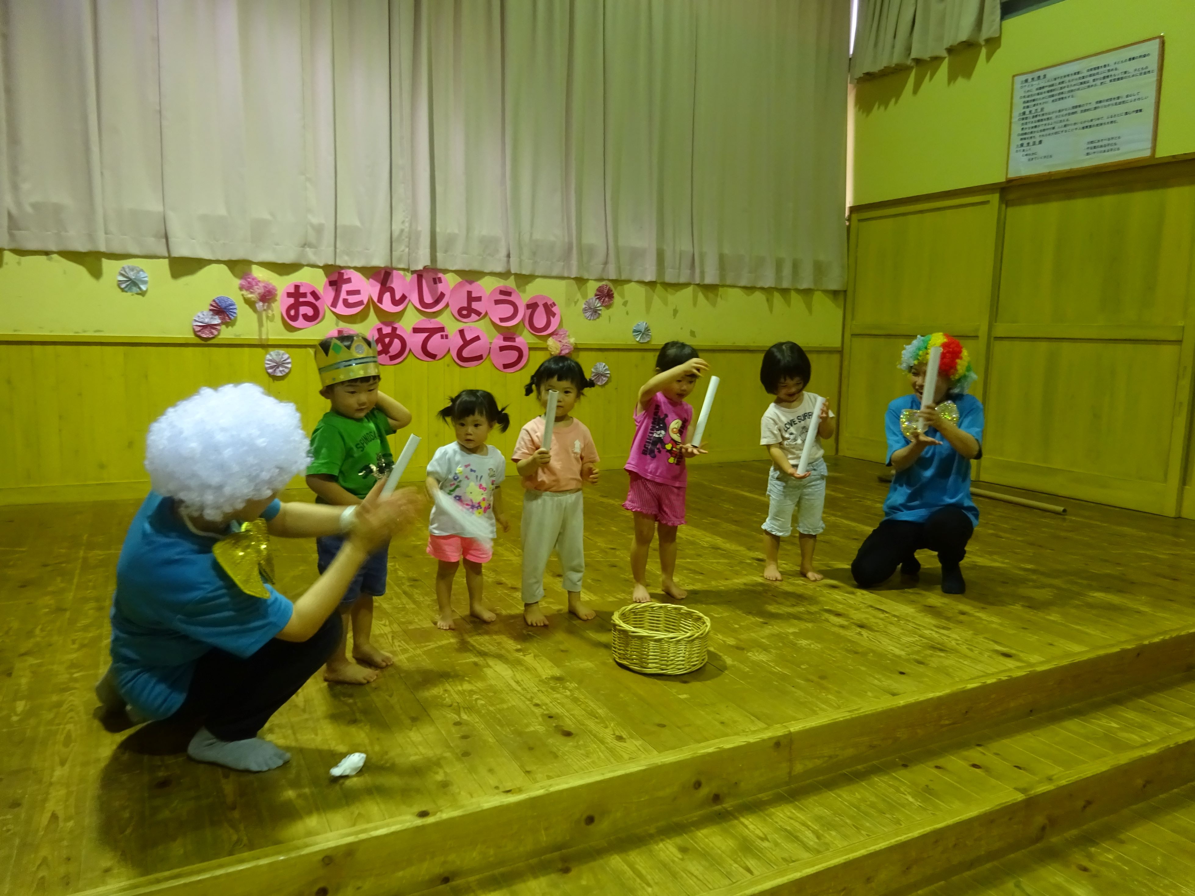 「おたんじょうかいはいつ?」と楽しみにしていた誕生児さん。今日は、お母さんをお招きし、みんなでお祝いをしました。いつもは、恥ずかしがり屋さんですが、今日は堂々とステージの上に上がり、自己紹介や好きなことのお話をうれしそうにしてくれました。三歳になり、お兄さんらしくなったと感じられた姿でした。お母さんから名前の由来や生まれた時のエピソードを聞き、この野波の自然の中で、すくすくと成長していって欲しいというご家族の思いを知り、あたたかい気持ちになりました。