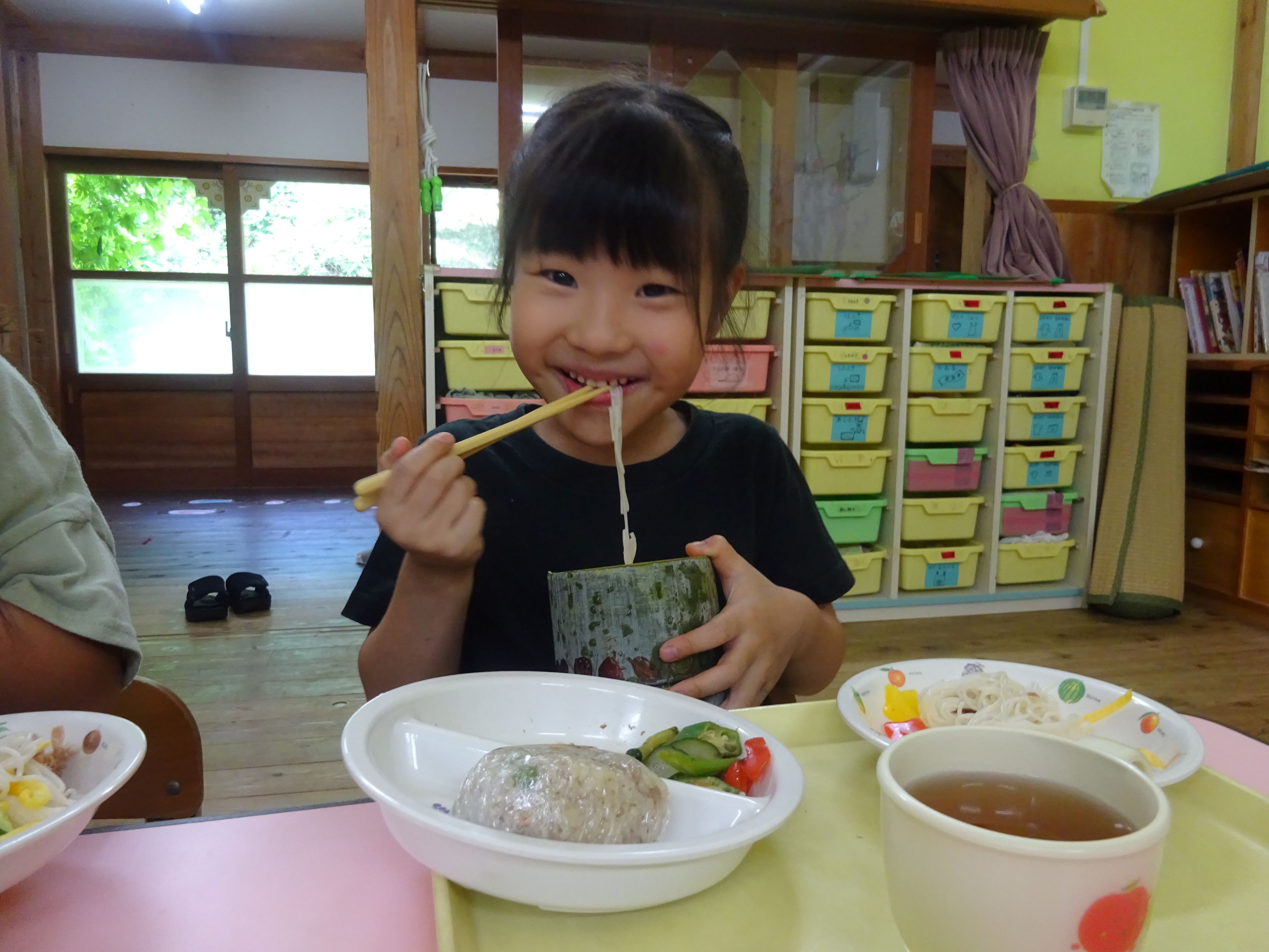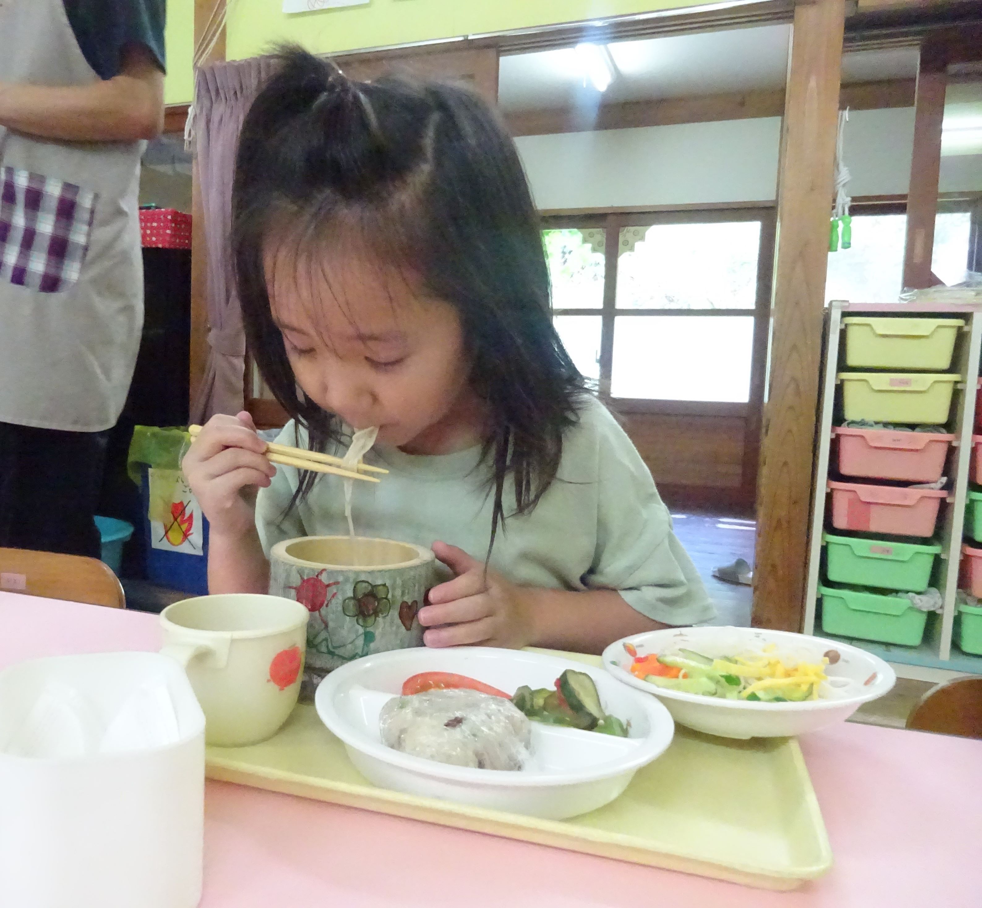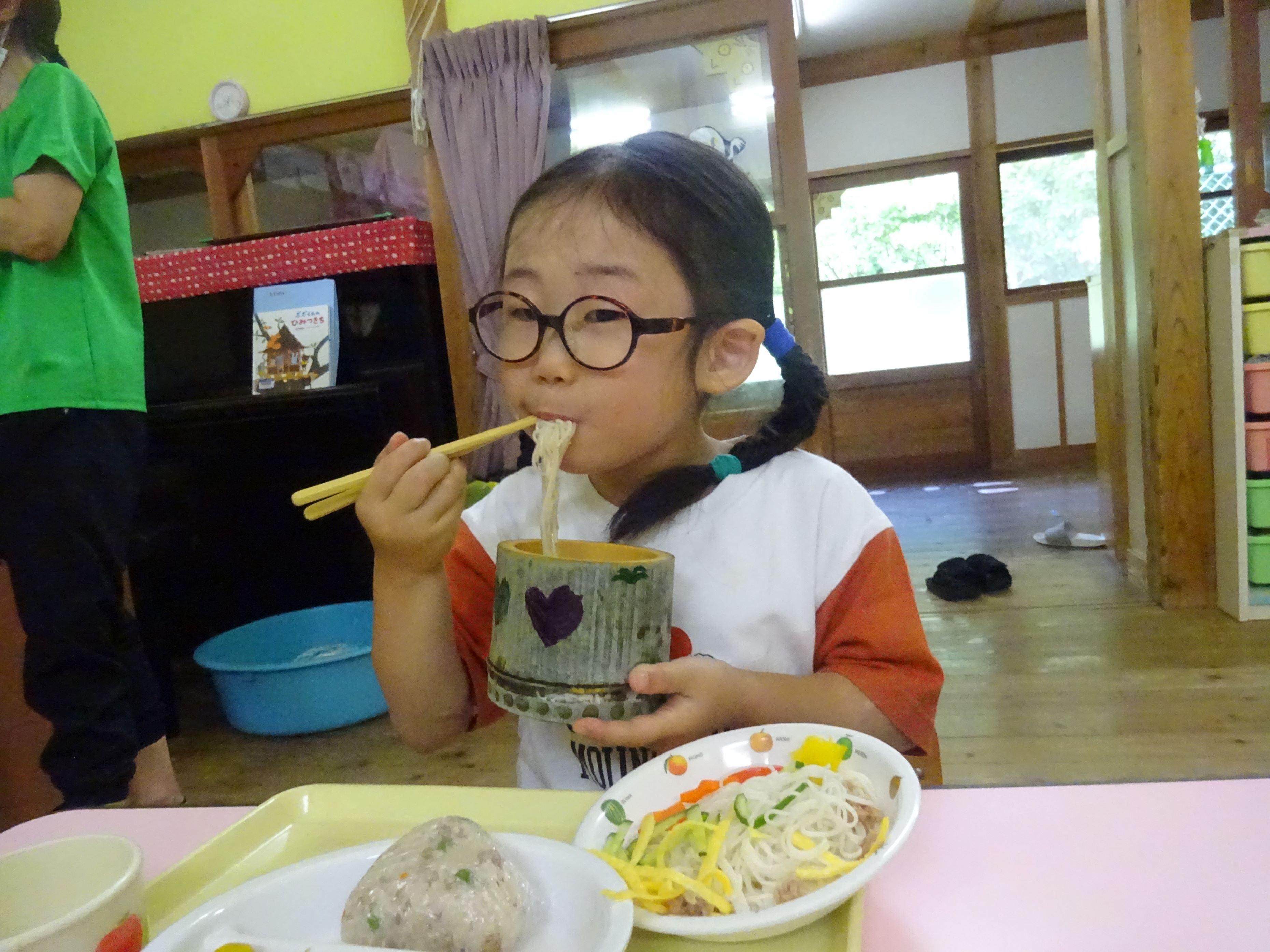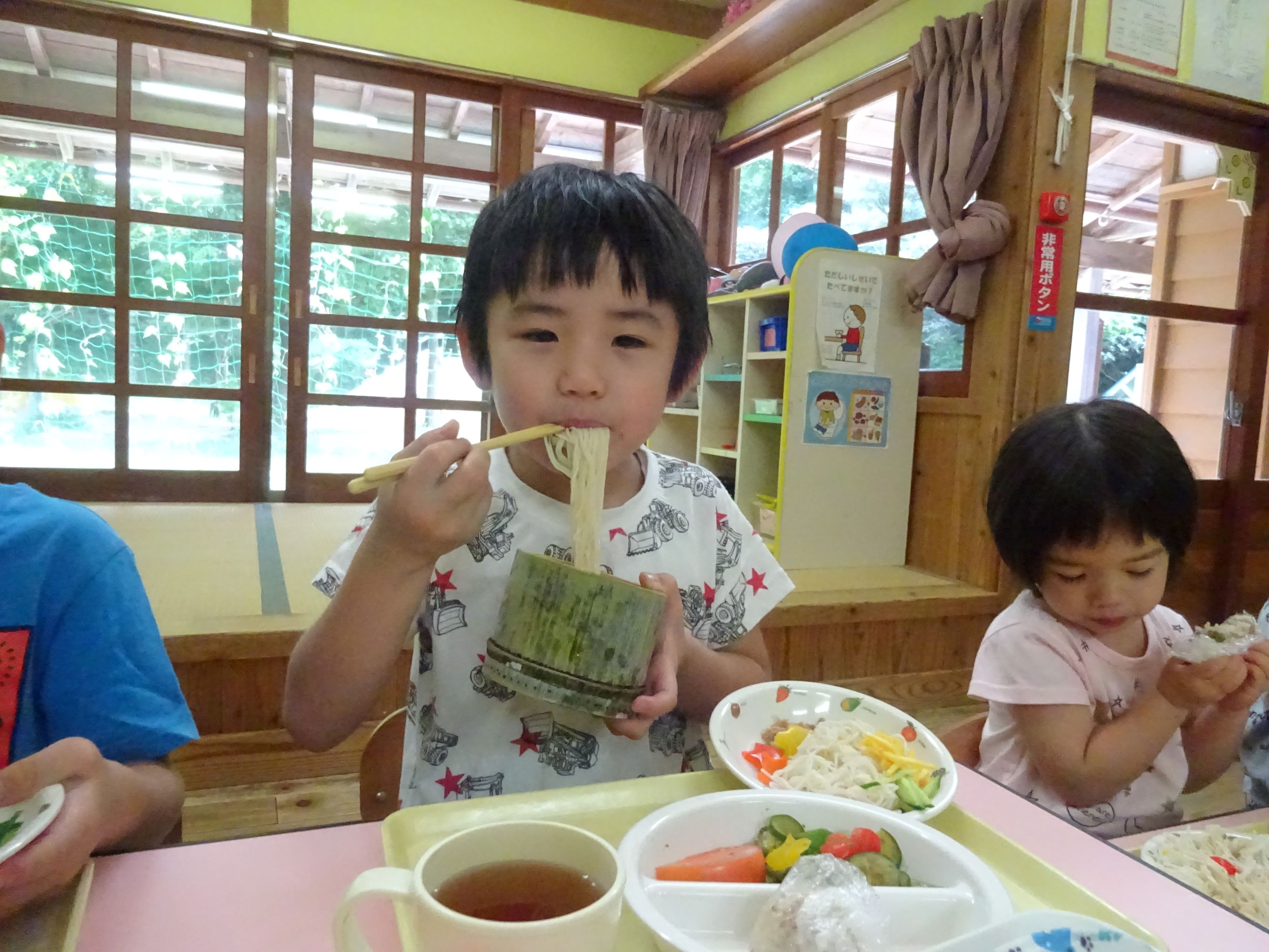 給食はそうめん。年長児は、前日に達さんに教えてもらいながら作った竹の器で食べました。自分で作った器で食べるそうめんはまた格別だったと思います。