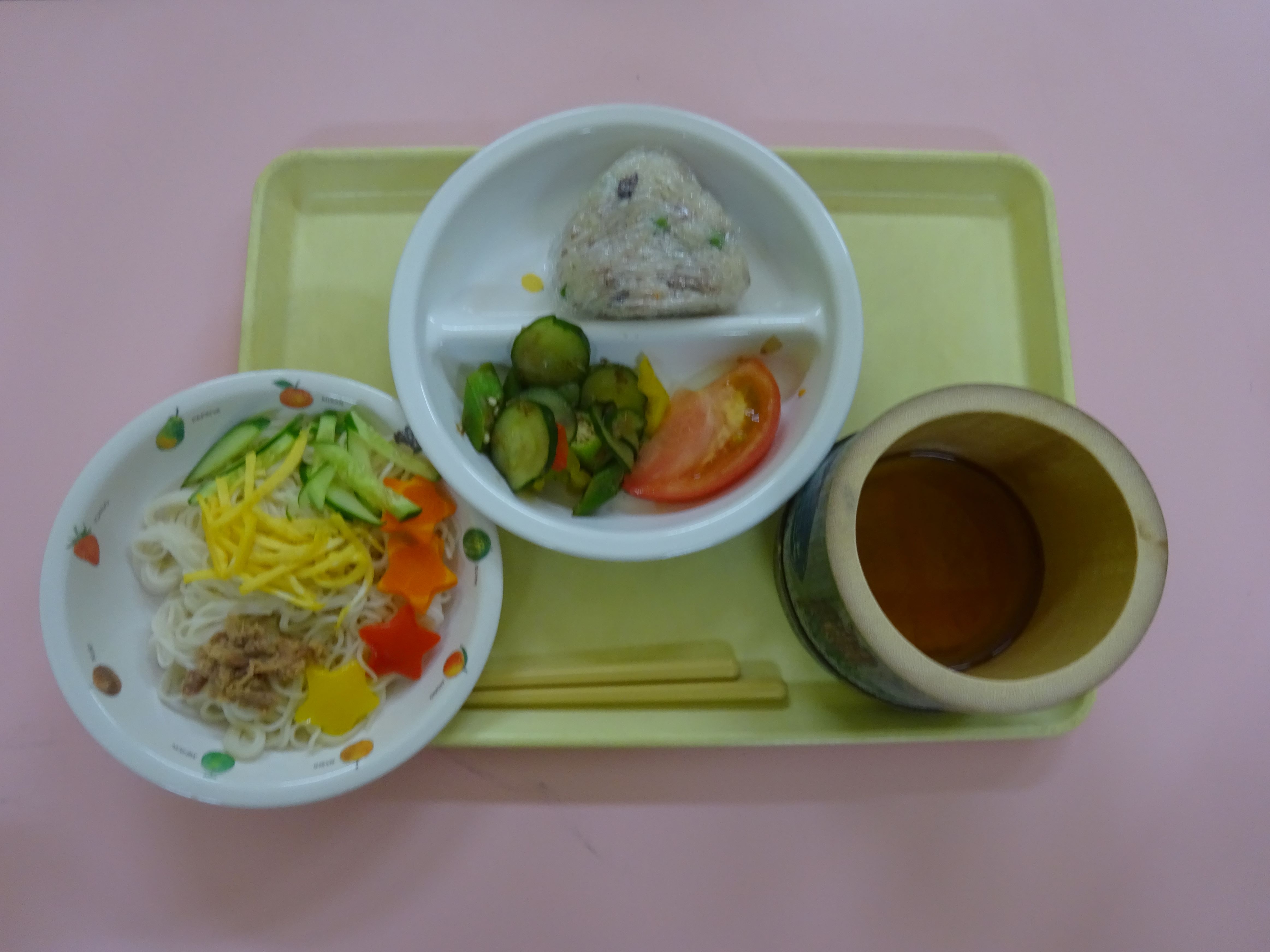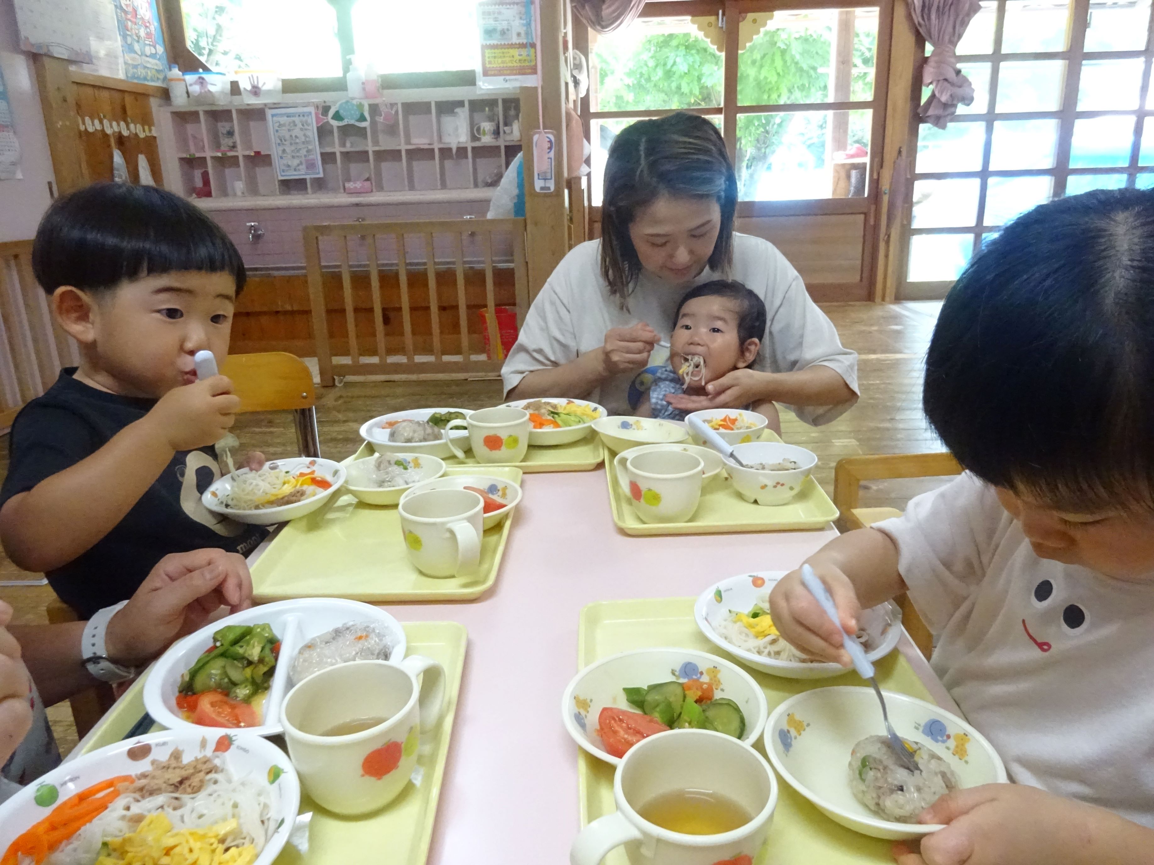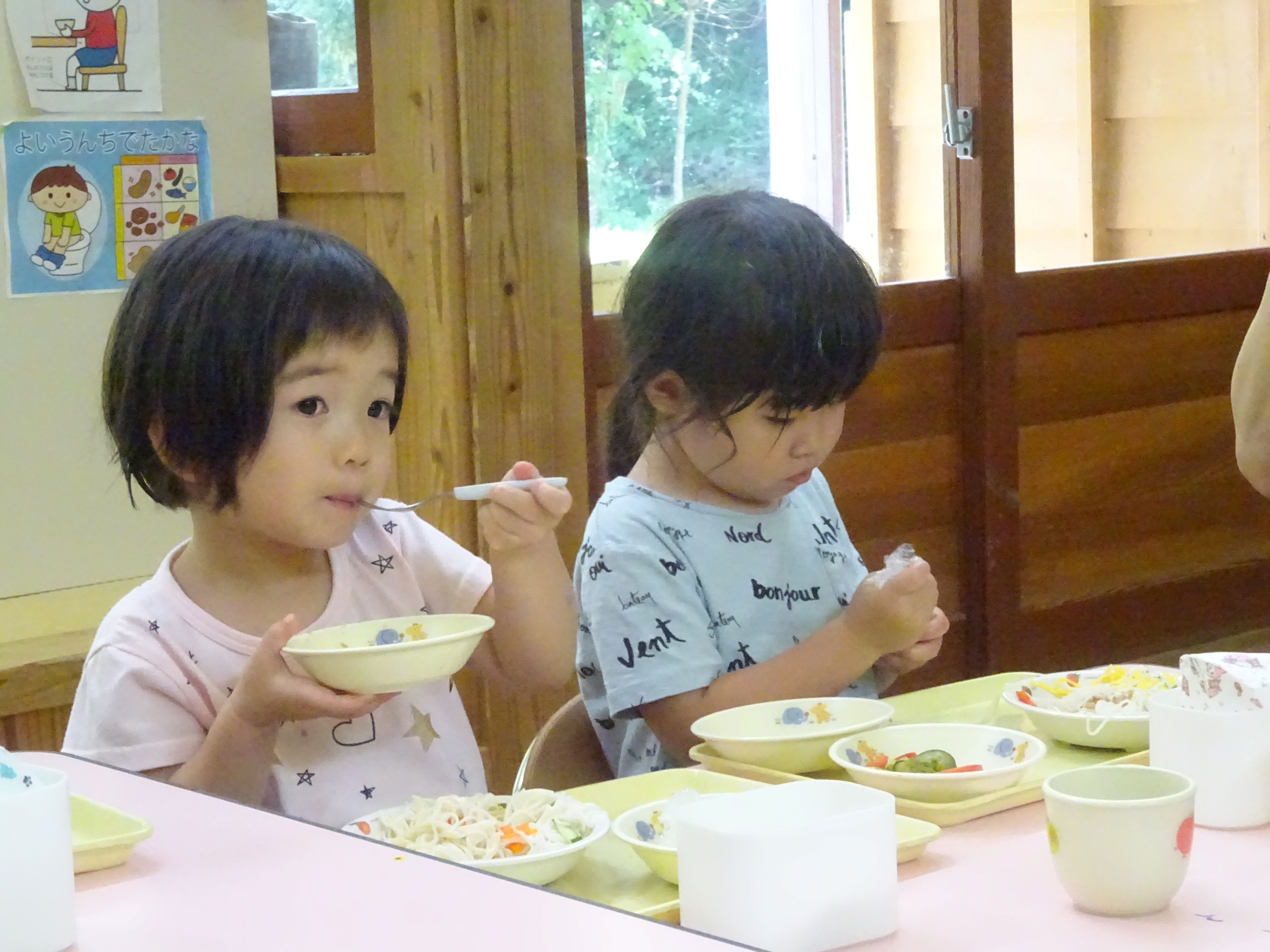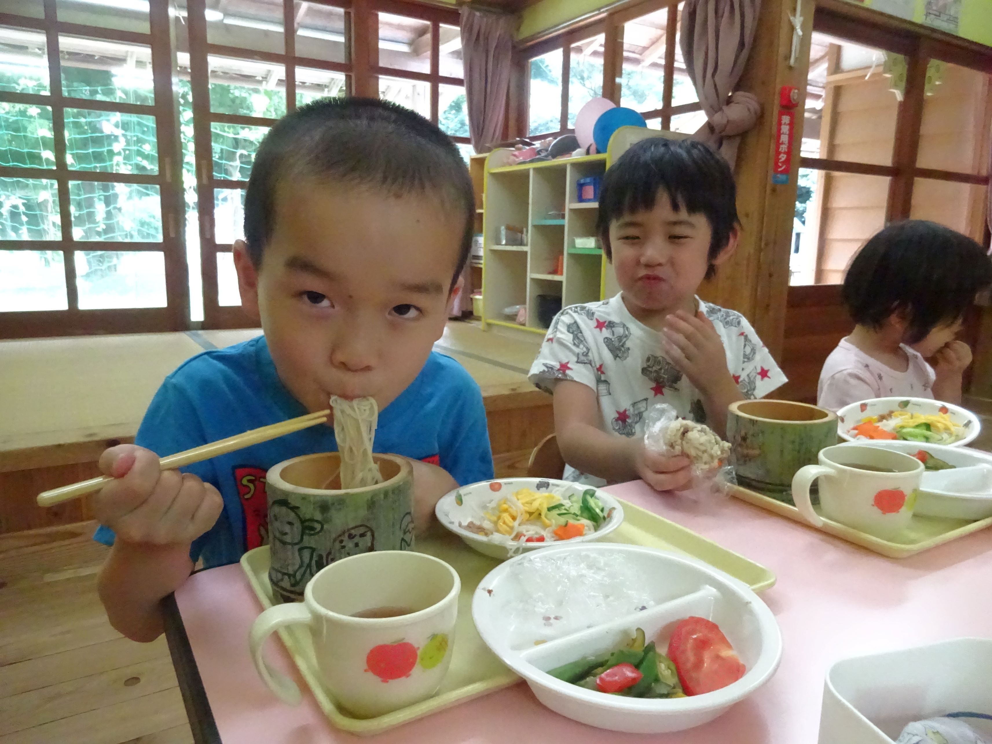給食はそうめん。年長児は、前日に達さんに教えてもらいながら作った竹の器で食べました。自分で作った器で食べるそうめんはまた格別だったと思います。