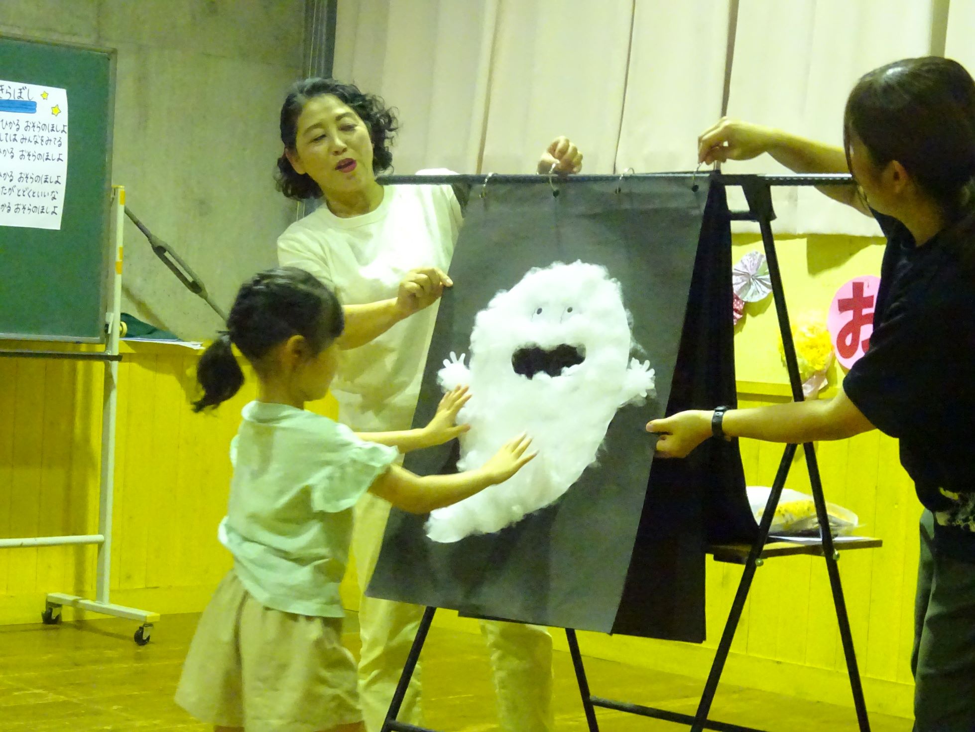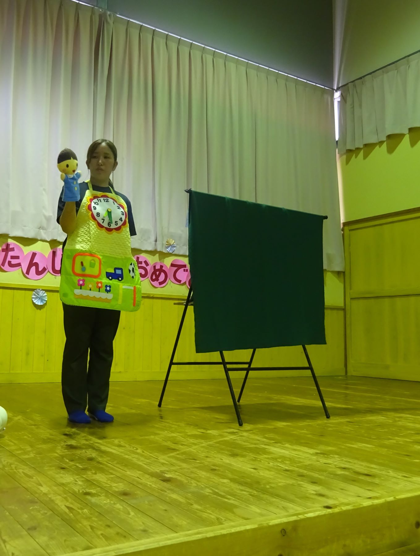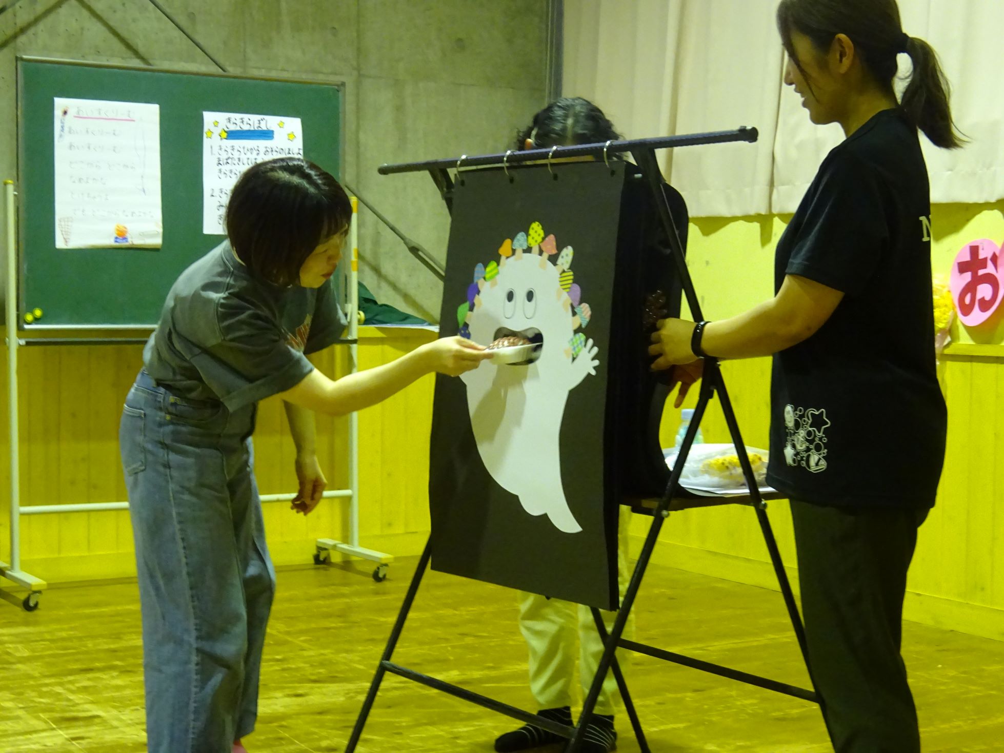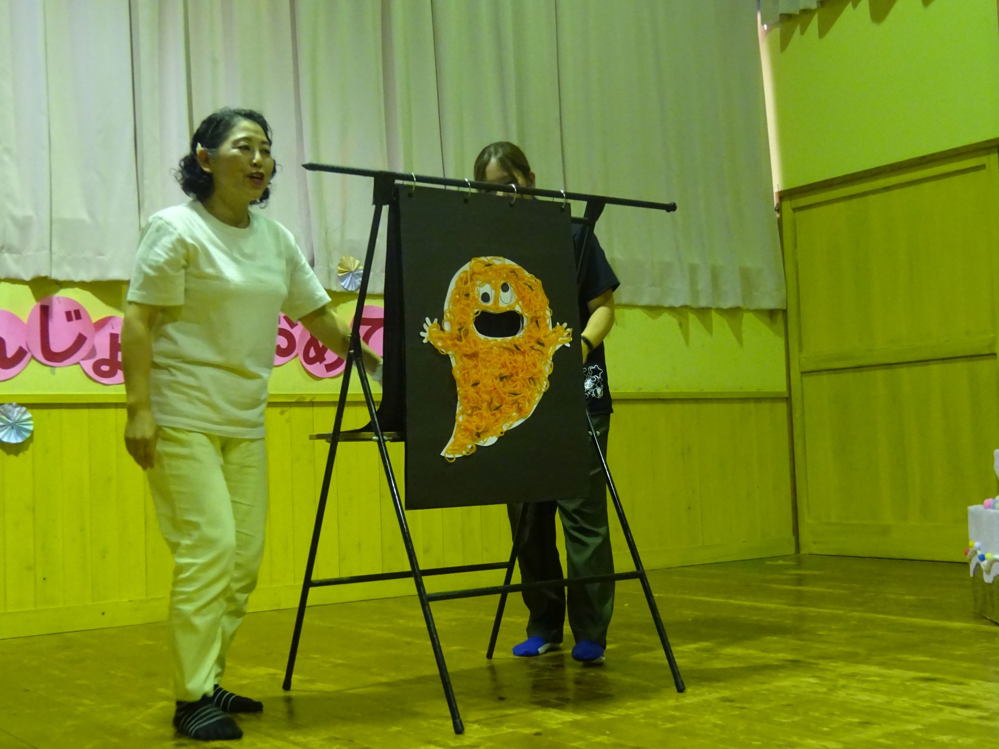 お楽しみ会では、エプロンシアター「早寝早起き朝ごはん」を見て、大切なことを確認しました。「ばけばけばけばけばけたくん」の変身シアターでは、ばけたくんが様々なものを食べて返信するお手伝いを、誕生児の親子にしてもらいました。