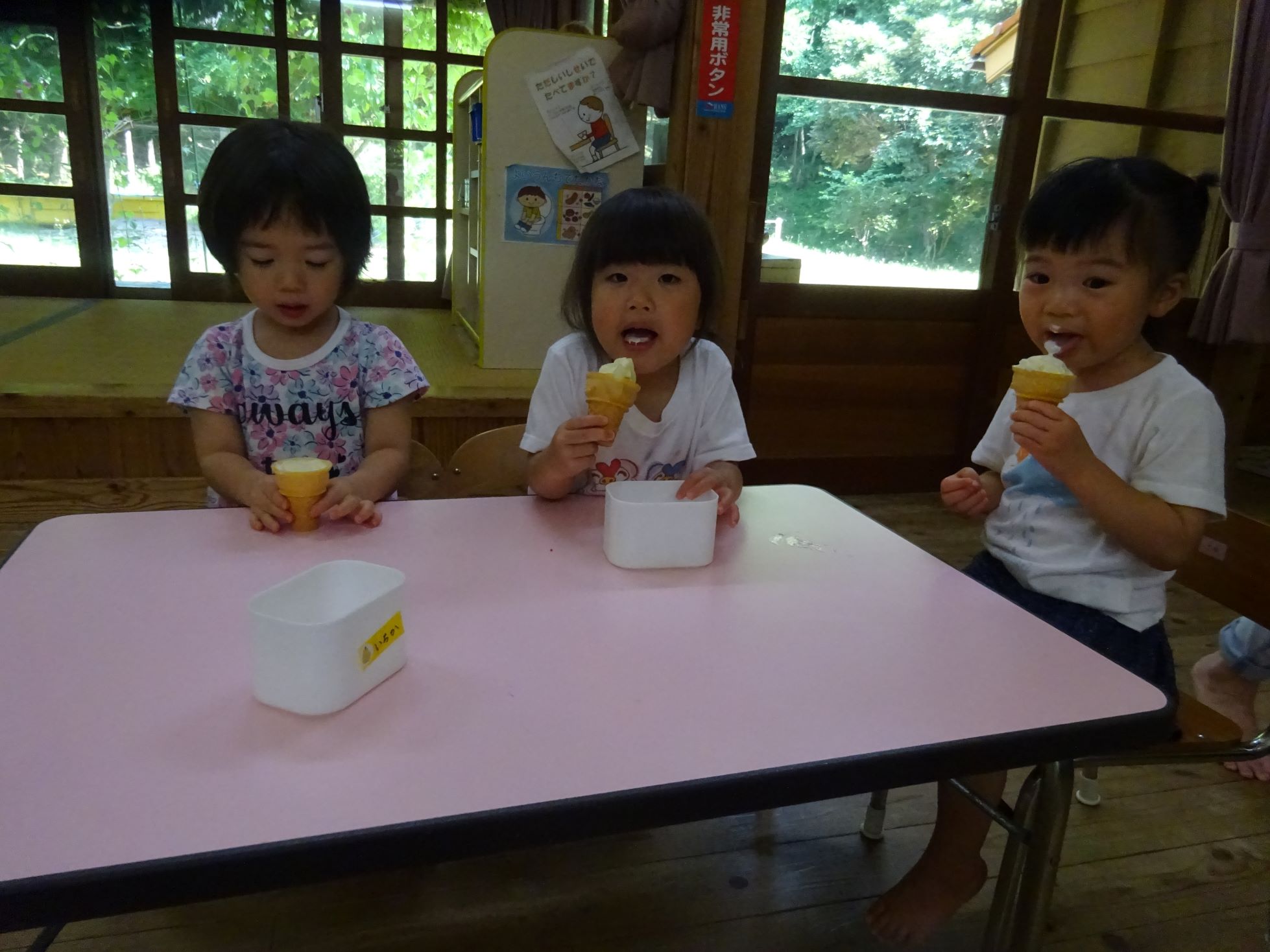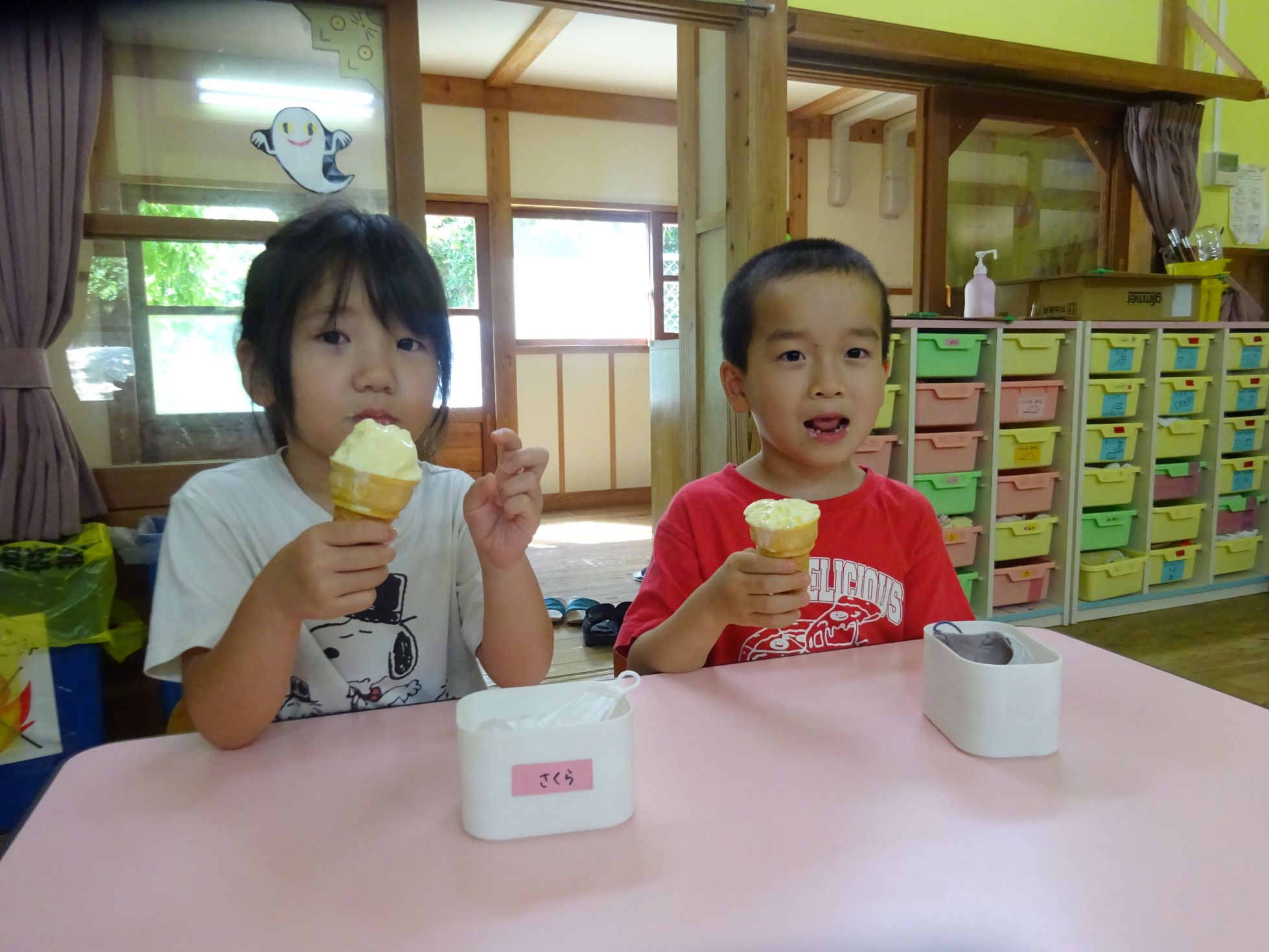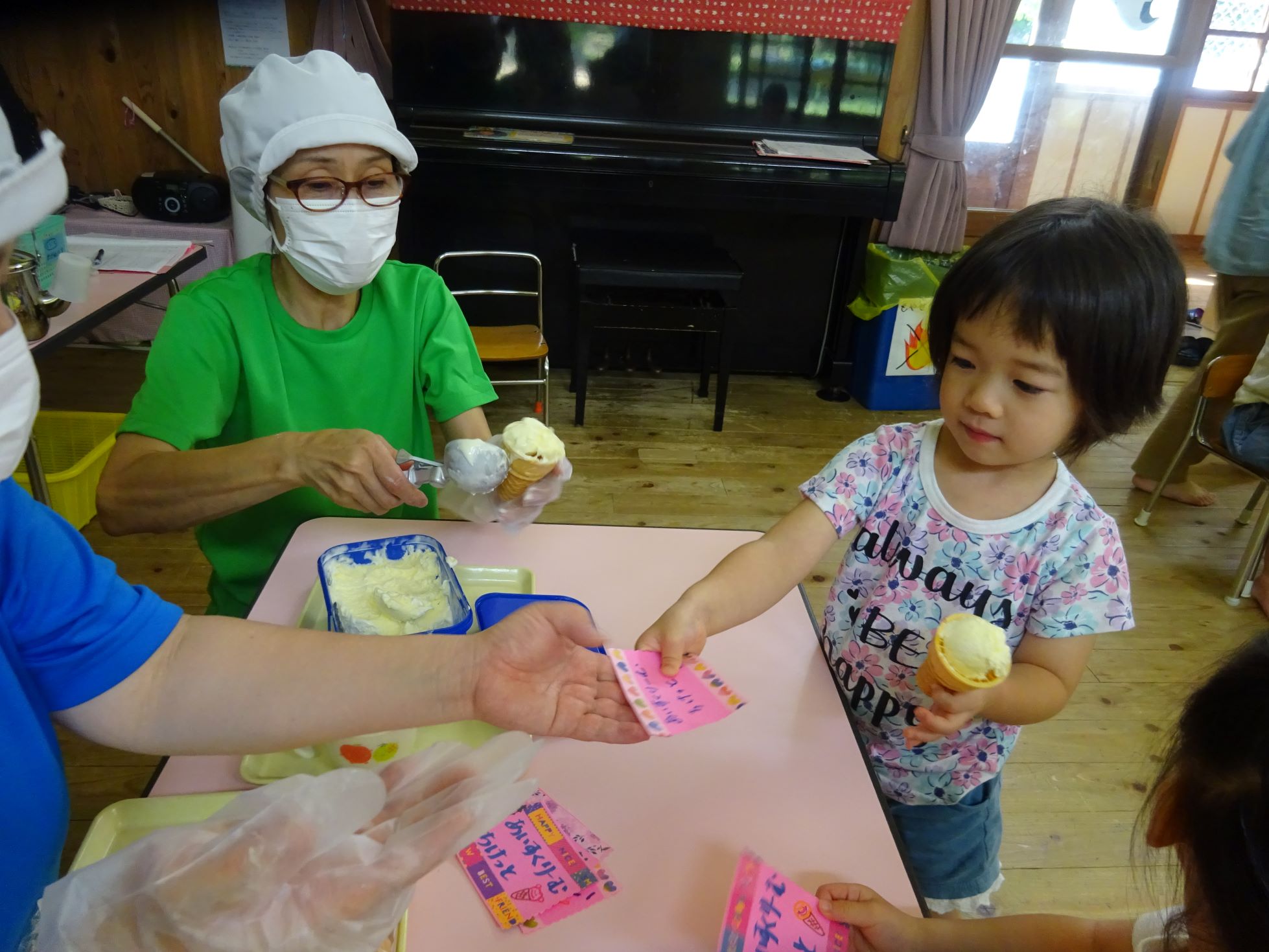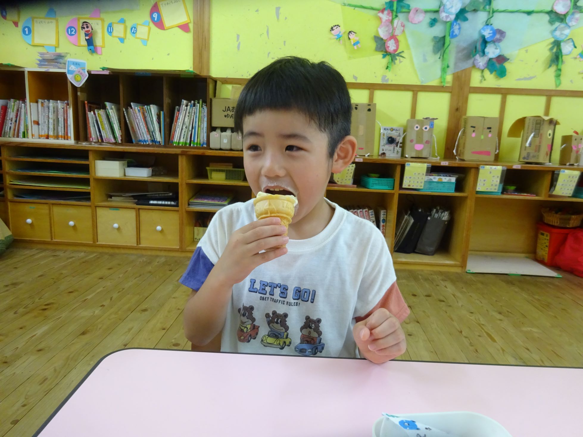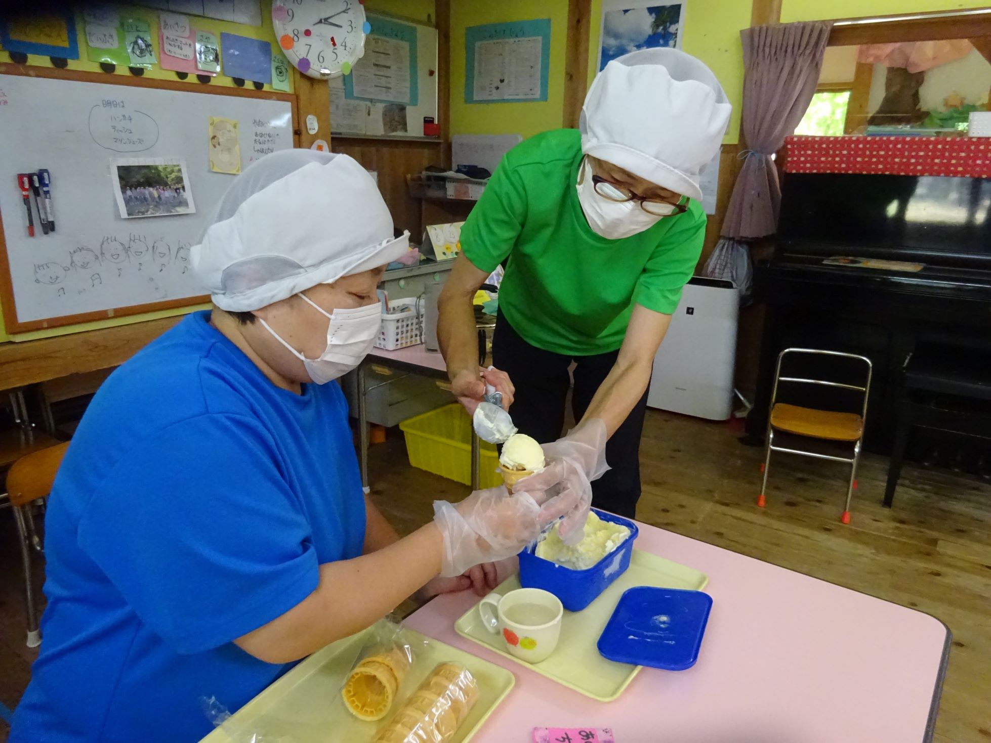 午後のおやつは、お祝いアイスクリーム!給食の先生がアイスクリーム屋さんになって、楽しく受け渡してくれました。