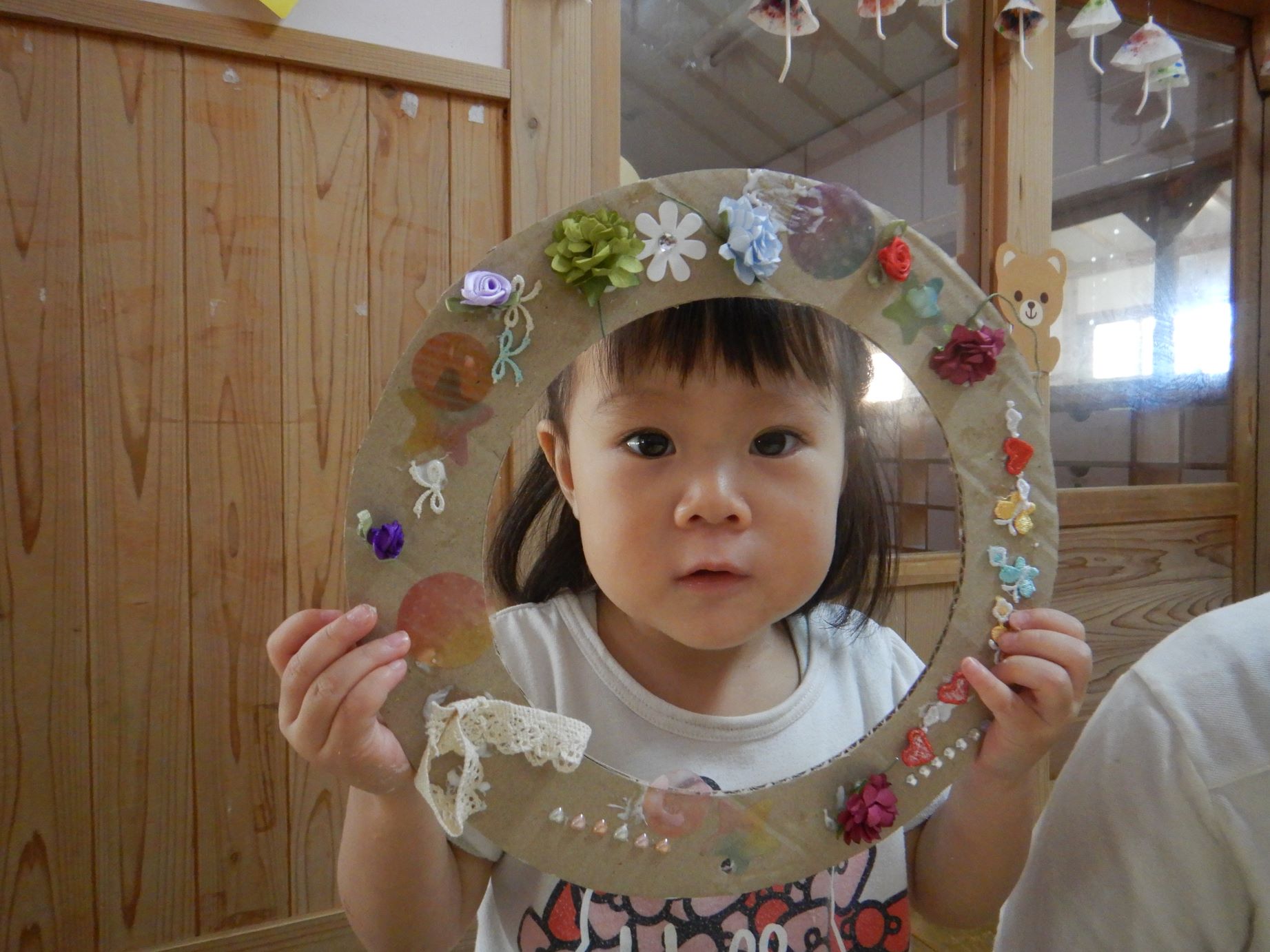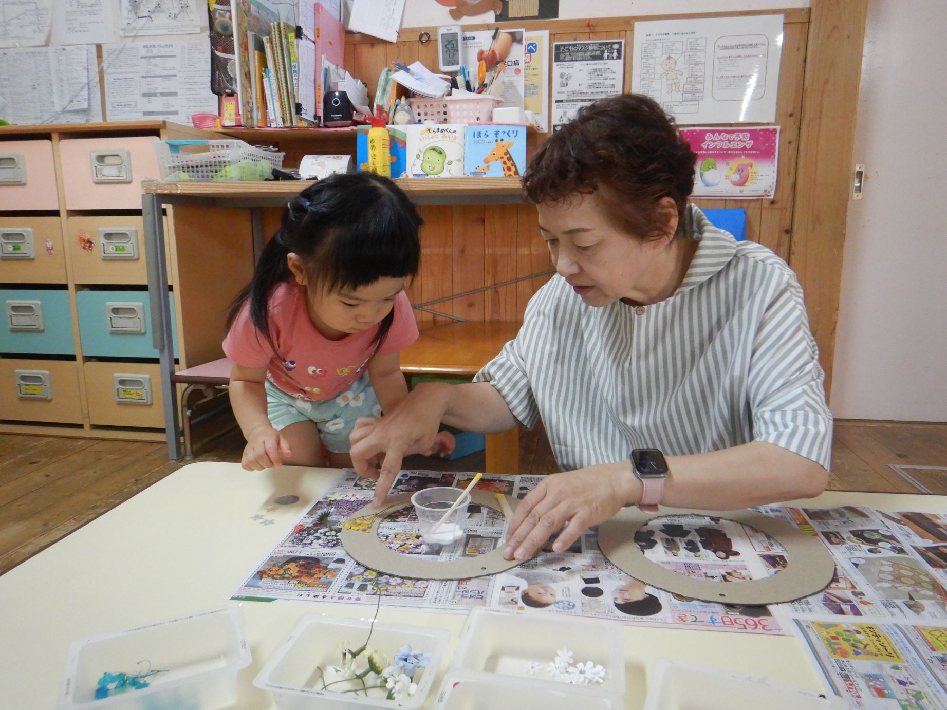 様々な材料から気に入った物を選んで手に取り、ボンドで付けていきました。おじいさん・おばあさんが、子ども達の思いや考えに優しく寄り添いながら飾っていく雰囲気がとても温かかったです。穏やかな関わりを見て、子ども達は愛されていることを感じ、幸せなひとときでした。