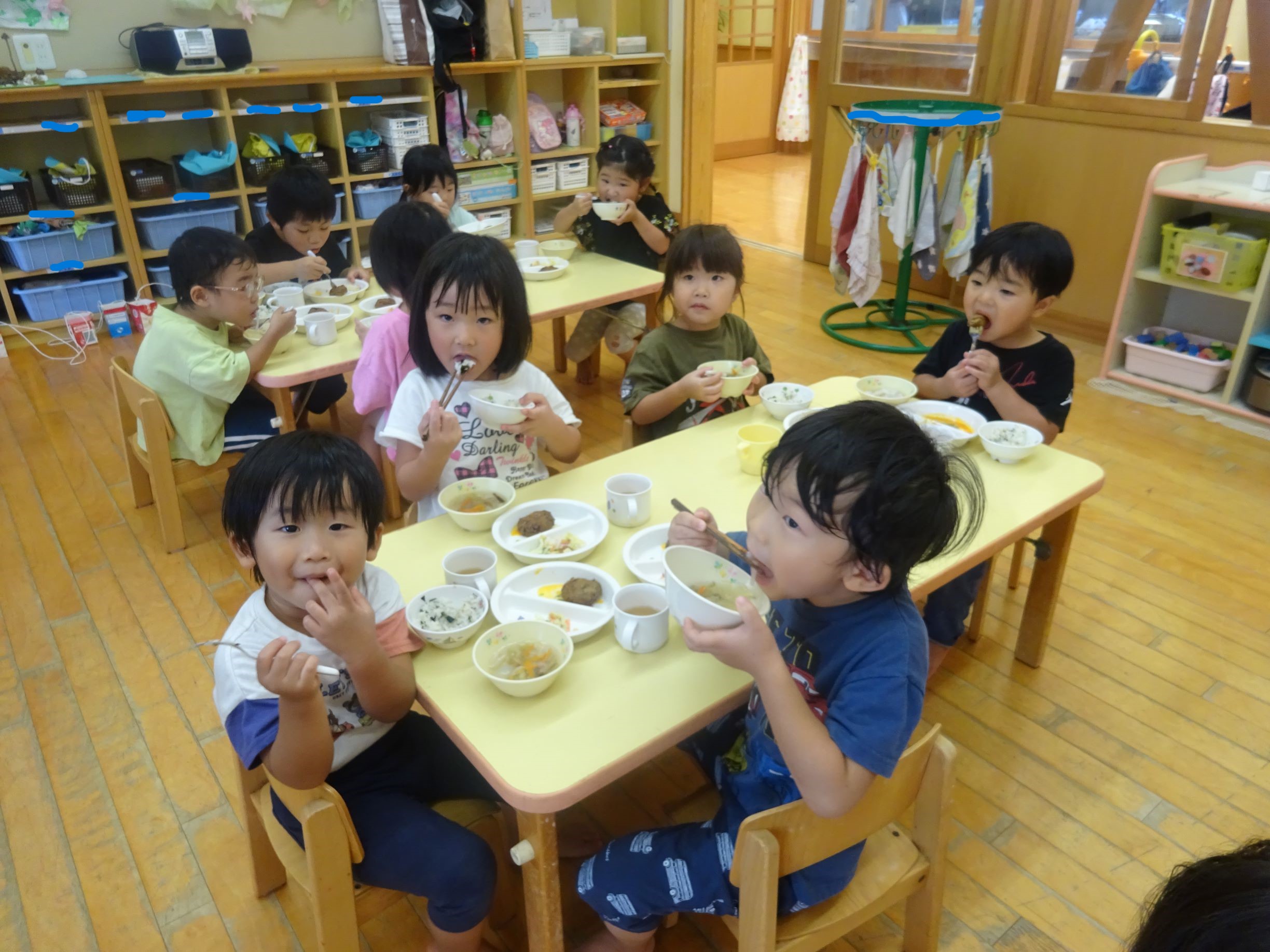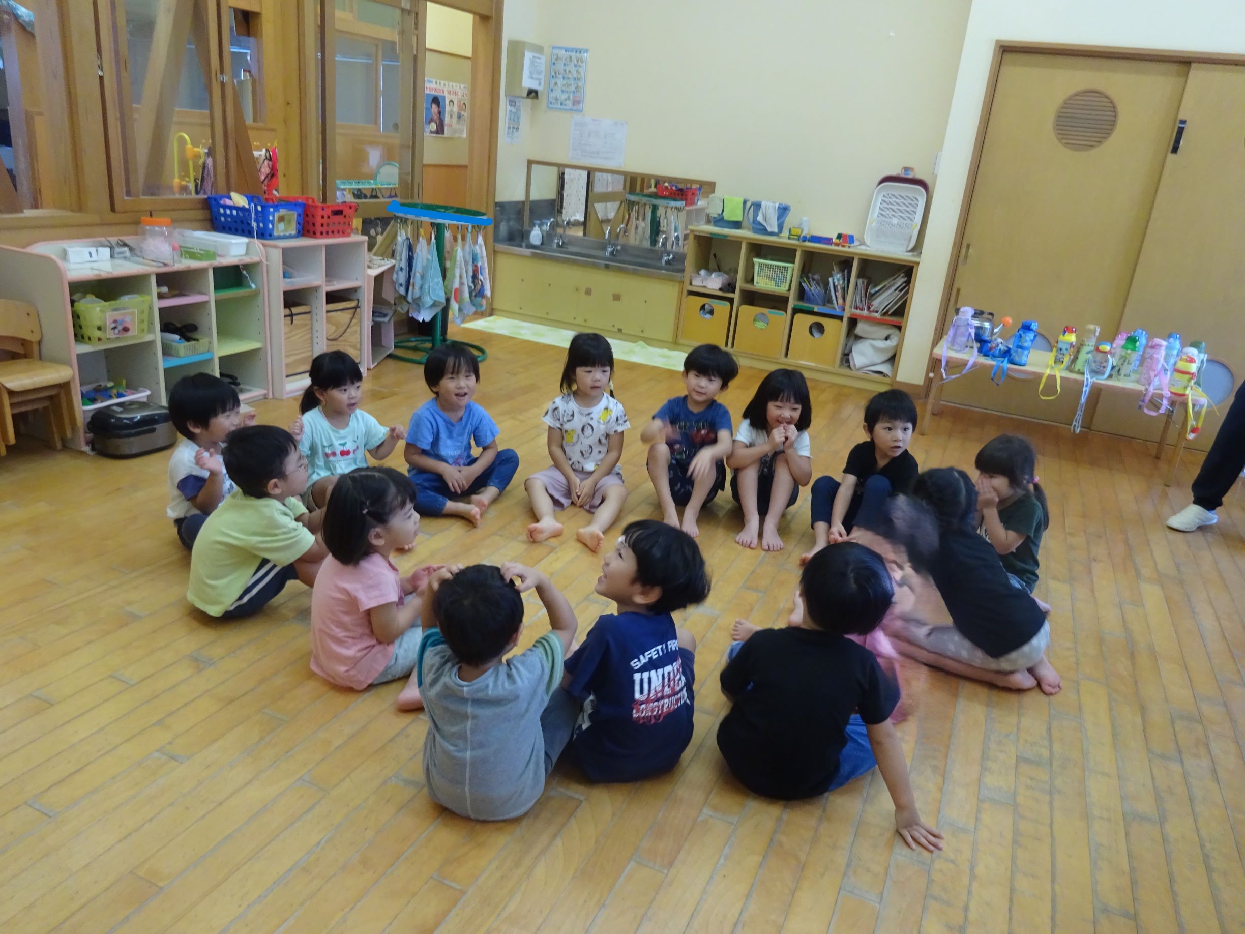今年度2回目の交流日。4か月ぶりにぺんぎん組の友達と会いました。交流の前日に「○○ちゃんとあそぼう」「マリンほいくしょたのしみ」と言っていたそら組さん。1回目の時よりぺんぎん組の友達と顔を見合わせて微笑んだり、話しかけたりすることができ成長を感じました。