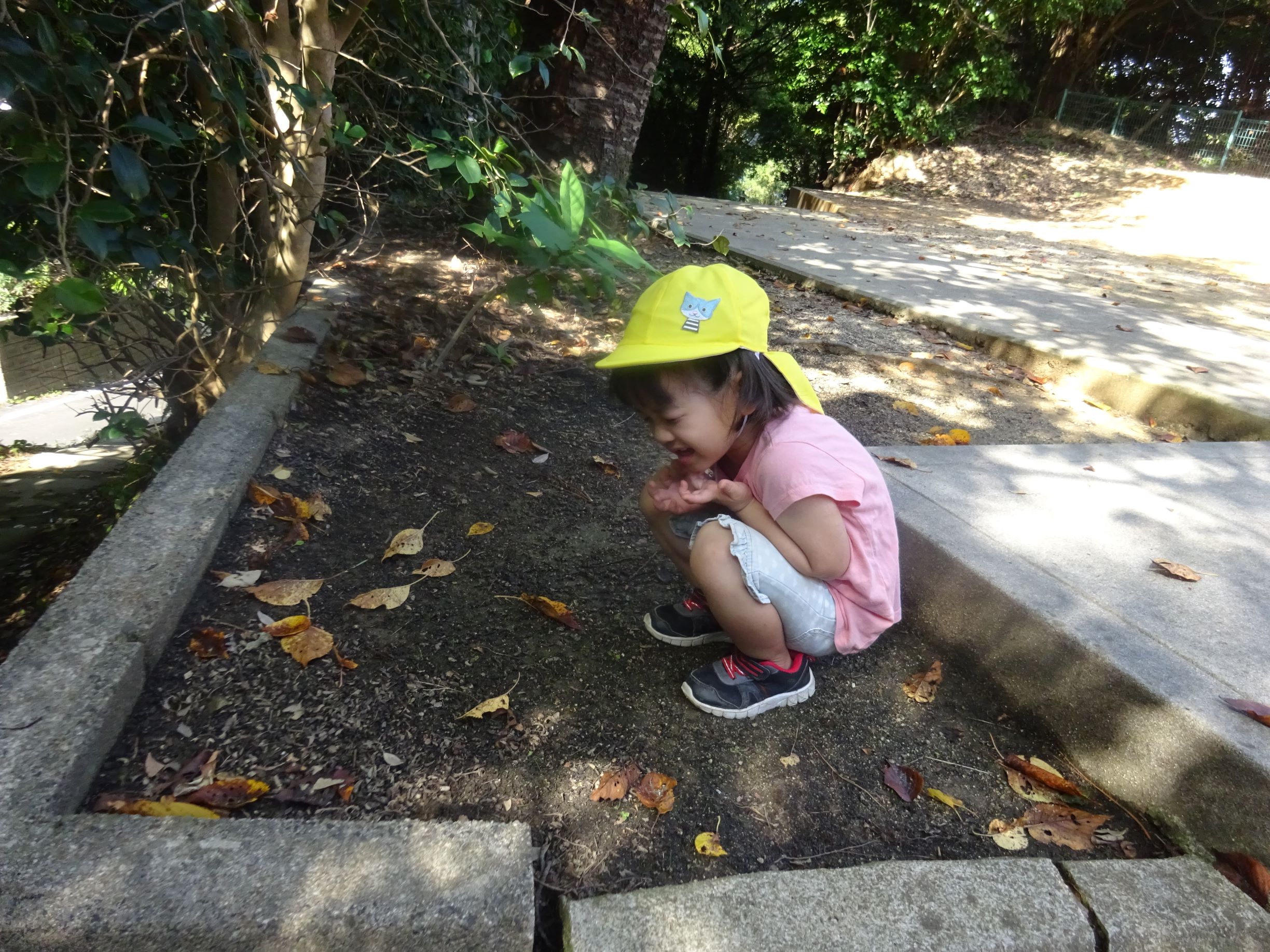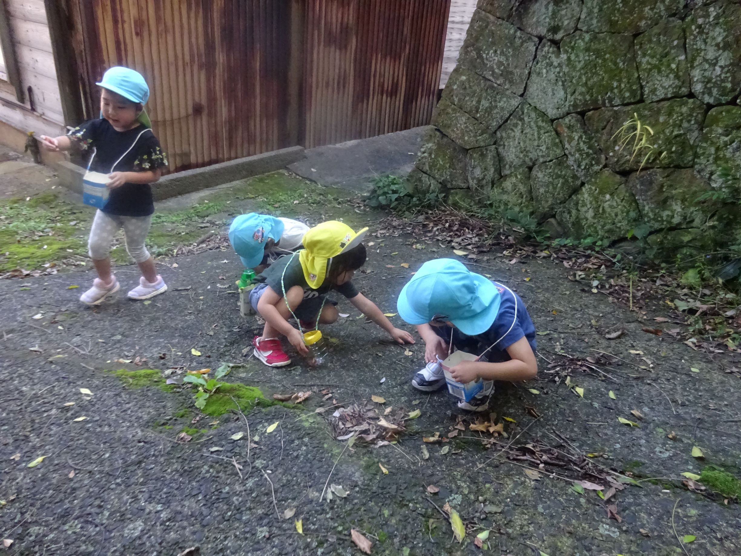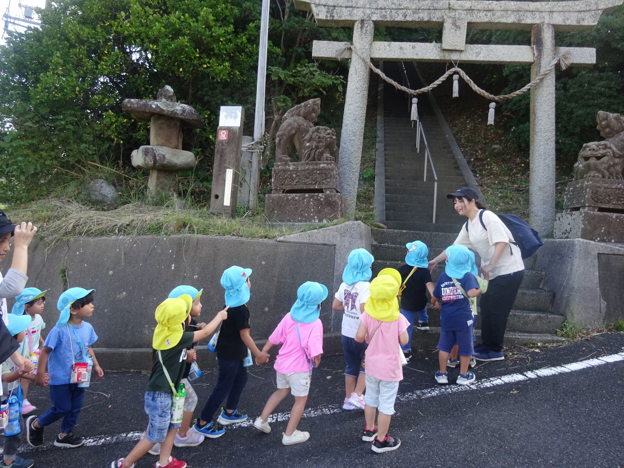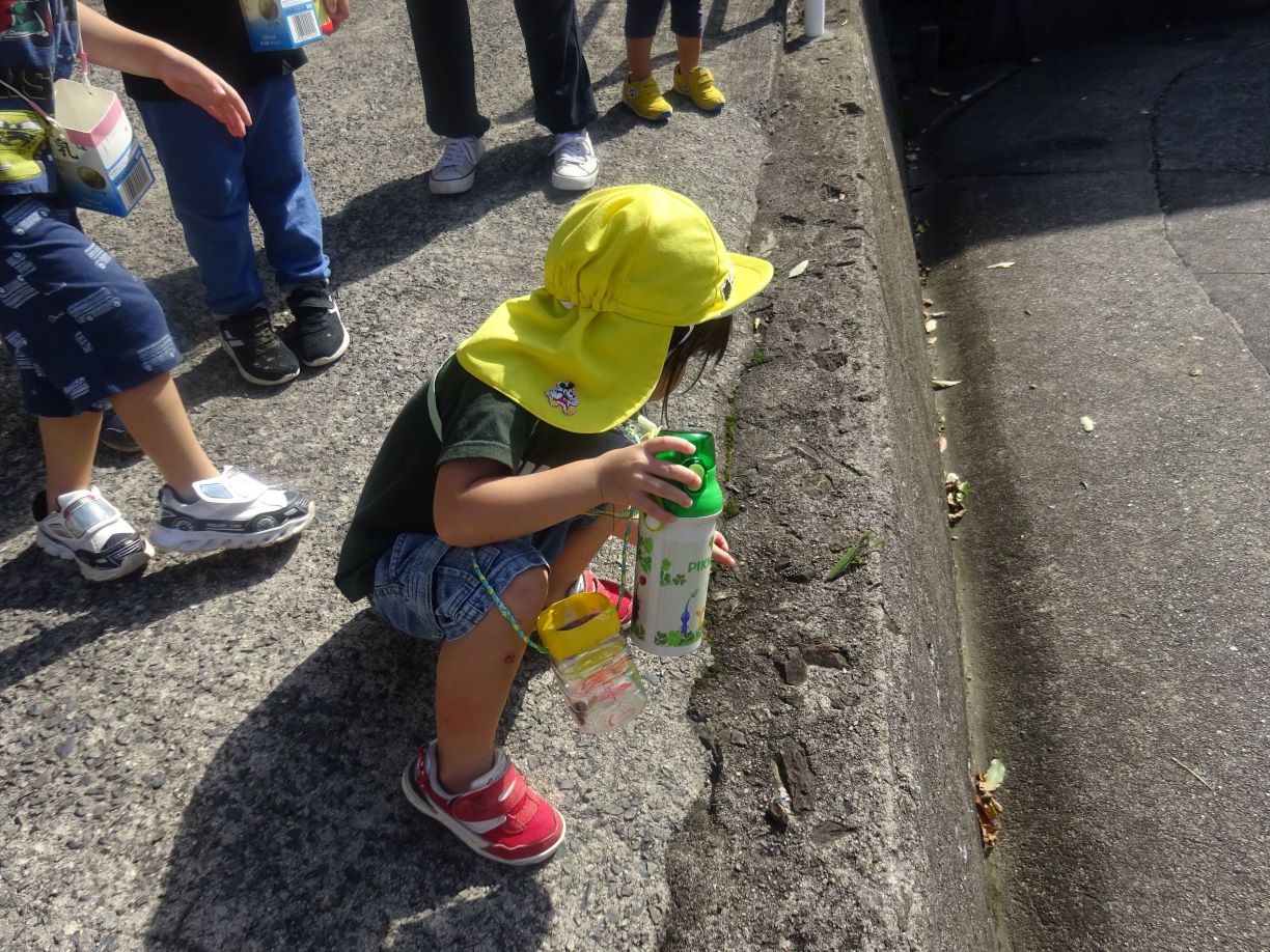 今日は絶好の散歩日和。前回照れてぺんぎん組の友達と手を繋げなかったのですが、今回は手を繋いで歩きました。大﨑神社ではみんなでかくれんぼをしたり、小田和坂ではしいの実、クヌギを見つけて拾ったりしました。夕方も所庭で友達と元気いっぱい遊び、楽しい1日になりました。