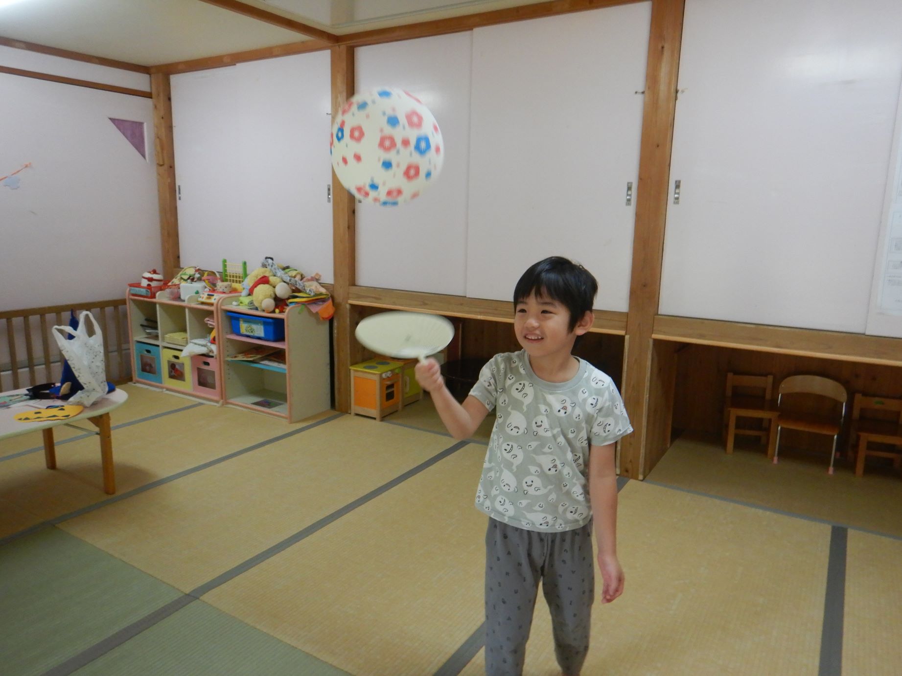 《風船をうちわで打つ》《まねっこ》《歌を歌う》《小豆の引っ越し》のコーナーを、幼児組は3歳児と5歳児がペアになって、乳児組はクラスのみんなと一緒に回りました。