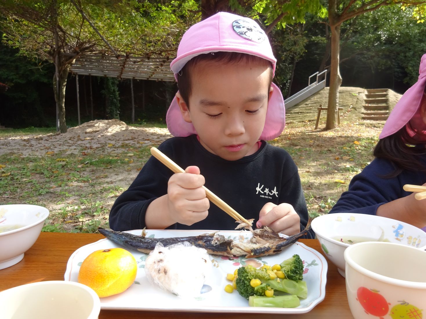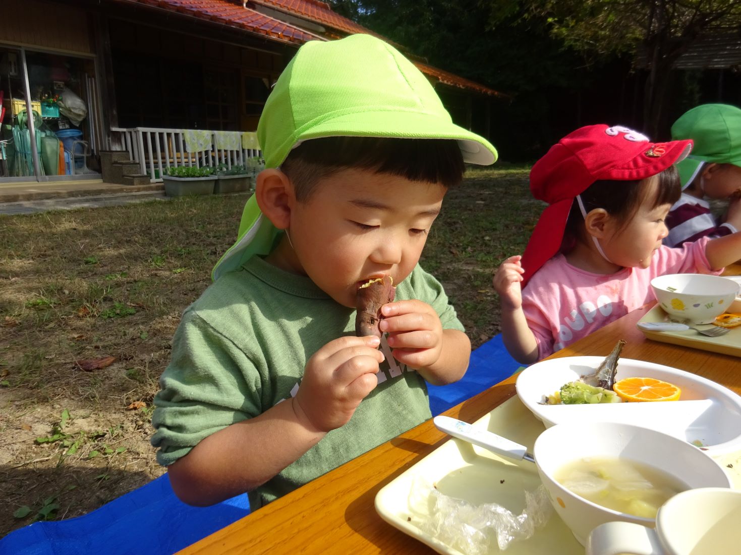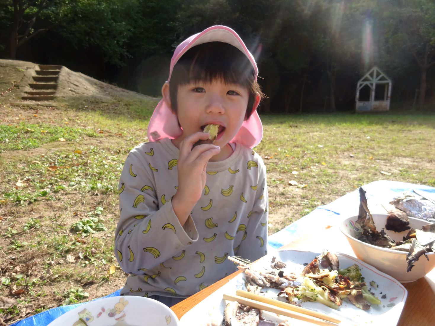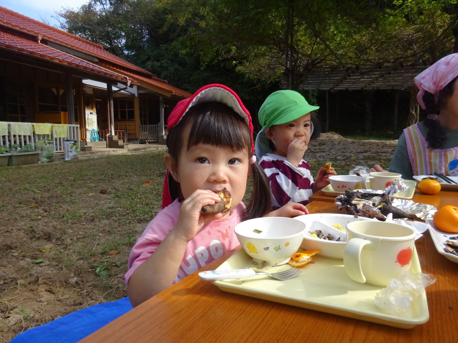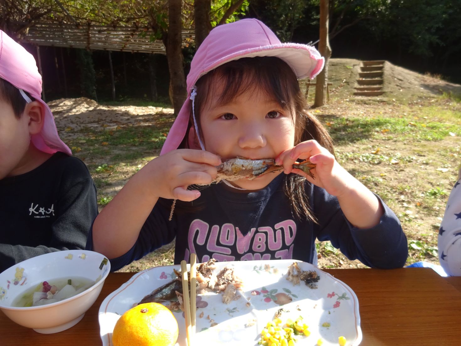 お芋とサンマが焼けるまで“わくわくの森”で元気いっぱいに遊んで、お腹がペコペコになりました。お昼は全員、所庭で食べました♪