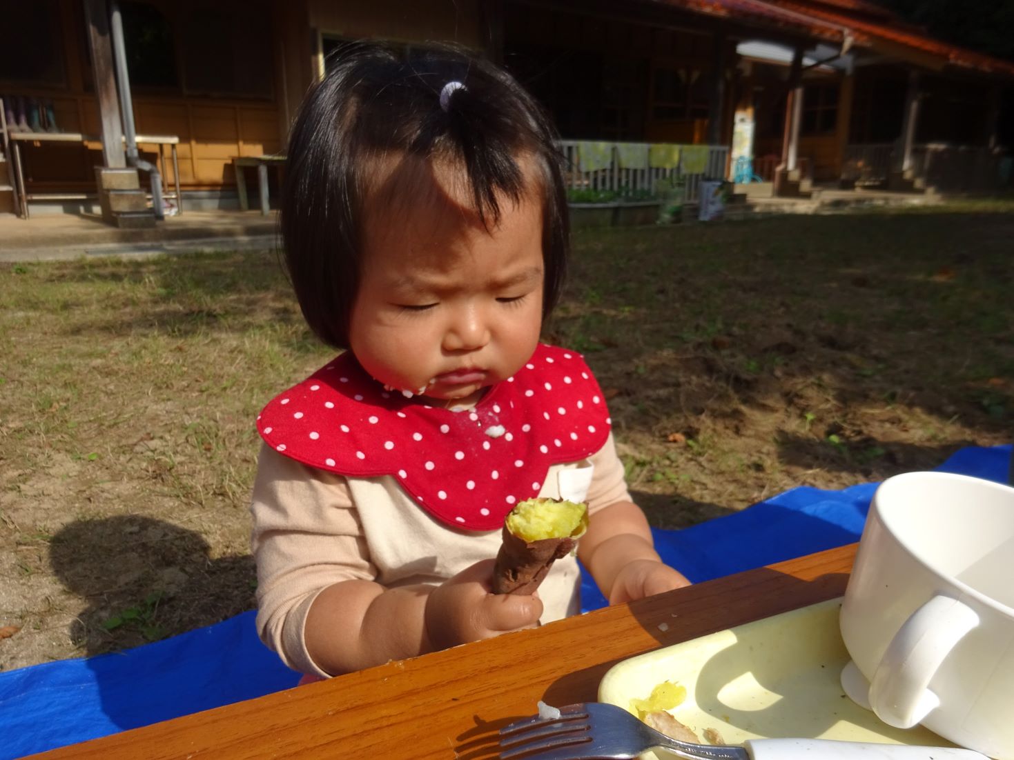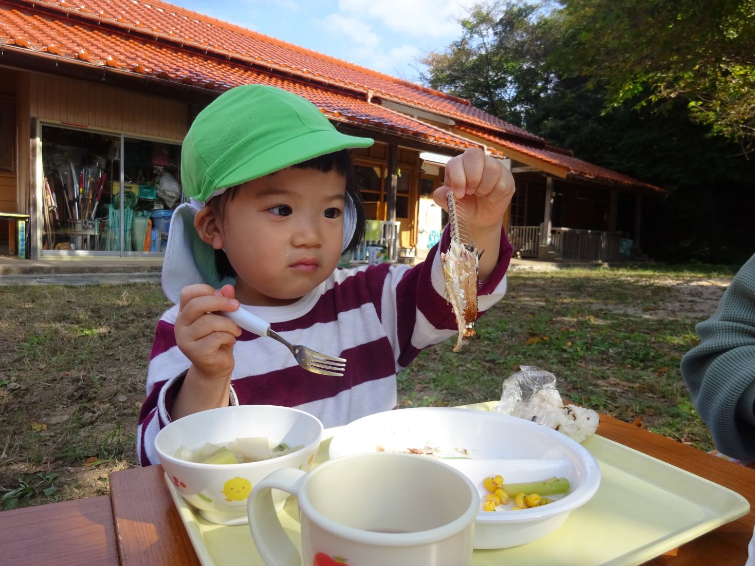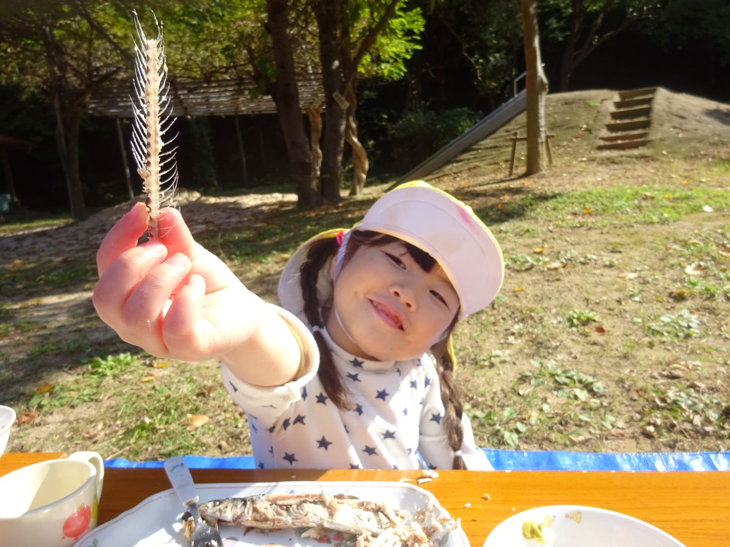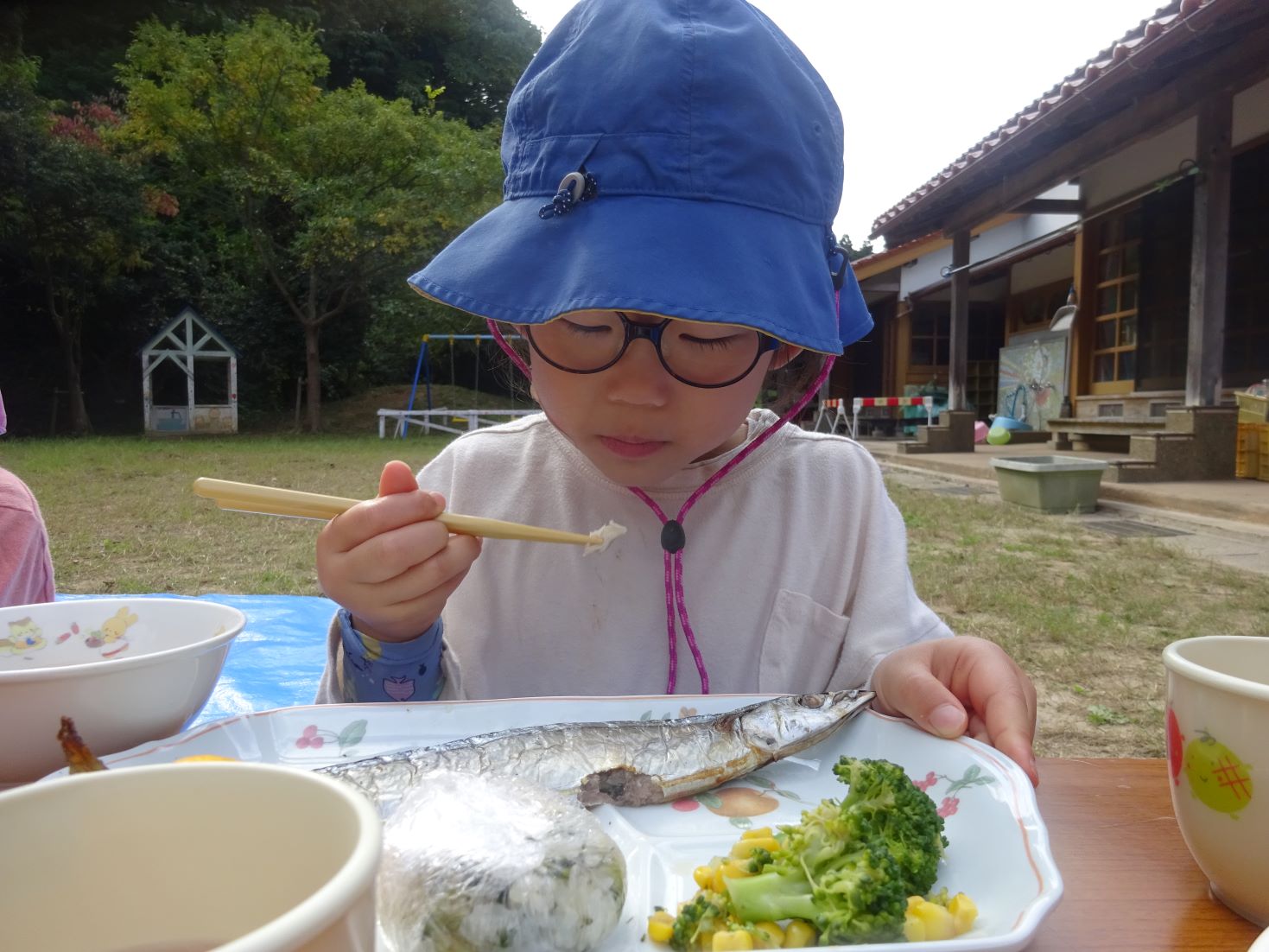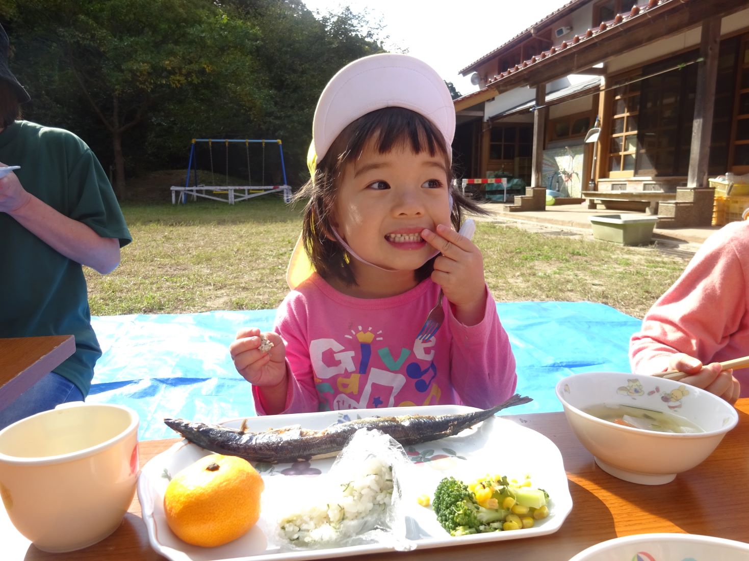 お芋とサンマが焼けるまで“わくわくの森”で元気いっぱいに遊んで、お腹がペコペコになりました。お昼は全員、所庭で食べました♪