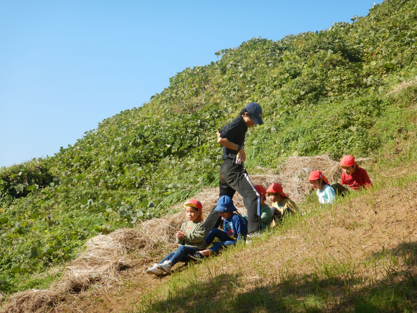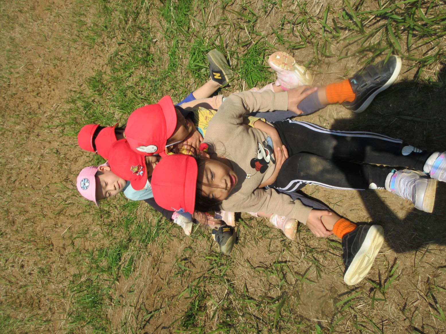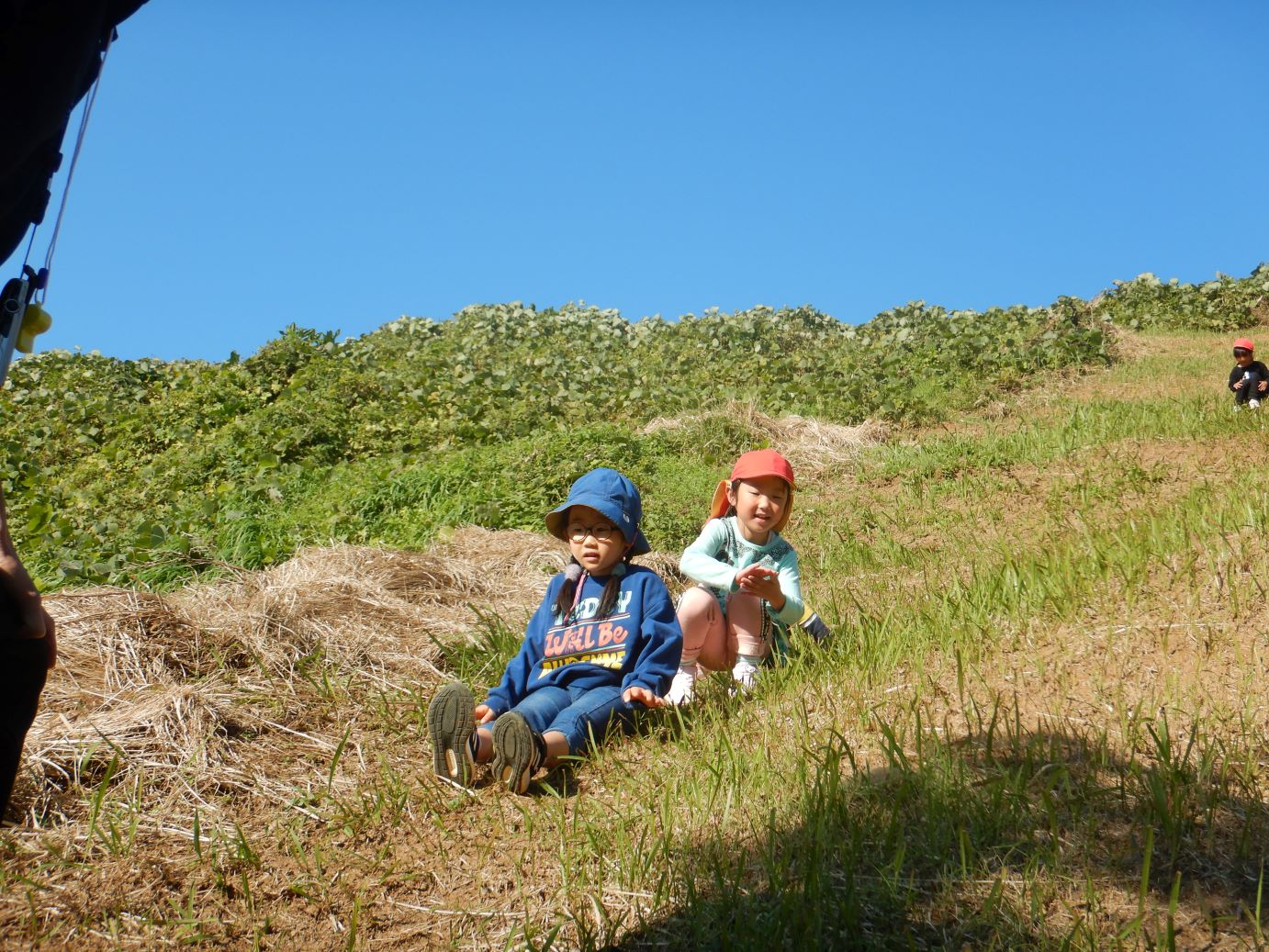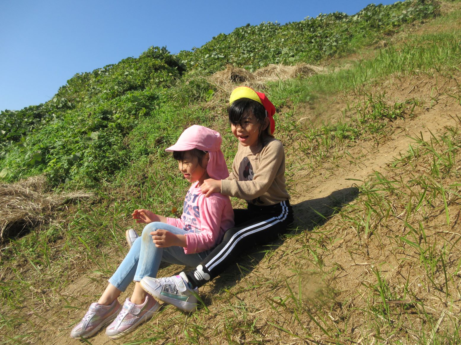 その後は早速、みんなでコロコロ斜面へ出掛けました♪コロコロ斜面では電車のように友達とつながって滑ったり、みんなで寝転んで青空を見たり、ツルでティアラを作ったりしました。それから、小波海水浴場に立ち寄ると、以前サップでお世話になった方がおられ、みんなで挨拶へ行きました。