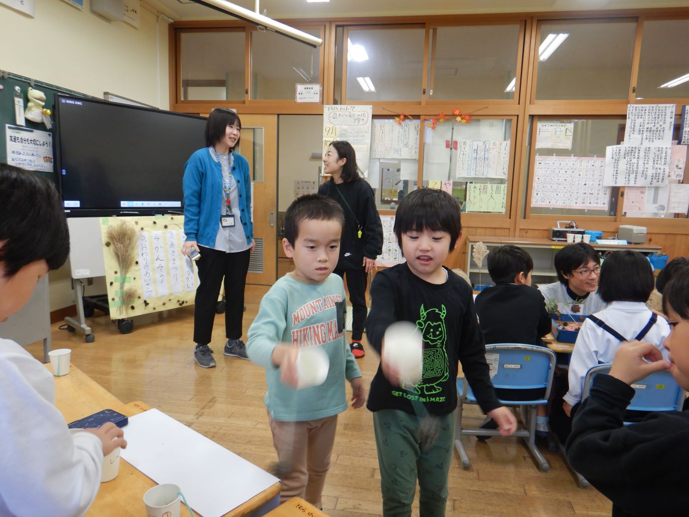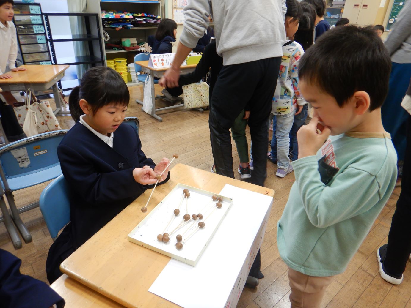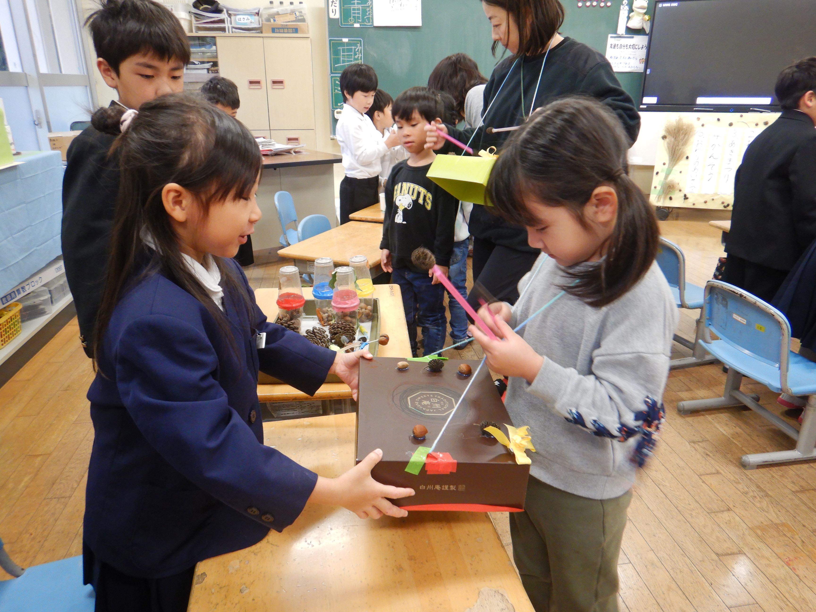 1年生の教室は,『一ねんじんじゃの あきまつり』と題し“なげてあそぶ まといれ”や“わくわくやじろべえと どんぐりごま” “あきのすてきな がっきやさん” “けんだま” “めいろちーむ”のすてきな遊びのコーナーができあがっていました。1年生から遊びの説明を受けると早速各コーナーへ行き、秋の自然物を利用したそれぞれの遊びを楽しみました。「(まといれ)ぼく 100てんのところに はいったよ」「(けんだま)いっかいで はいった‼」「このがっき もしていい?」など、目をキラキラさせて遊びました。