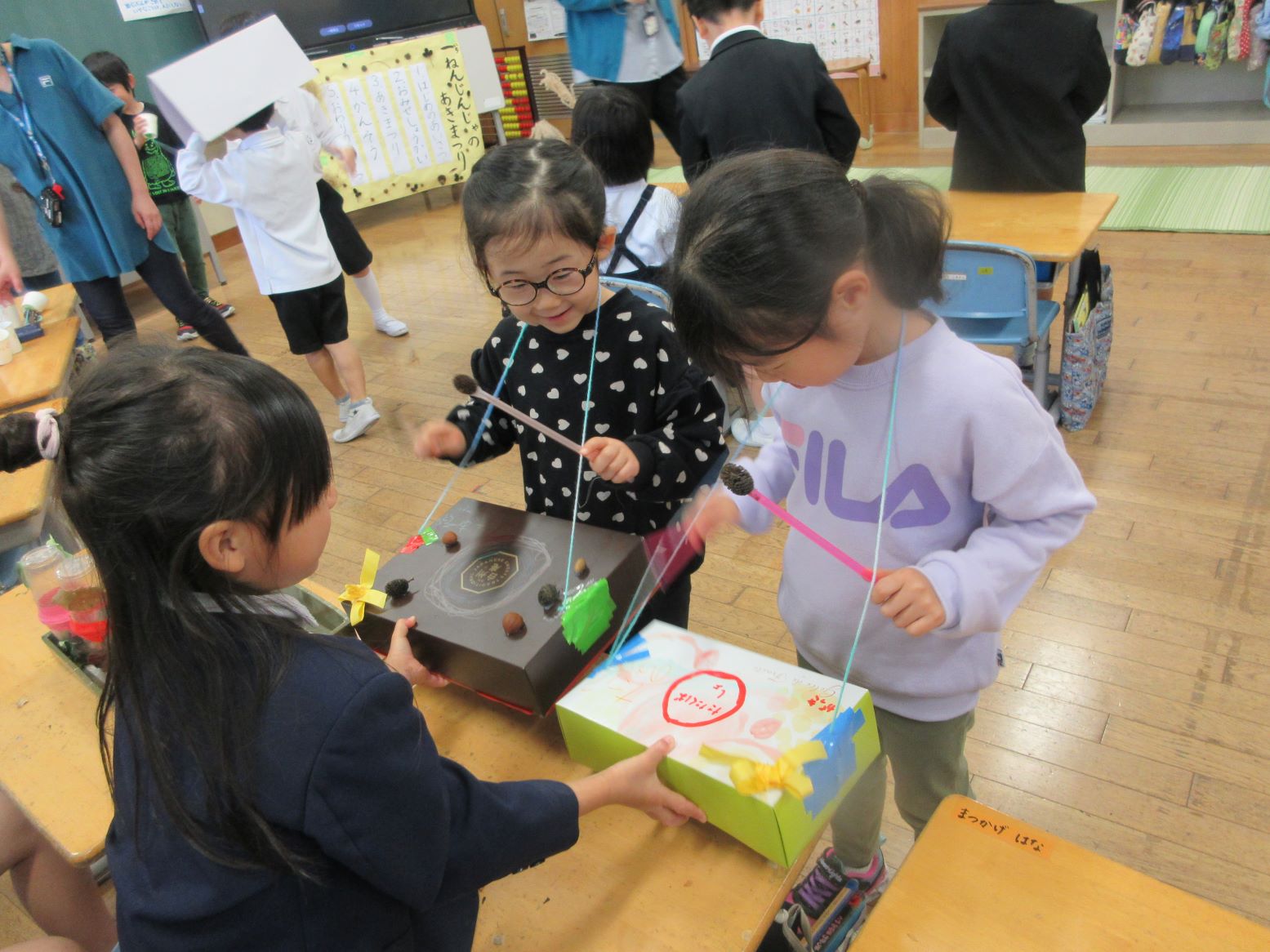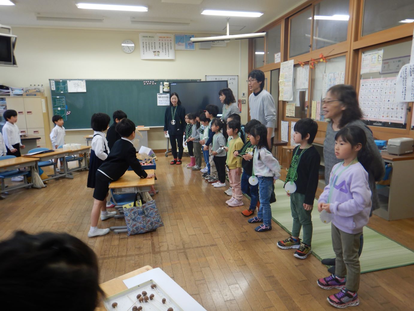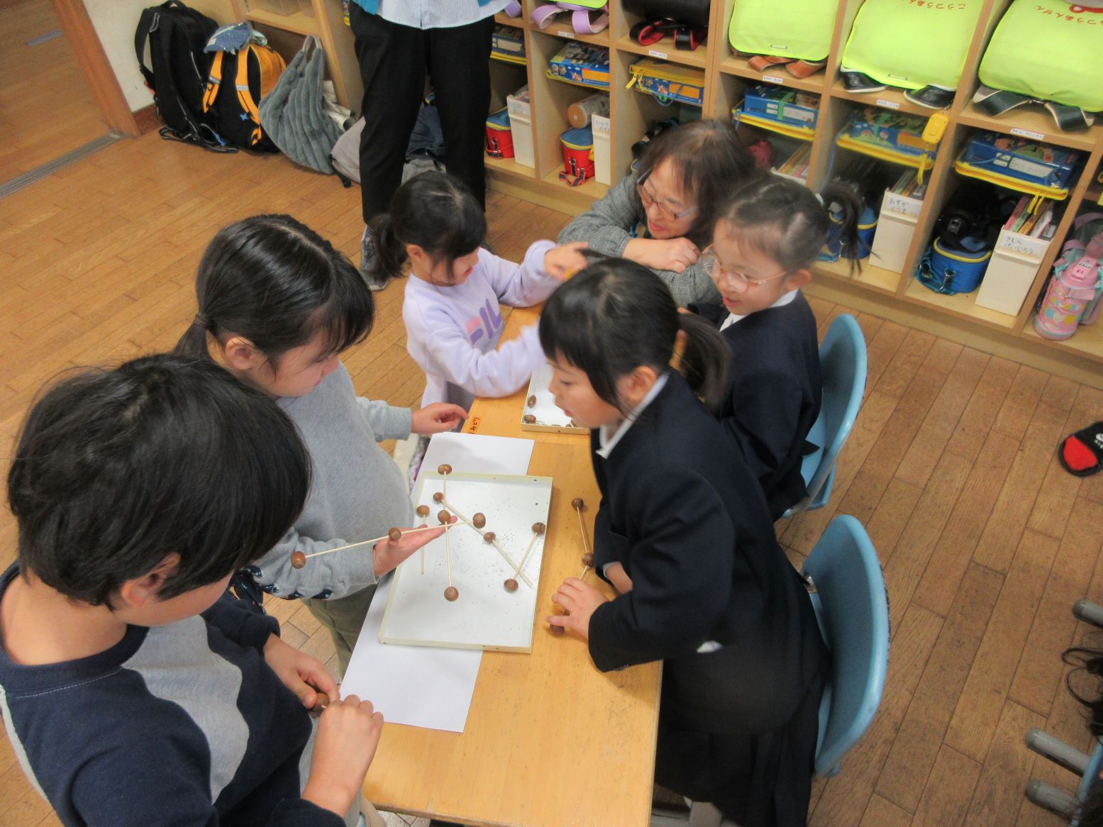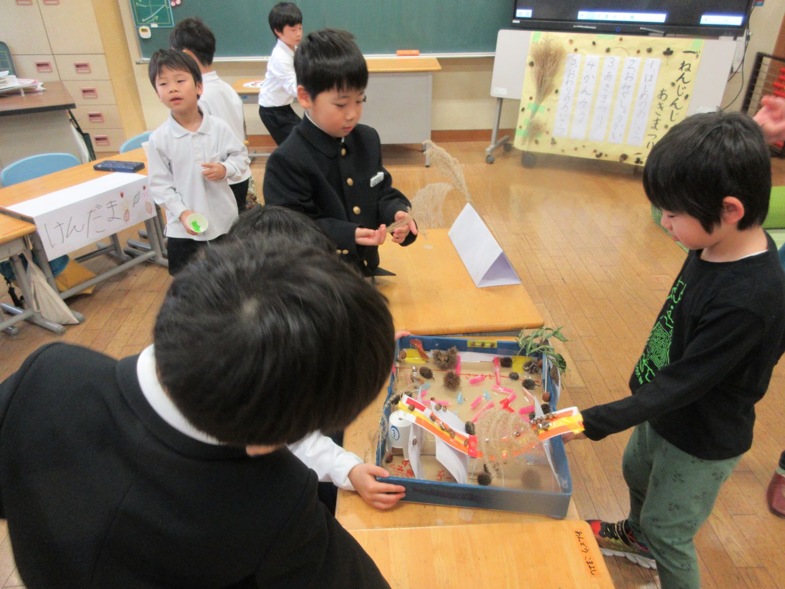 1年生の教室は,『一ねんじんじゃの あきまつり』と題し“なげてあそぶ まといれ”や“わくわくやじろべえと どんぐりごま” “あきのすてきな がっきやさん” “けんだま” “めいろちーむ”のすてきな遊びのコーナーができあがっていました。1年生から遊びの説明を受けると早速各コーナーへ行き、秋の自然物を利用したそれぞれの遊びを楽しみました。「(まといれ)ぼく 100てんのところに はいったよ」「(けんだま)いっかいで はいった‼」「このがっき もしていい?」など、目をキラキラさせて遊びました。