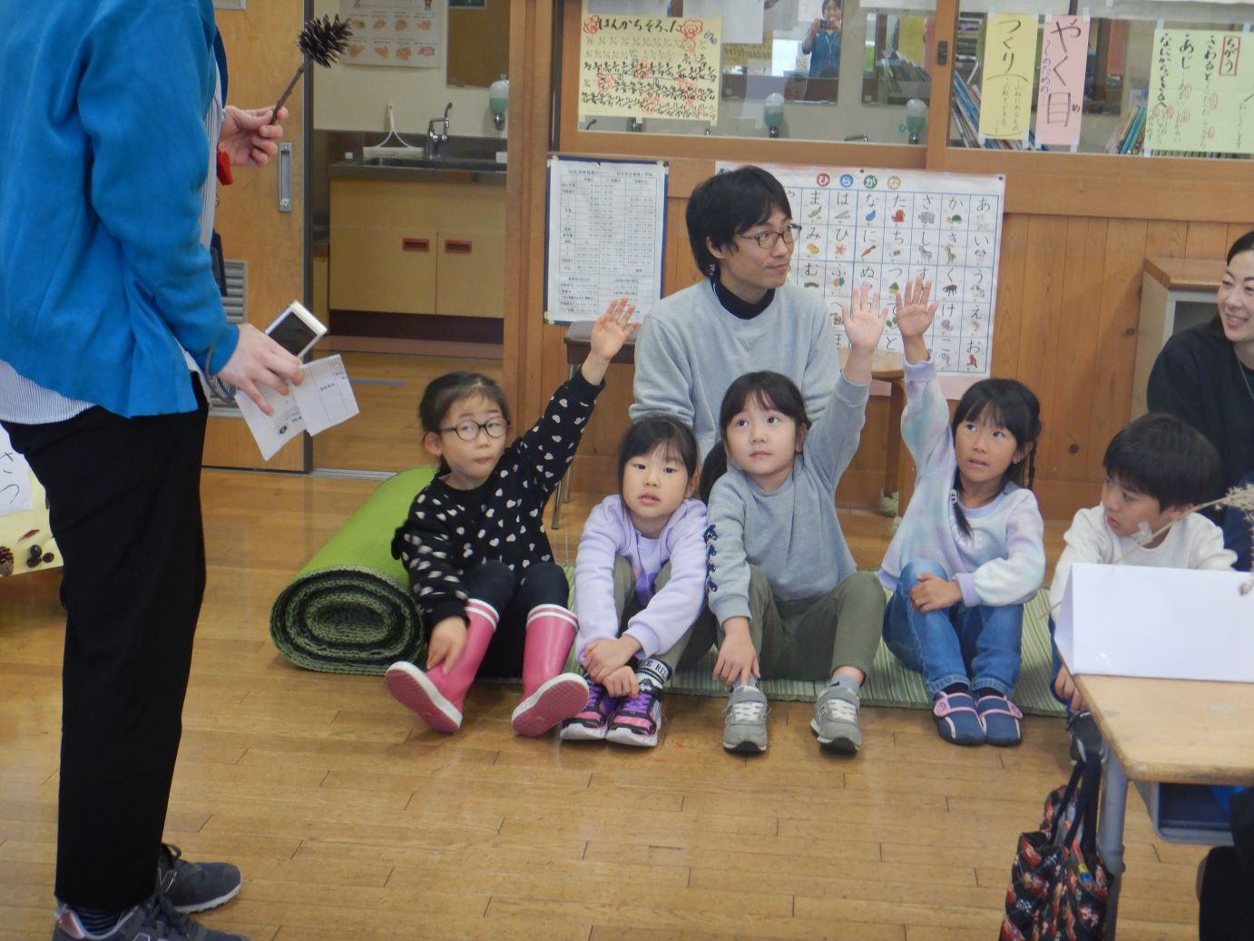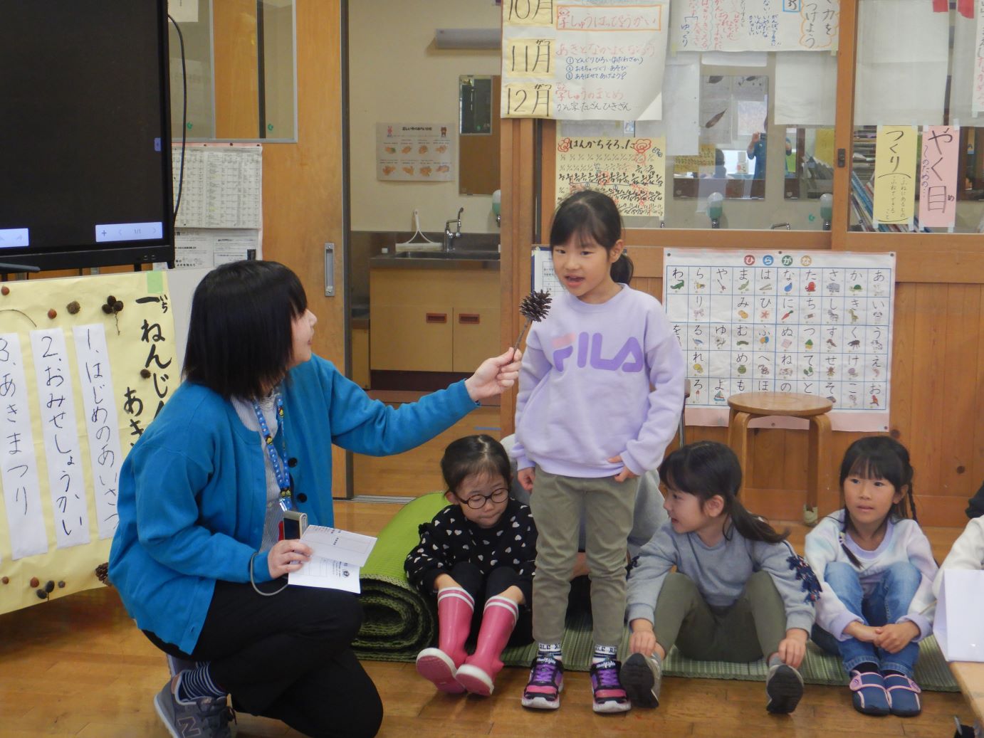 保育所のこども達が今日の遊びの感想を伝えると、小学校のお兄さん・お姉さん達が「笑顔で楽しんでくれて、嬉しかったです」と感想を返してくれました。わくわくする楽しい秋まつりに参加させていただき、とっても楽しい時間でした。